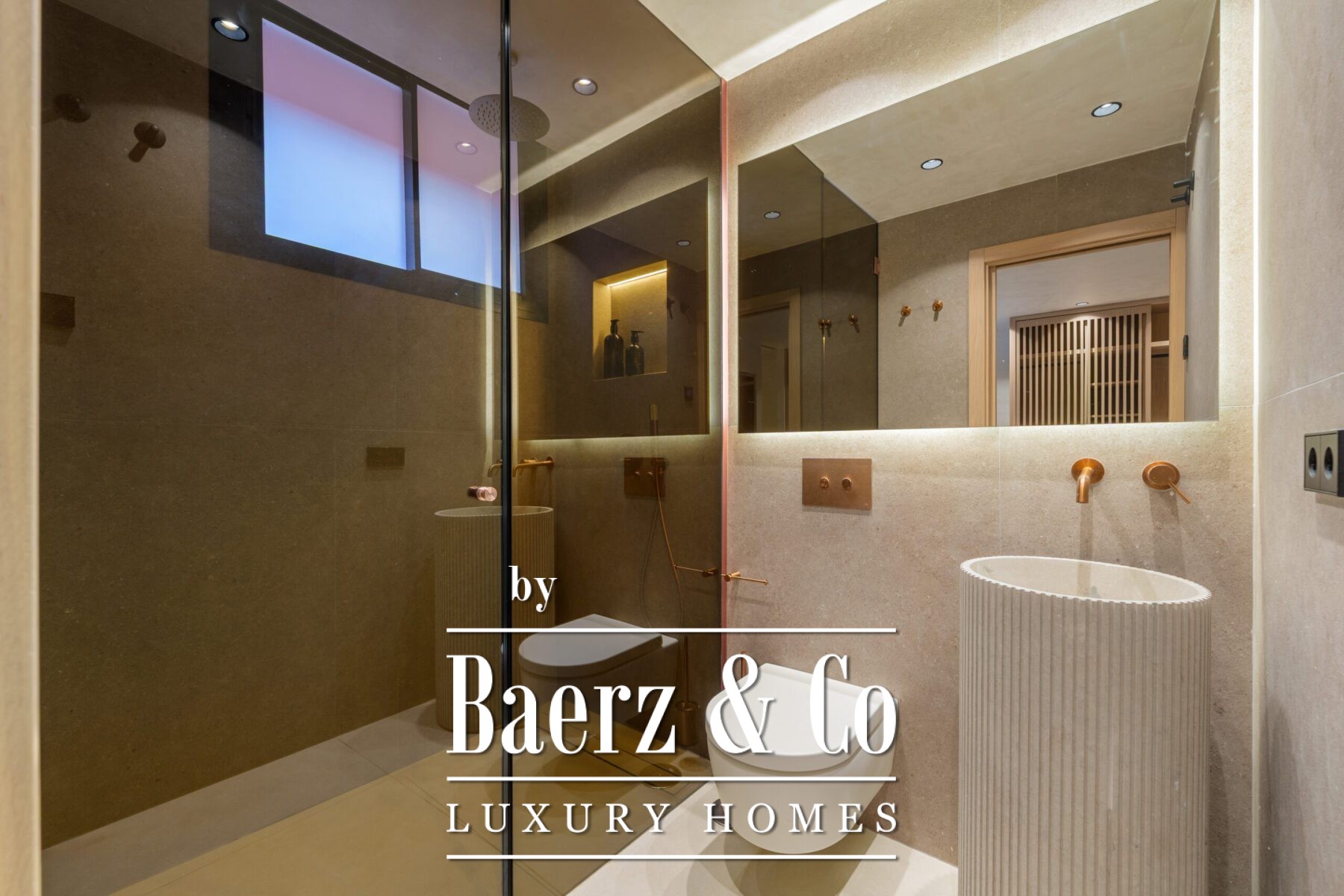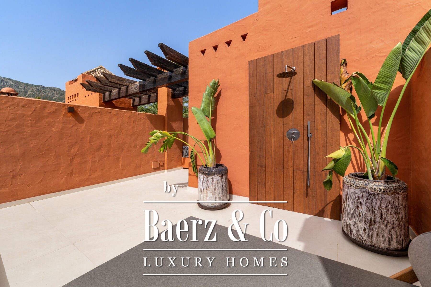 De bovenverdiepingen bieden ruime slaapkamers, waaronder een master suite met inloopkast en een en-suite badkamer die tot in detail is afgewerkt. Diverse terrassen verspreid over verschillende niveaus bieden keuzes voor rustige ochtenden of levendige avonden, met als absoluut hoogtepunt het dakterras, uitgerust met een ingebouwde BBQ, jacuzzi en panoramisch uitzicht over de berg- en tuinenlandschappen. Een eigen garage, 24-uurs beveiliging en hoogwaardige voorzieningen zoals airconditioning en vloerverwarming onderstrepen de toewijding aan comfort en gemak.