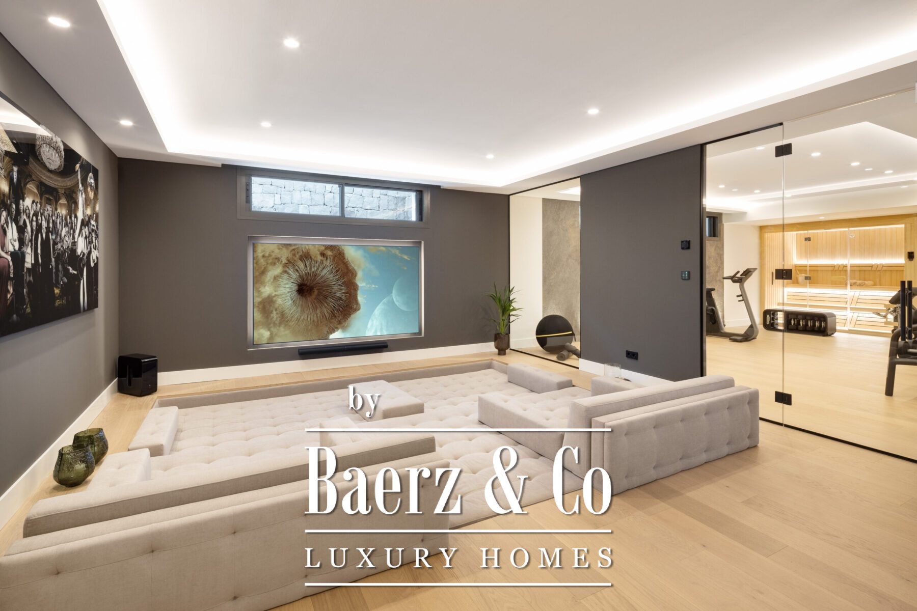 Half a level down, two additional bedrooms, each with en-suite bathrooms, provide ample space for family and guests. Entertainment and relaxation are at the heart. The basement hosts a vibrant social area featuring a bar, cinema, pool table, and wine bodega, complemented by a gym and sauna for wellness activities. This level also includes a beautifully appointed guest suite, enhancing the villa’s capacity to host friends and family in sublime comfort.