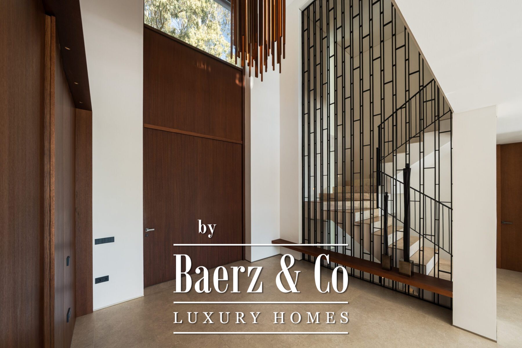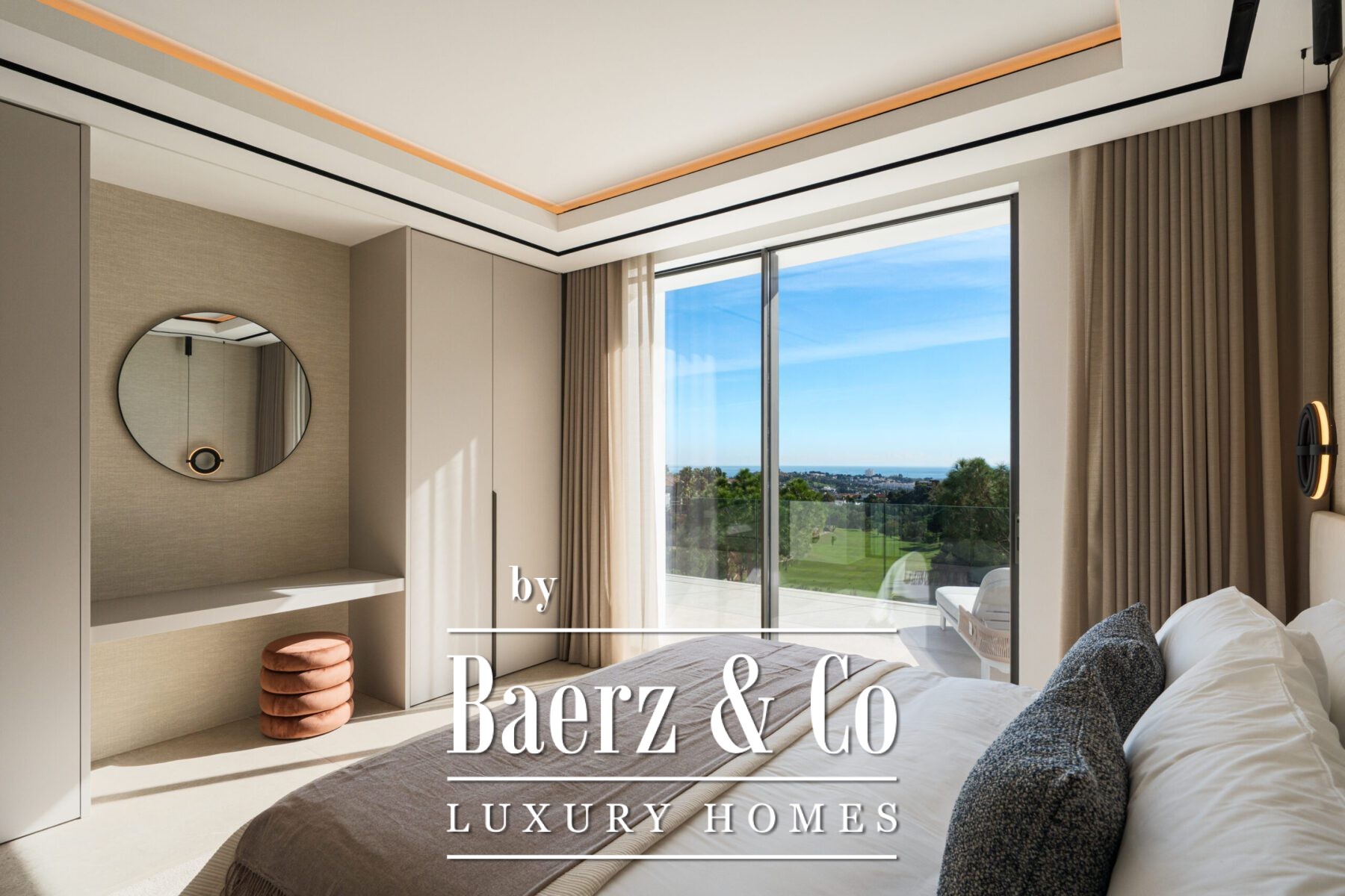 Binnen biedt het pand zes slaapkamers en zeven badkamers, verbonden door exclusief meubilair en natuurlijke, verfijnde materialen. De interieurs worden gekenmerkt door symmetrie en een naadloze overgang van binnen naar buiten. Grote schuifpanelen en royale raampartijen laten het licht en het landschap overvloedig binnenstromen, terwijl geïntegreerde verlichting en zorgvuldig gekozen texturen zorgen voor een sfeer van ingetogen verfijning.