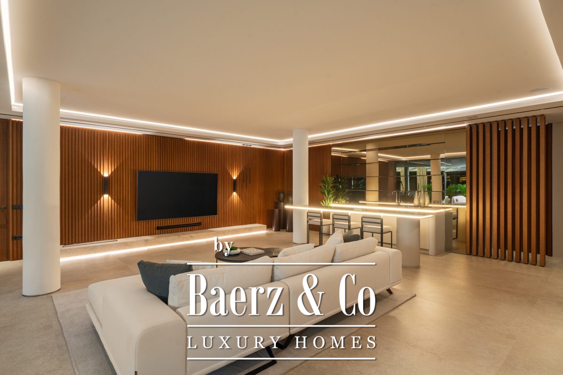 Wellness en recreatie krijgen vorm op het lagere niveau, waar een op maat gemaakte entertainmentruimte, bar, privéfitness, spa met binnenzwembad en sauna de ervaring compleet maken. Beveiligde garage met laadpunt voor elektrische auto's verhoogt het wooncomfort nog verder. Deze frontline golfvilla in Marbella geldt als het toonbeeld van ingetogen luxe, design en privacy aan de Costa del Sol.