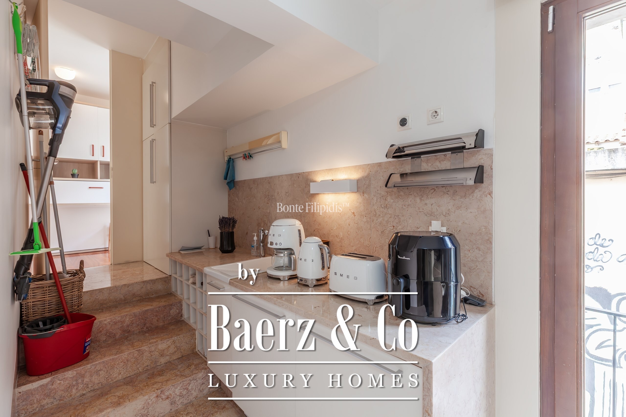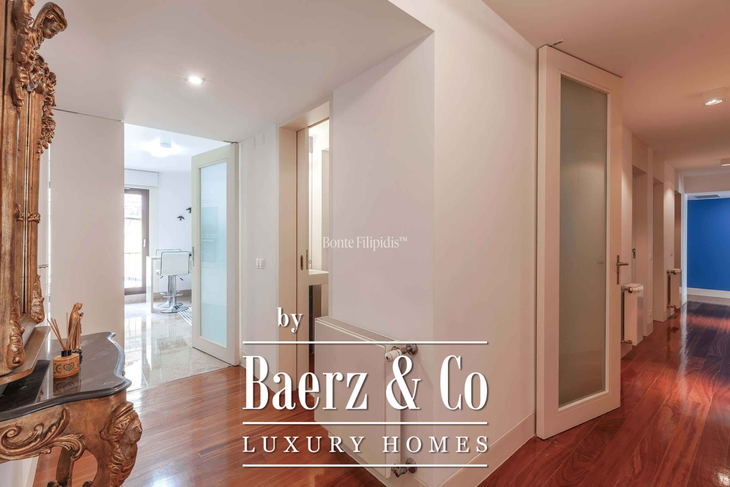 De keuken, badend in het zuidwestelijke licht, is uitgerust met SMEG- en Siemens-apparatuur, Lioz kalksteen en volop bergruimte, voor dagelijks gemak en gastvrijheid bij uitstek. Afzelia houten vloeren, eigentijdse badkamers en centrale verwarming onderstrepen de ingetogen klasse van deze woning. Het appartement wordt grotendeels gemeubileerd aangeboden en ondersteunt daarmee een zorgeloze verhuizing.