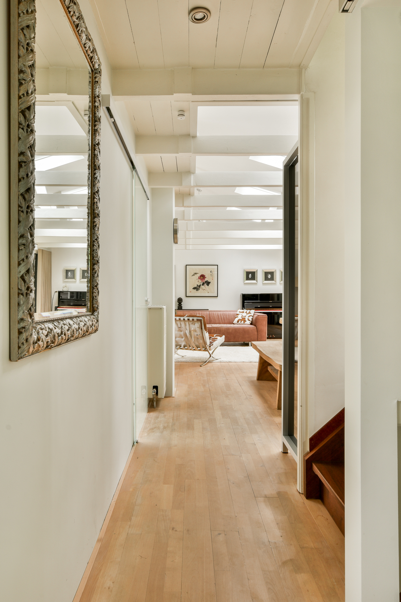 De woning heeft een speelse indeling over meerdere niveaus. Op het hoofdniveau bevindt zich de moderne badkamer met inloopdouche, wastafel en toilet. Via een trap bereikt u de mezzanine, ideaal als werkplek, en de hoofdslaapkamer, voorzien van airconditioning en een rustgevend uitzicht op het omliggende groen en water.