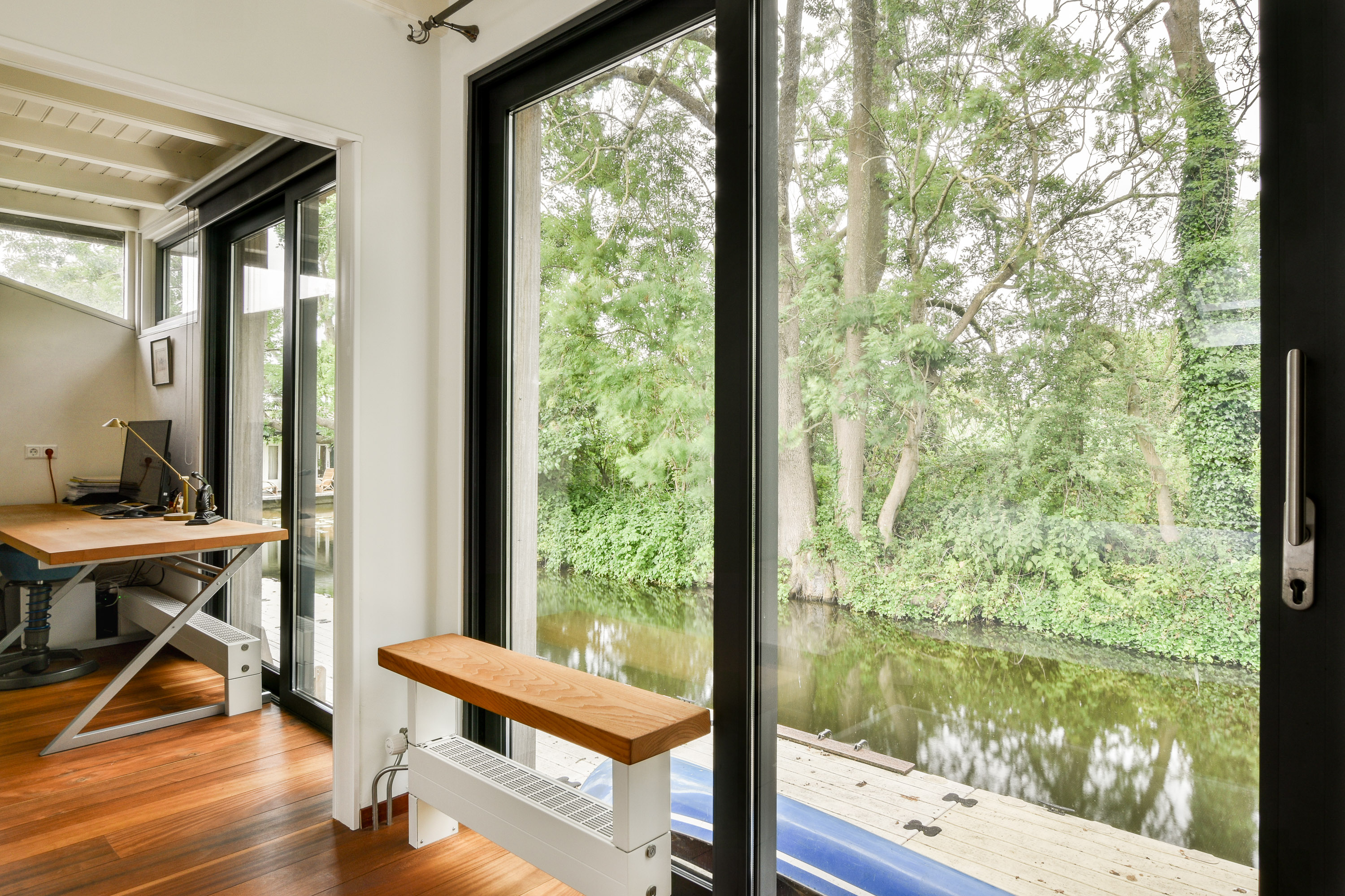 De woonkamer vormt het hart van de woning en beschikt over een massief beukenhouten vloer, een open haard en een grote glazen schuifpui naar het drijvende terras. Hier lopen binnen en buiten moeiteloos in elkaar over en geniet u van de rust van het water, het hele jaar door.