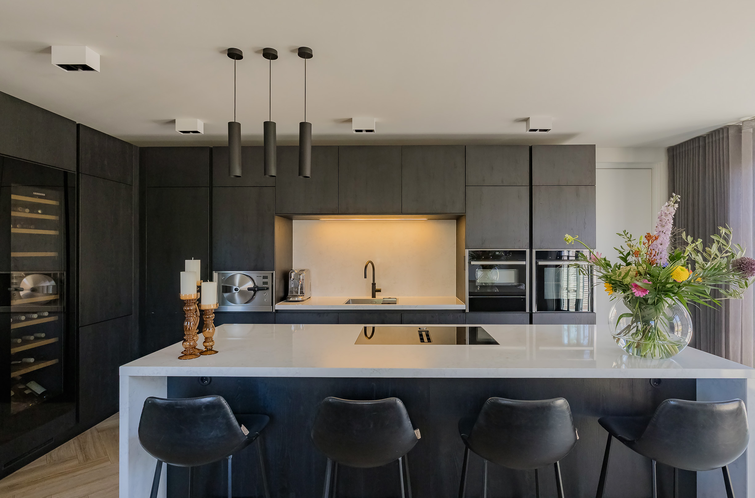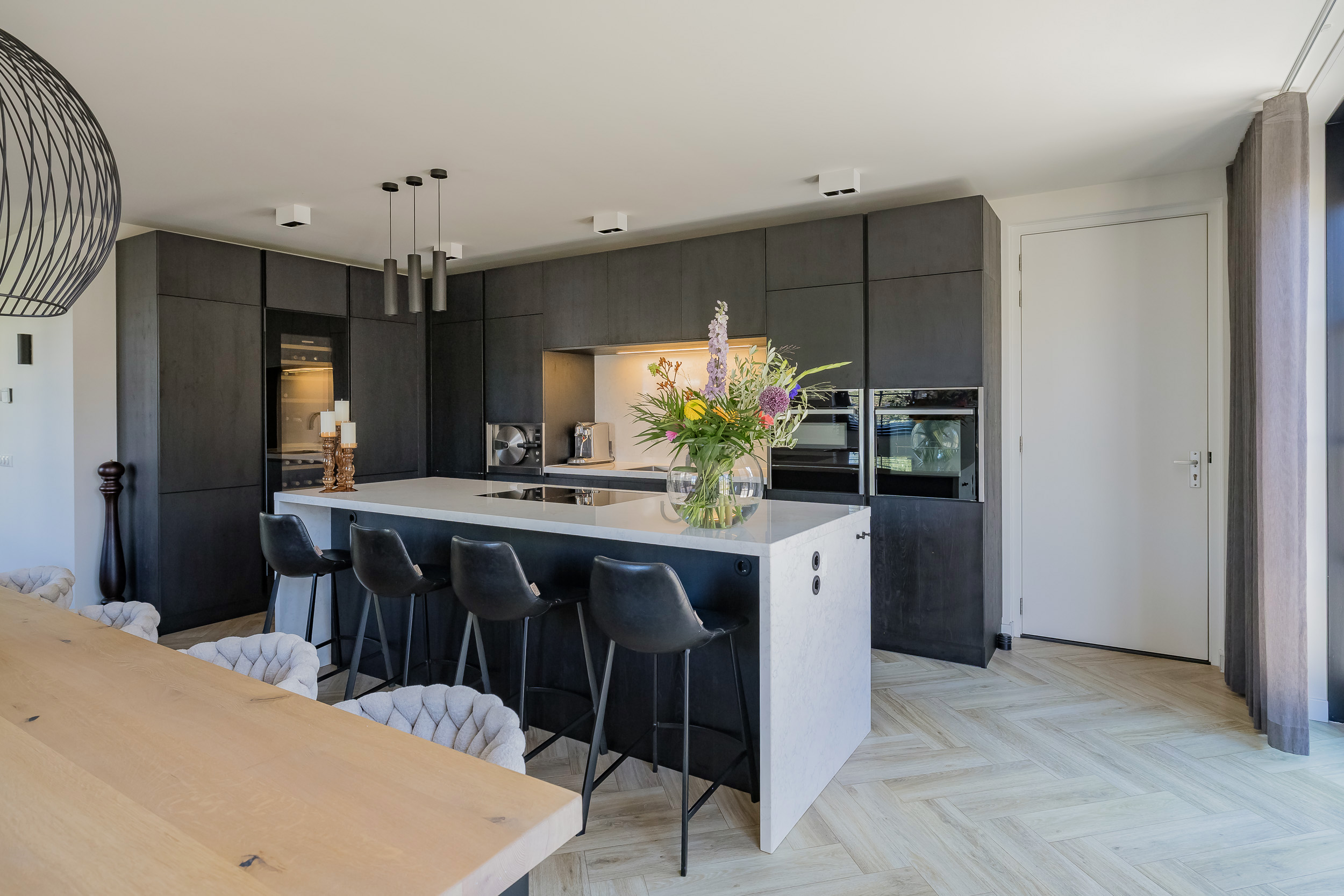 In de hal, met garderobekast en gastentoilet, geven stalen deuren toegang tot de ruime, zeer lichte woonkamer met fraai wandmeubel en een grote erker. Aan de achterzijde van de woning is de ruime woonkeuken met kookeiland gesitueerd - perfect om samen te komen met familie en vrienden. Twee paar openslaande deuren naar de tuin maken dat binnen en buiten moeiteloos in elkaar overlopen. Dankzij de vloerverwarming geniet je hier het hele jaar door van een behagelijke temperatuur.