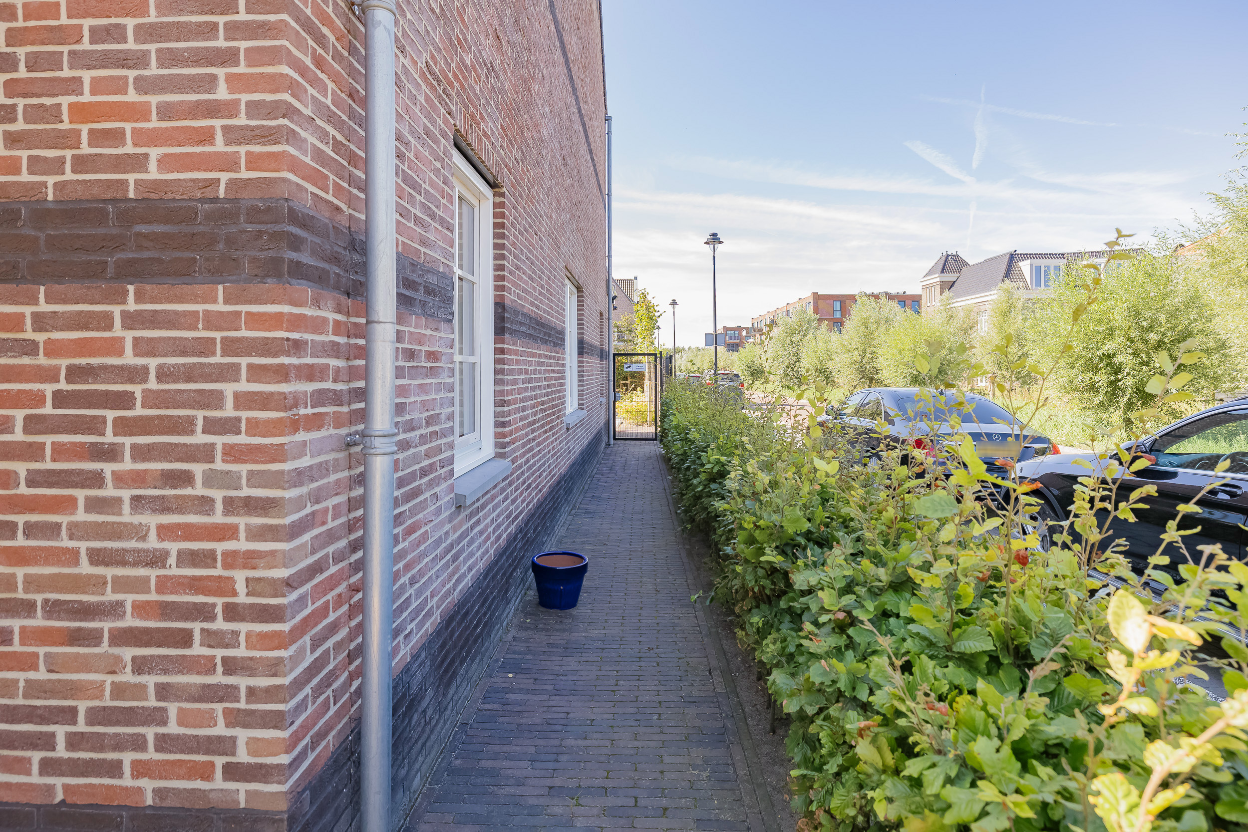Voor de garage is er parkeergelegenheid op eigen terrein en tevens is er een oplaadpunt voor de elektrische auto. De beukenhaag zorgt voor een sfeervolle tuinafscheiding.