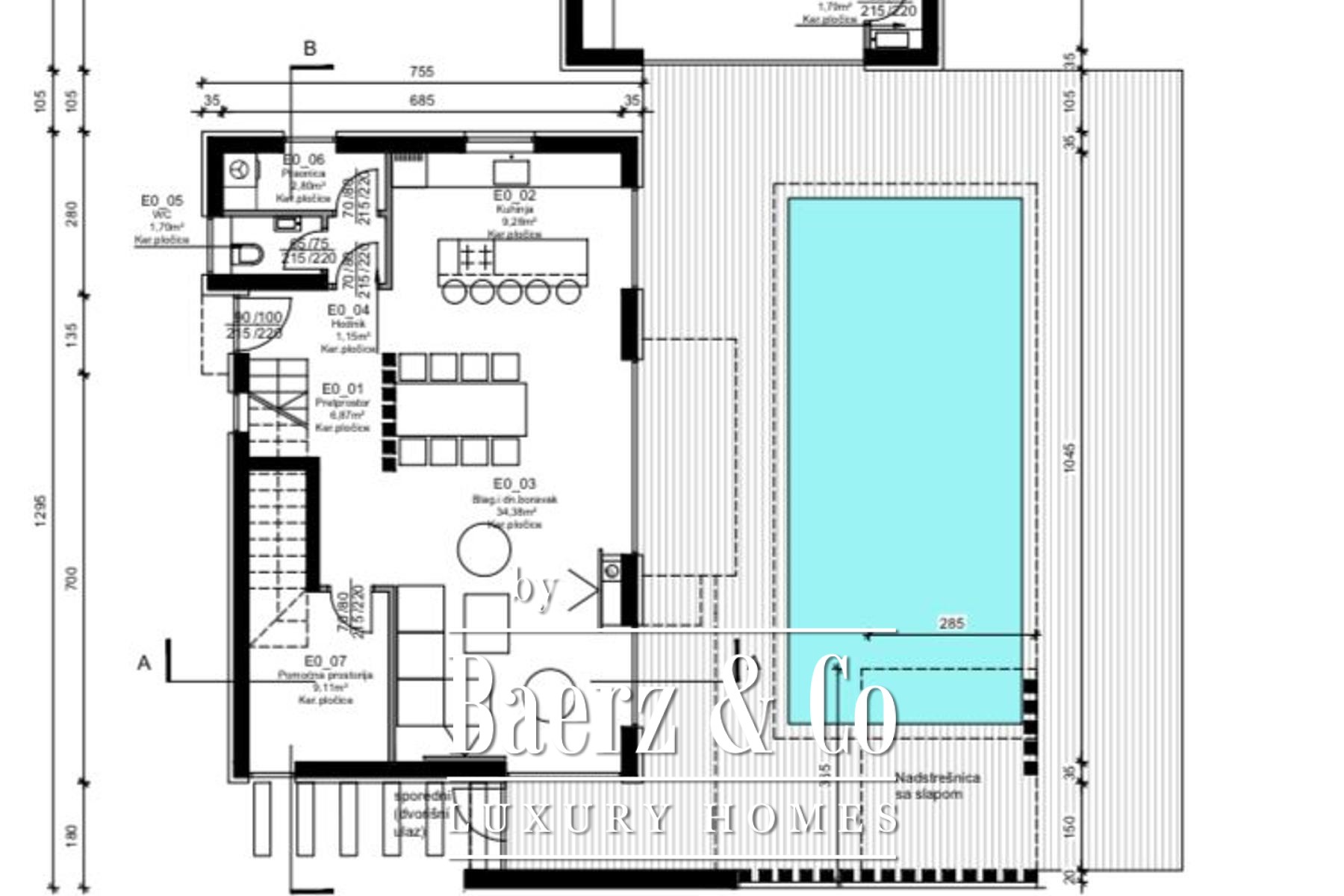 Op de begane grond vindt u een open leefruimte die naadloos aansluit op een moderne, volledig uitgeruste keuken. Door de royale raampartijen valt het licht volop binnen, en via de directe toegang bereikt u het zwembad en de fraai aangelegde tuin. Een aparte bijkeuken en een extra badkamer op dit niveau tonen de zorgvuldige aandacht voor het dagelijks leven.