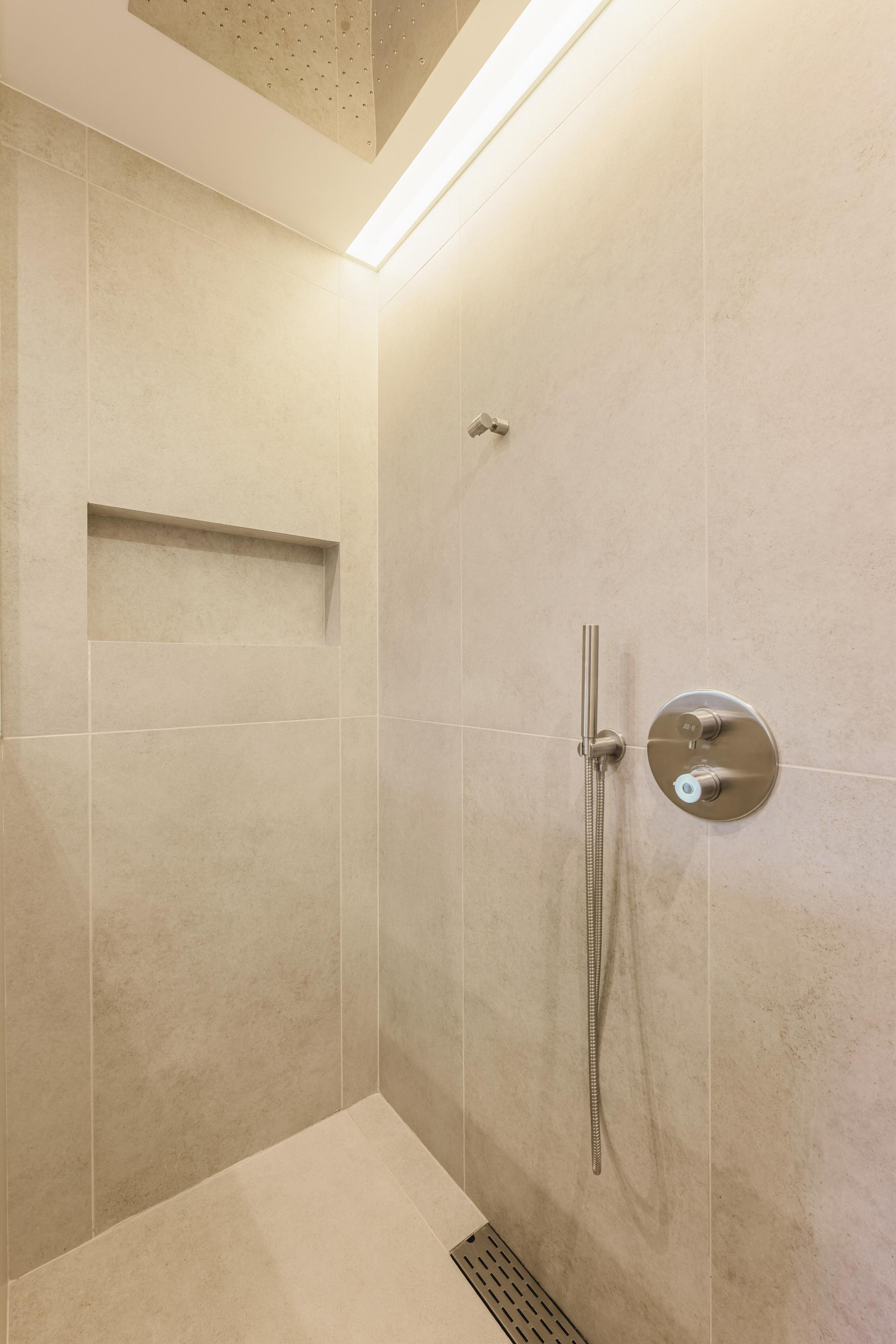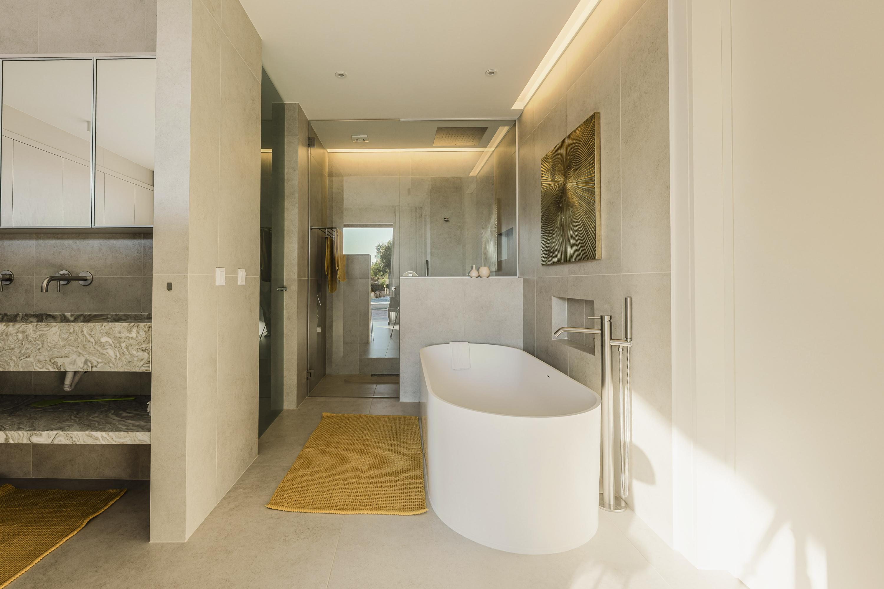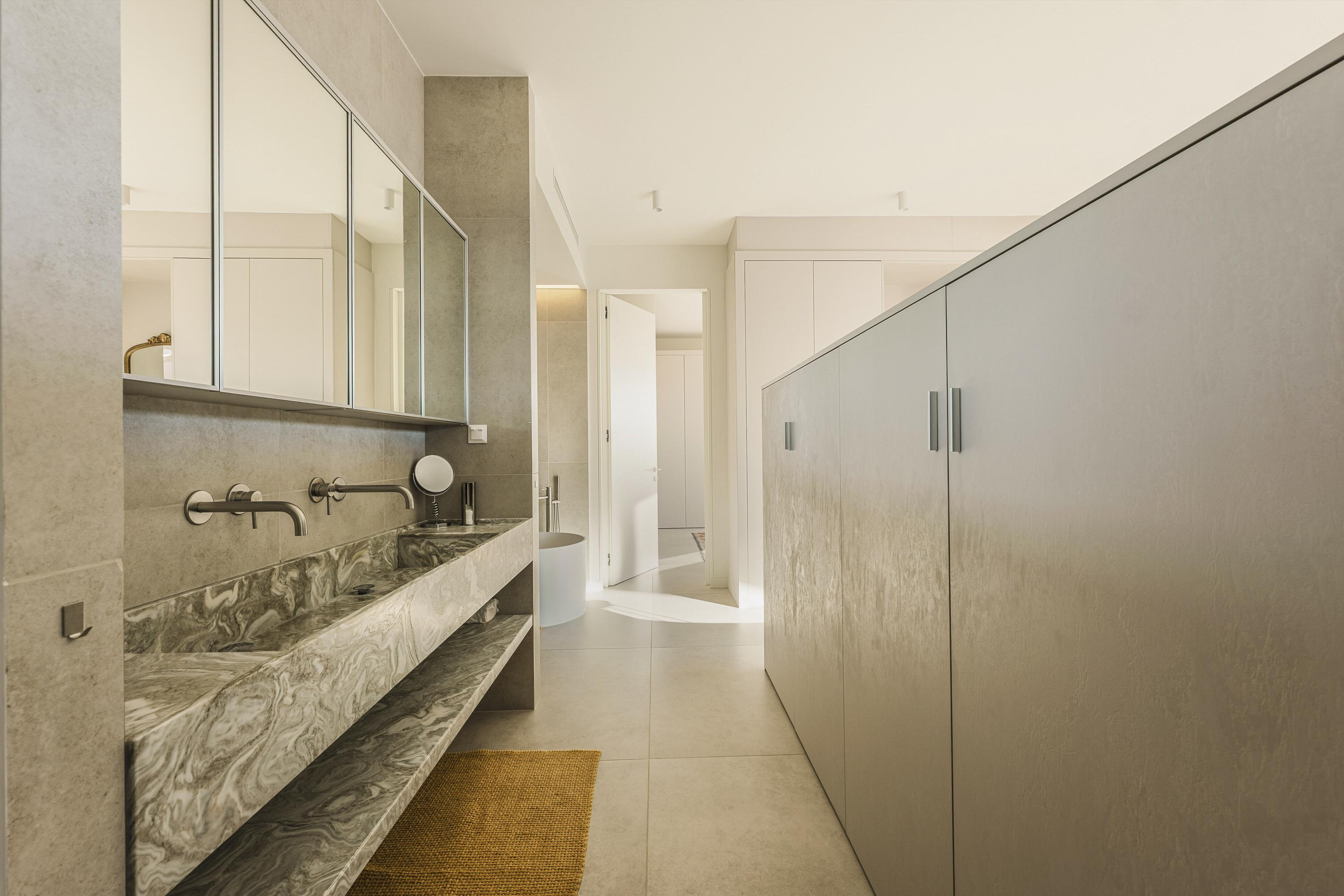 Een serene retreat met oceaanlicht en vloerverwarming. En-suite badkamer met marmeren dubbele wastafel, vrijstaand bad, inloop regendouche, bidet en toilet. Inclusief walk-in closet en aparte schoenenkast.