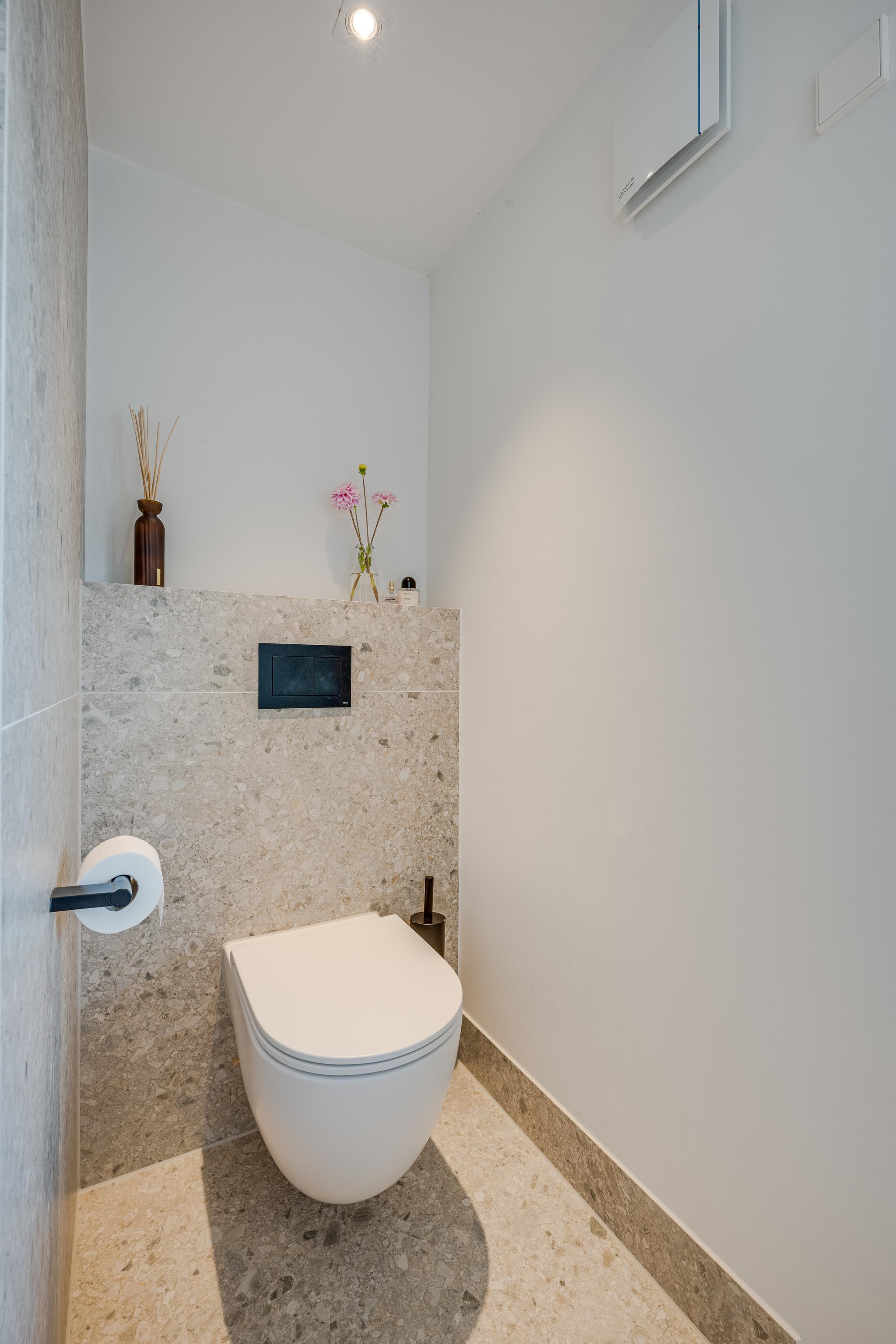 Aan de achterzijde van de woning ligt een royale slaapkamer met deur naar de tuin en een moderne badkamer en-suite met wastafel, douche en toilet; ideaal voor gasten of een au-pair.