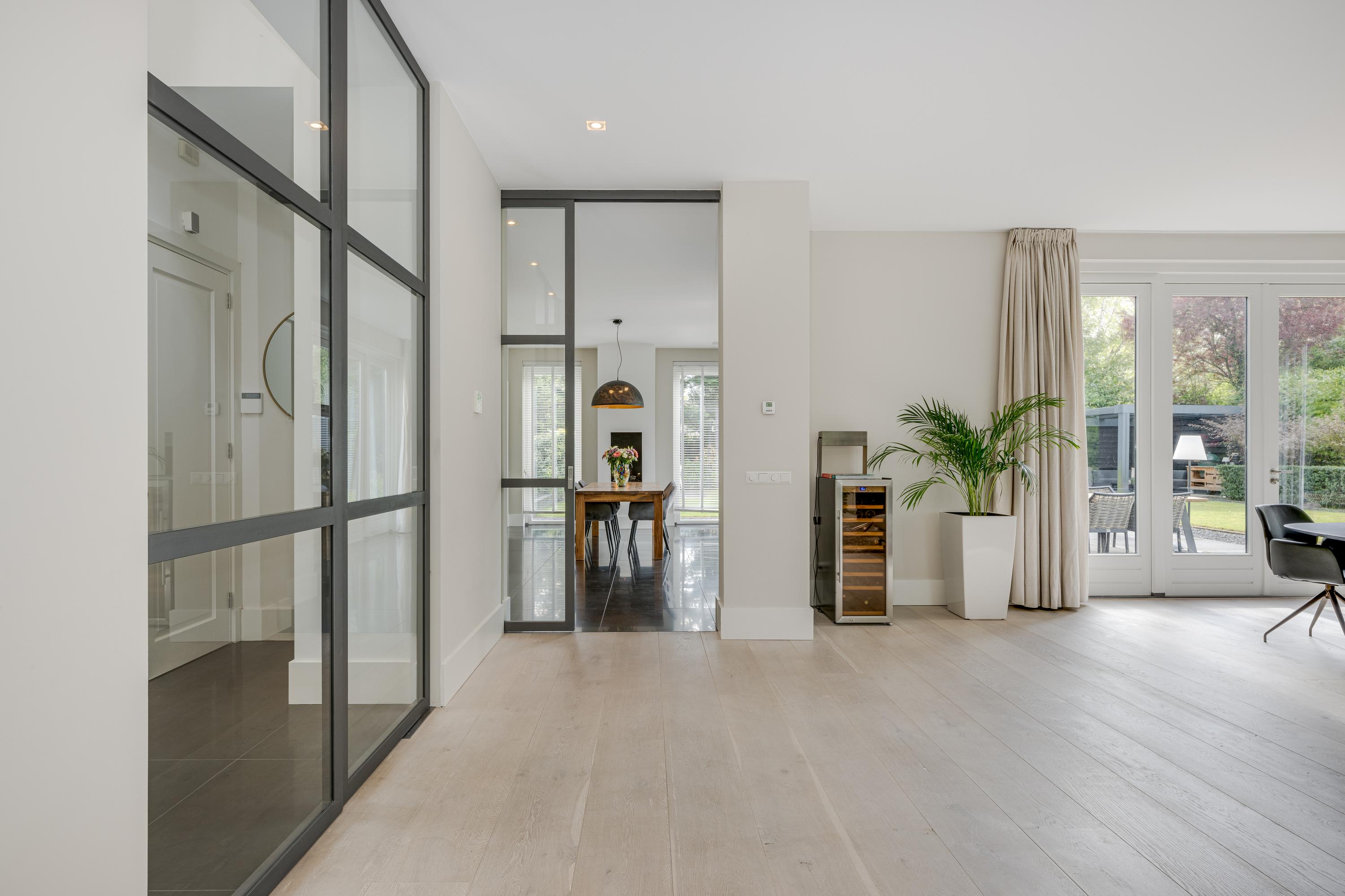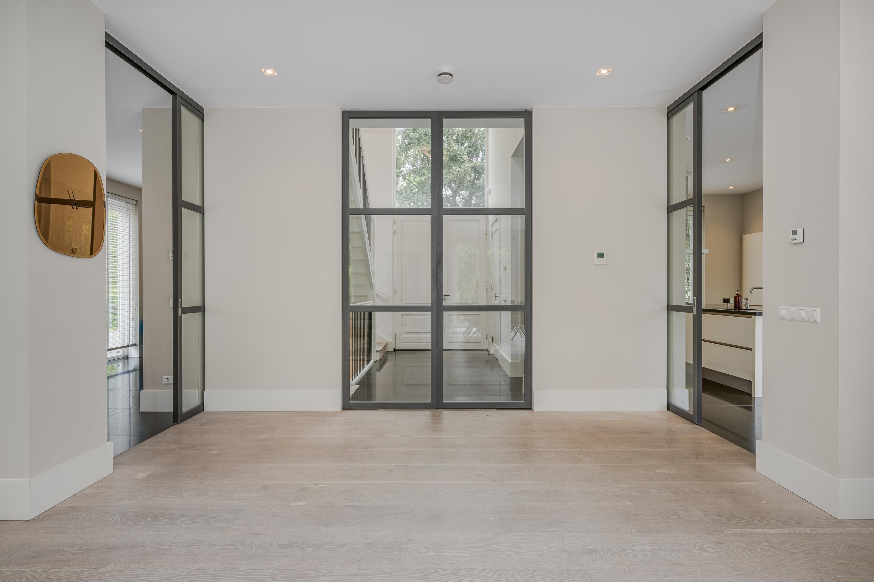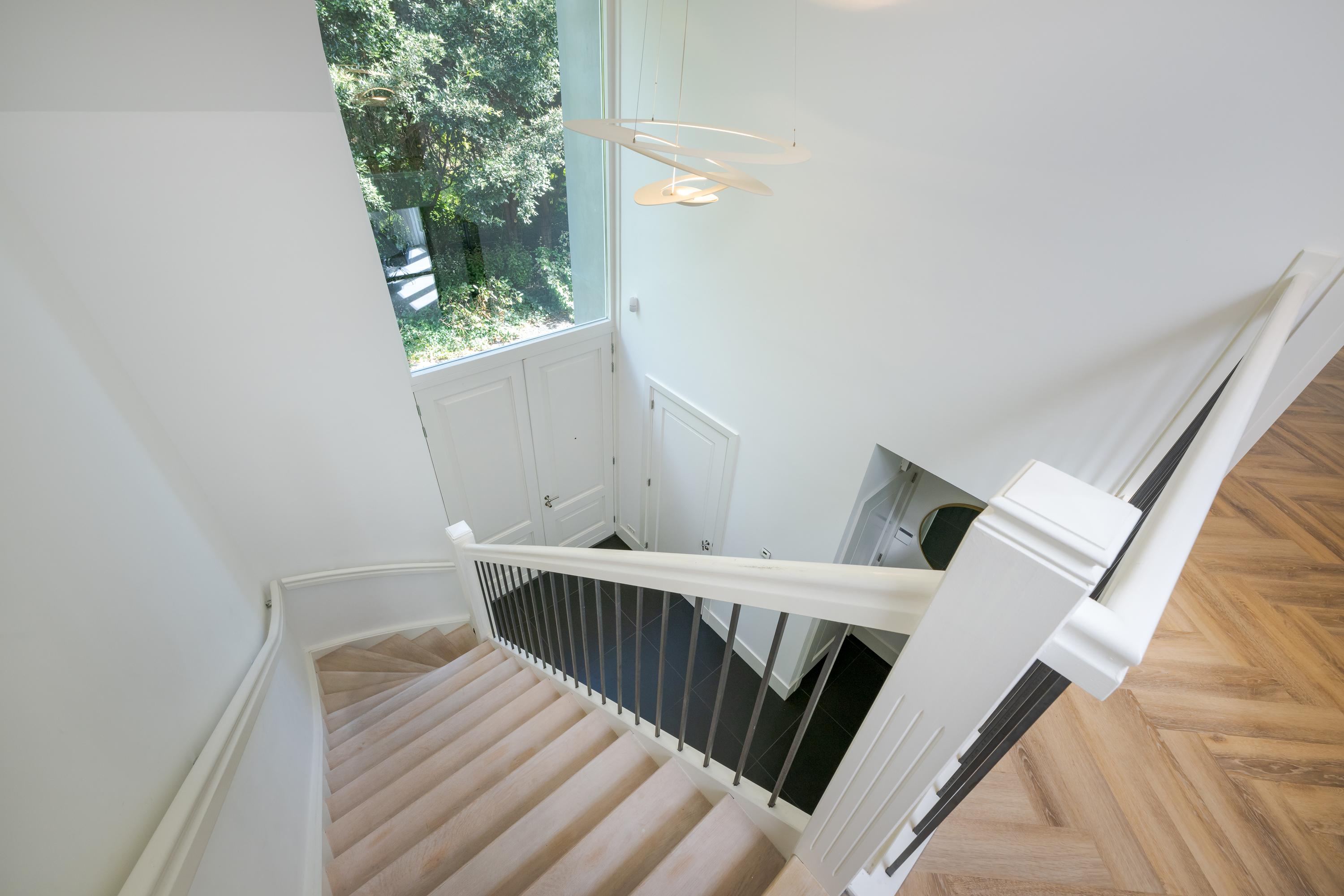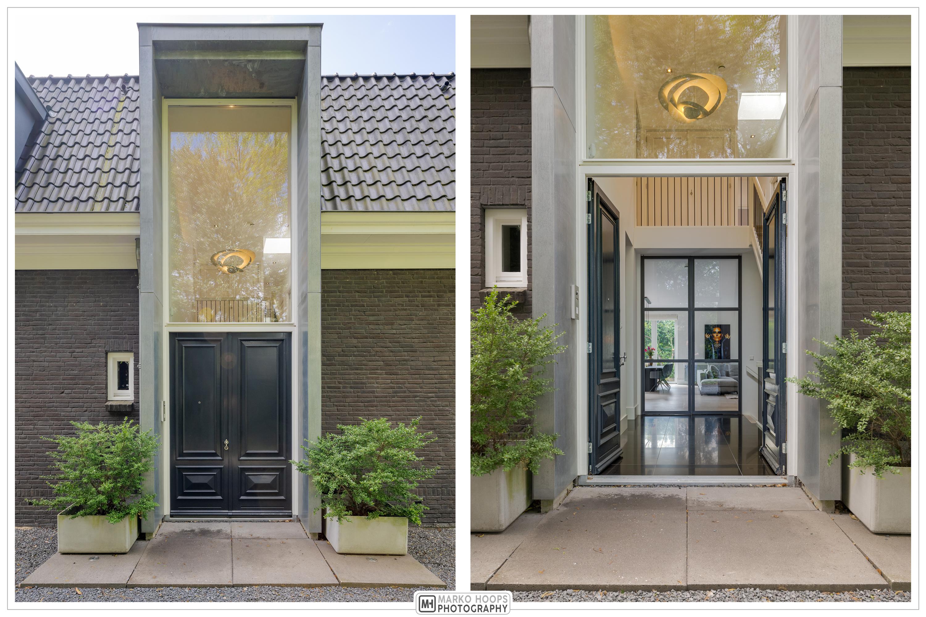 Het bordes met dubbele entreedeur geeft toegang tot de ruime hal waarin centraal het trappenhuis en vide zijn gesitueerd. In de hal vindt u tevens de wc voor de gasten, een ruime garderobe en de meterkast. Ook bevindt zich hier de trap die leidt naar de kelder en de bordestrap naar de bovengelegen verdieping. De dubbele glazen deuren bieden een doorkijk naar de moderne woonkamer.