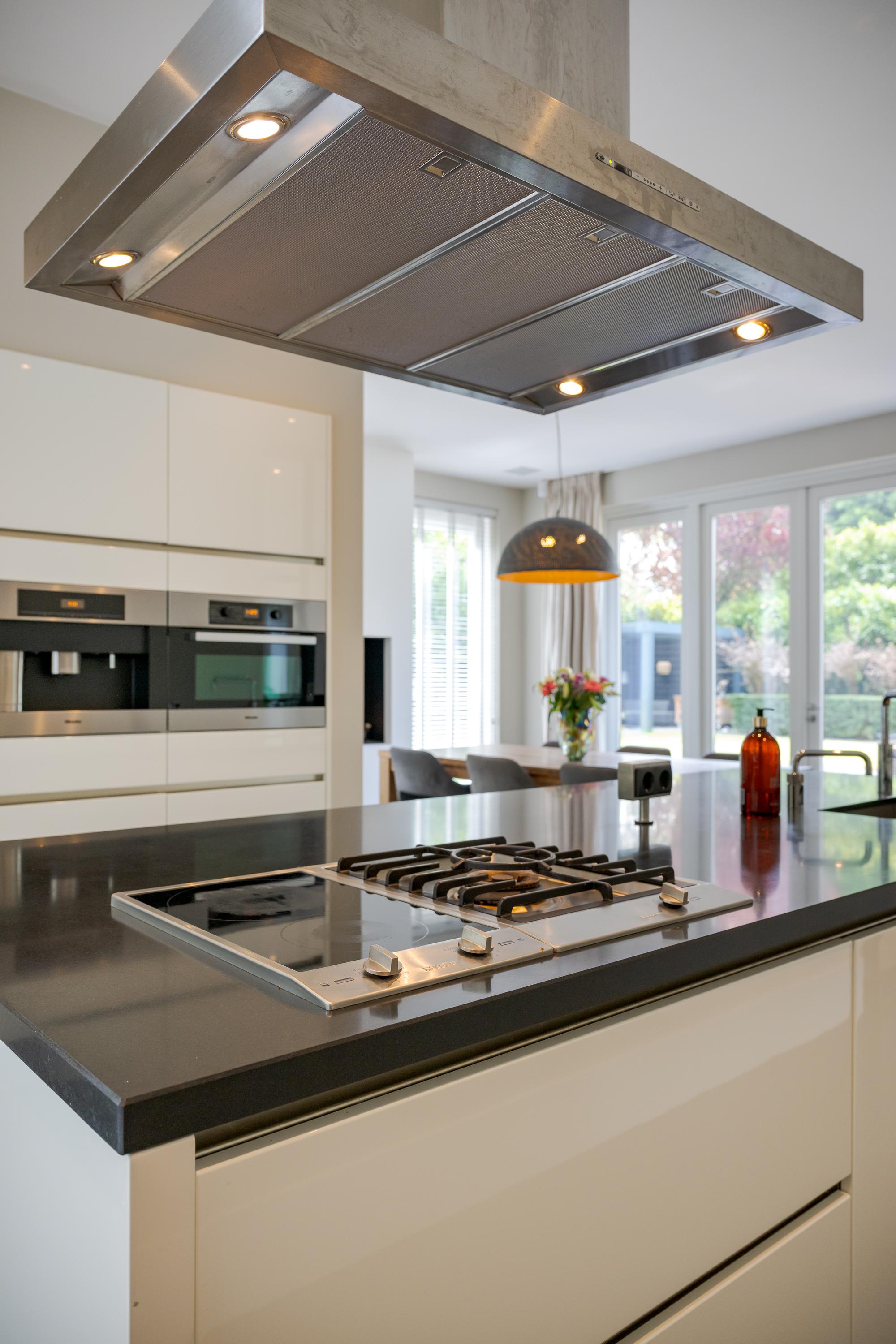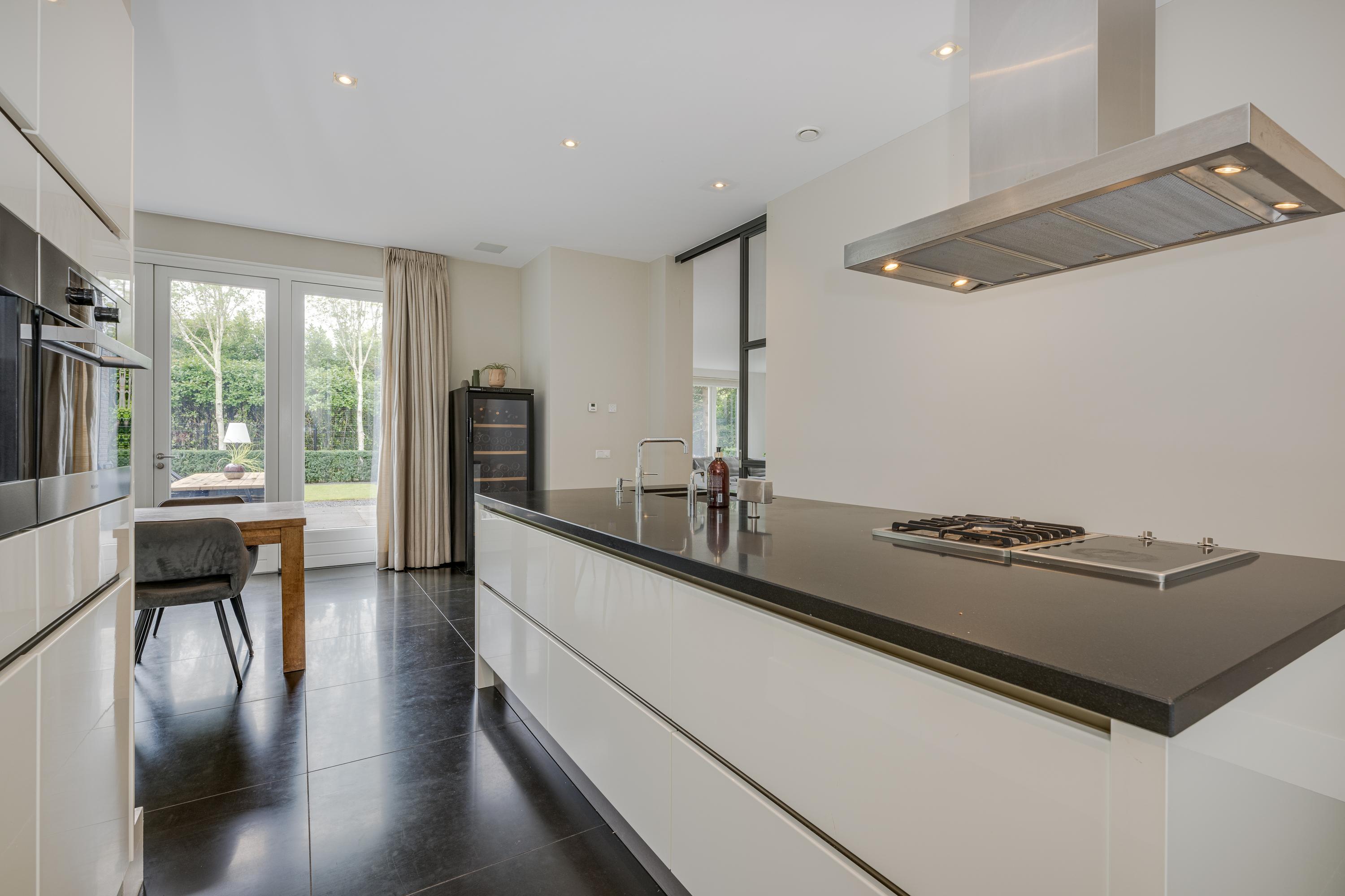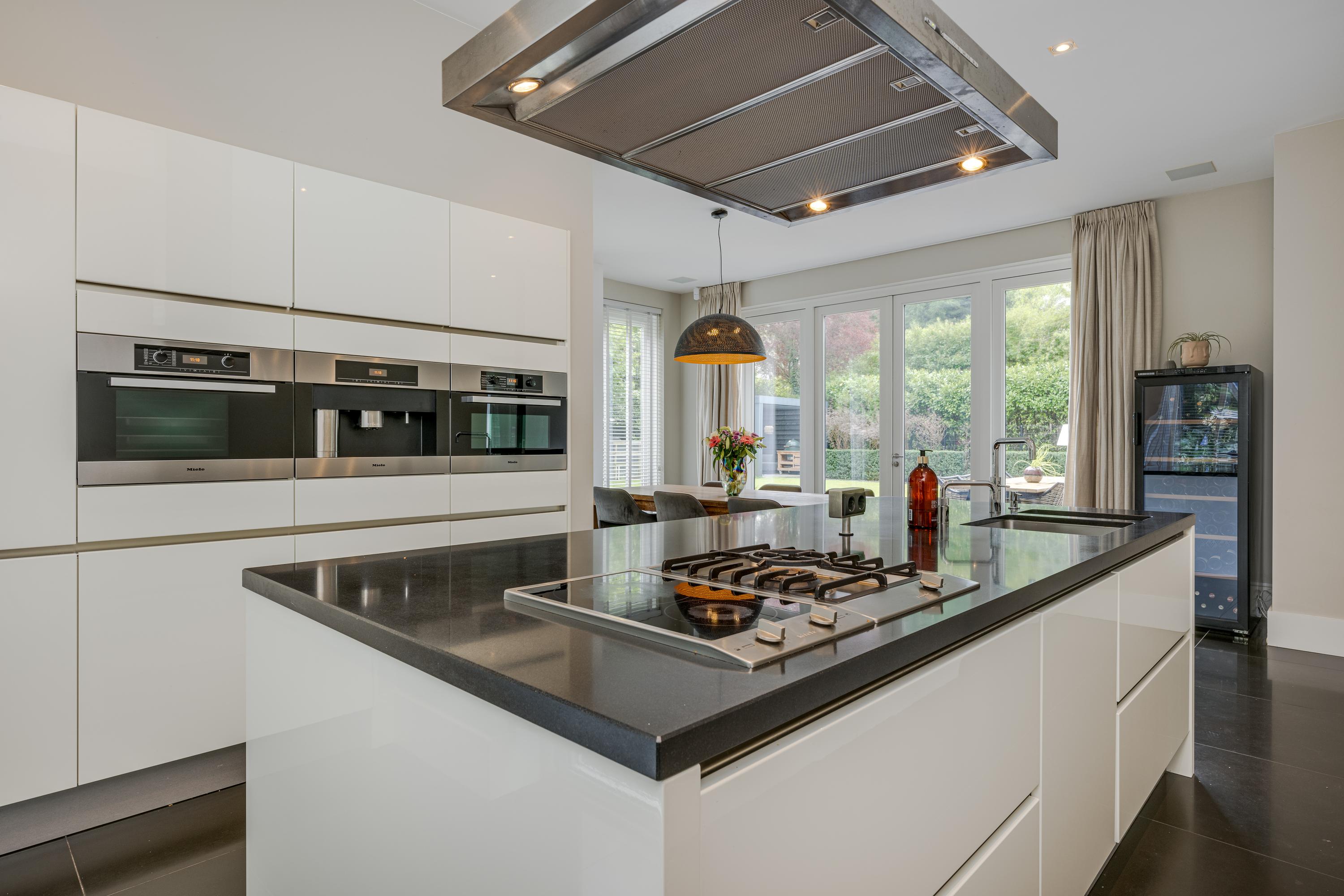 De moderne keuken is voorzien van alle wenselijke apparatuur, waarbij het kookeiland beschikt over een dubbele spoelbak, vaatwasser, ijskast en een kookplaat op gas én inductie. De hoge wand biedt ruimte aan de stoomoven, combimagnetronoven en het koffieapparaat. Naast koken biedt de keuken ruimte aan een zeer royale eettafel met een gezellige gasgestookte haard. De dubbele openslaande deuren geven vanuit de keuken toegang tot het ruime terras. Naast de keuken bevindt zich de bijkeuken, voorzien van een gootsteen, veel vaste kastruimte en een deur naar de tuin.
