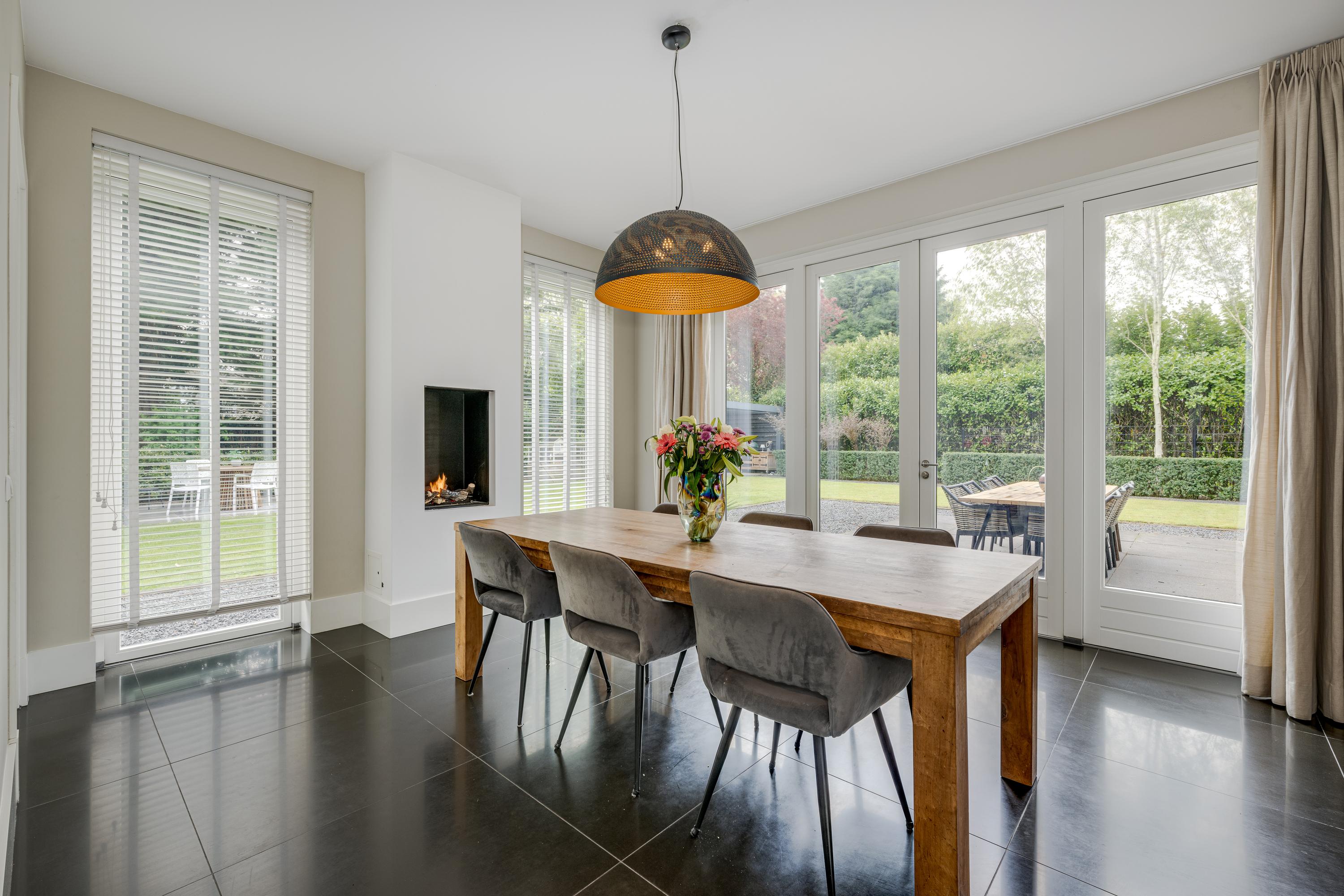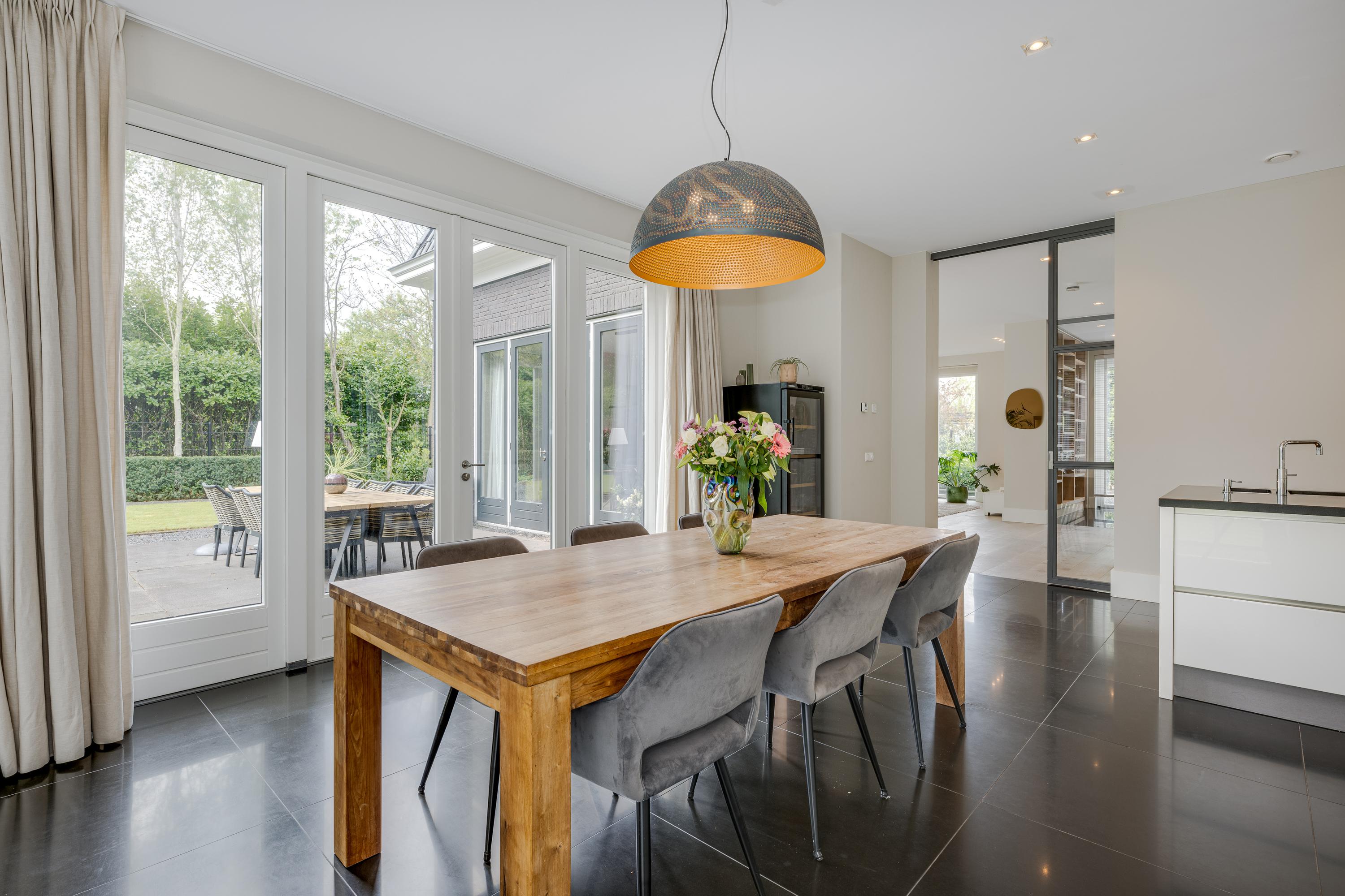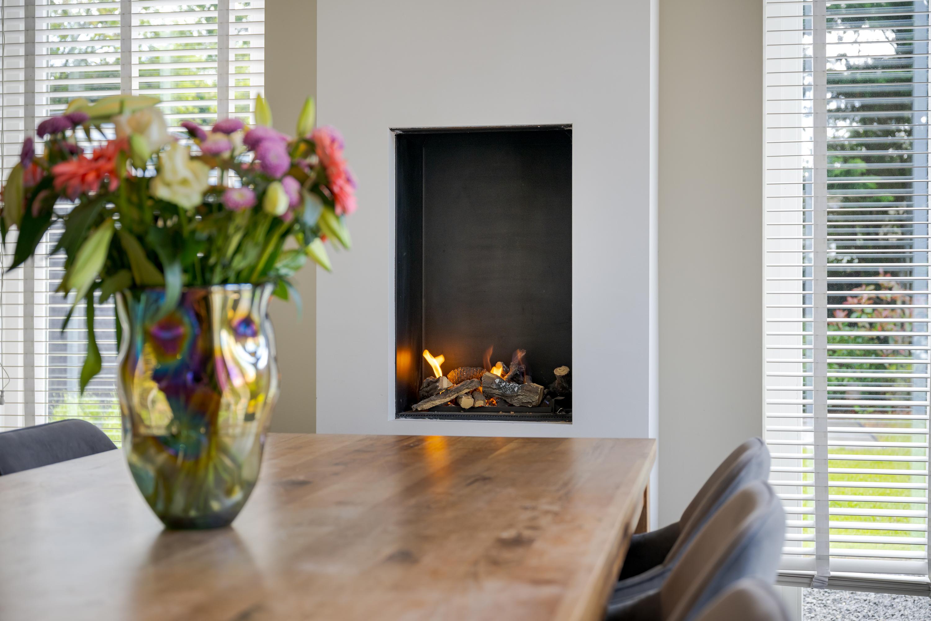 De moderne keuken is voorzien van alle wenselijke apparatuur, waarbij het kookeiland beschikt over een dubbele spoelbak, vaatwasser, ijskast en een kookplaat op gas én inductie. De hoge wand biedt ruimte aan de stoomoven, combimagnetronoven en het koffieapparaat. Naast koken biedt de keuken ruimte aan een zeer royale eettafel met een gezellige gasgestookte haard. De dubbele openslaande deuren geven vanuit de keuken toegang tot het ruime terras. Naast de keuken bevindt zich de bijkeuken, voorzien van een gootsteen, veel vaste kastruimte en een deur naar de tuin.