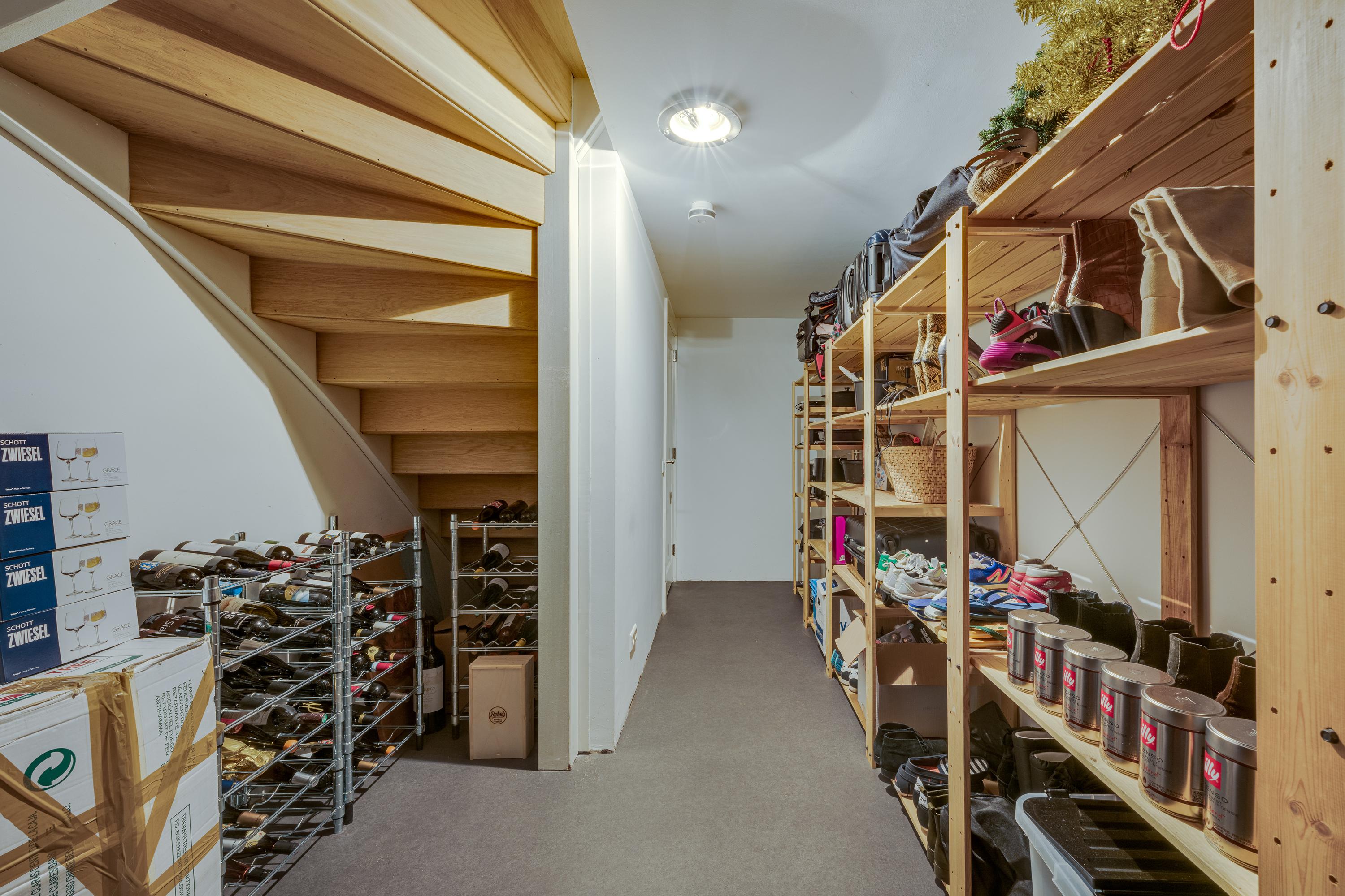 De trap naar de kelder is in dezelfde materialen uitgevoerd als de trap naar de verdieping. In de kelder is een afsluitbare, praktische bergruimte, tevens geschikt als ruimte om de wijn te bewaren.