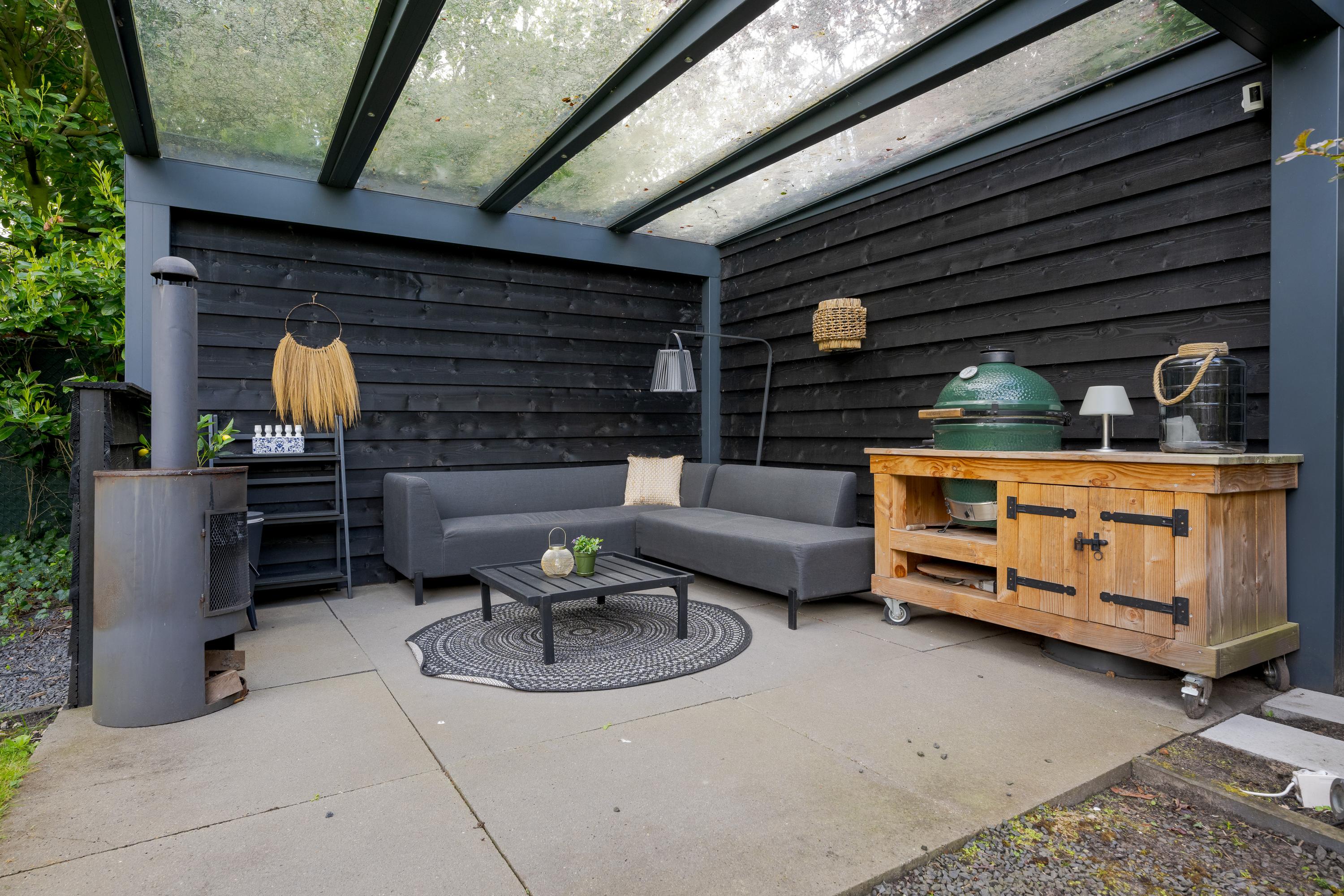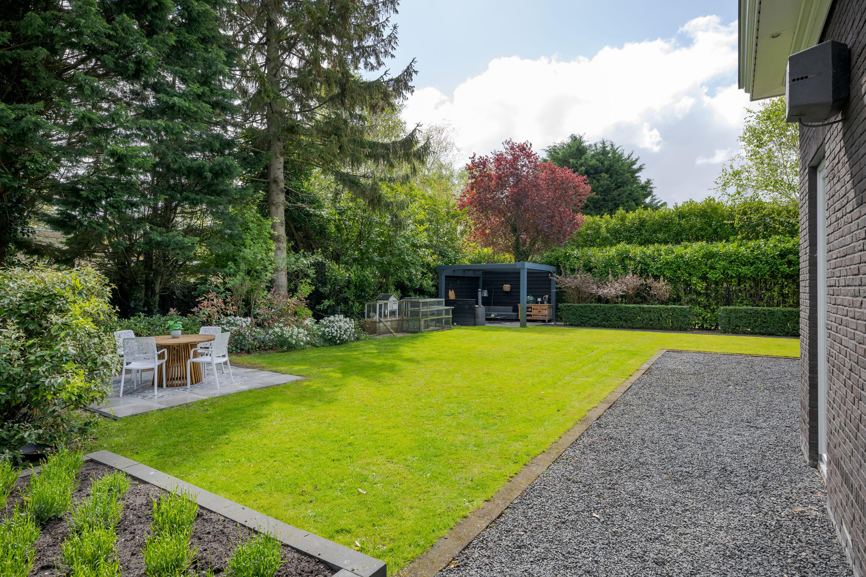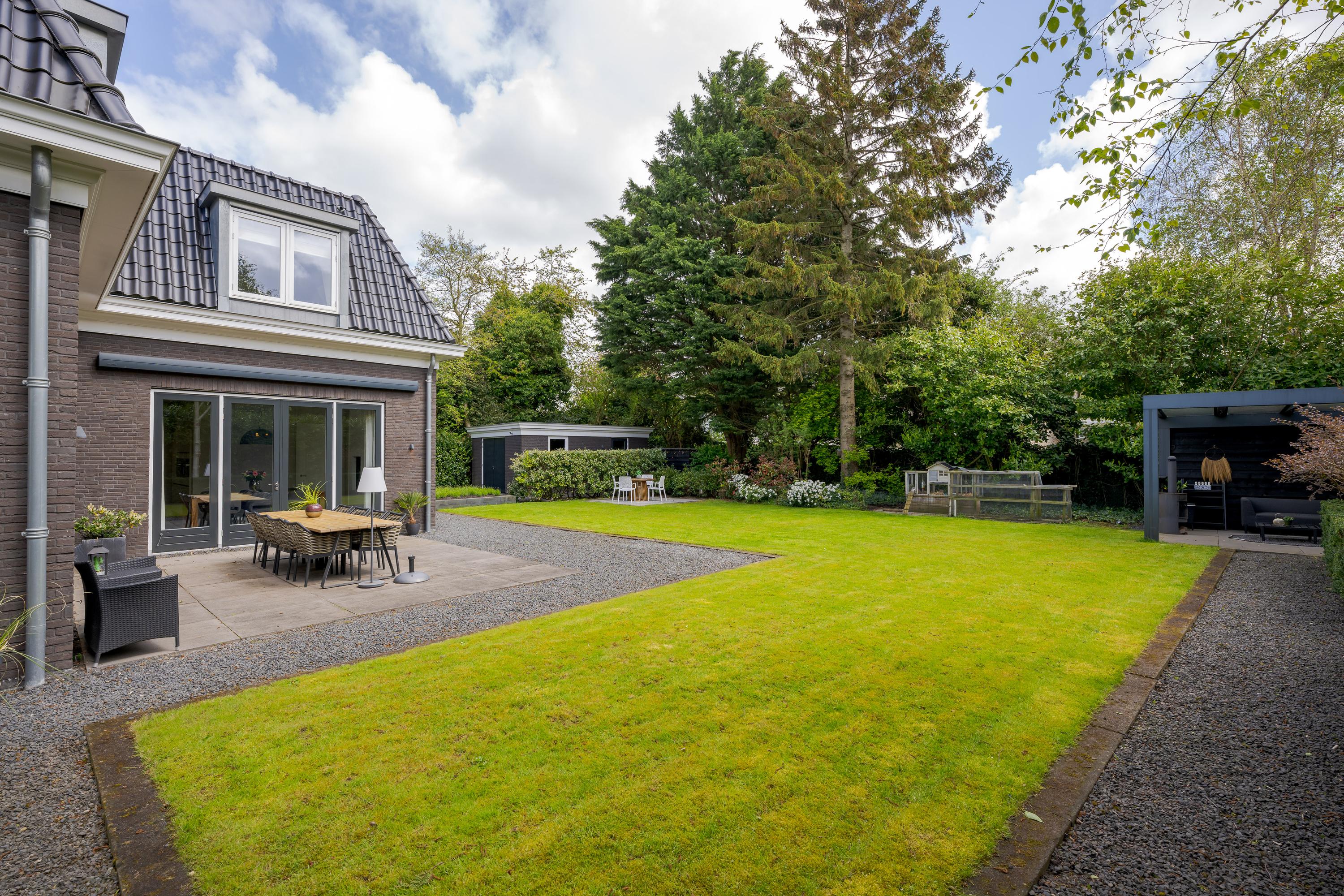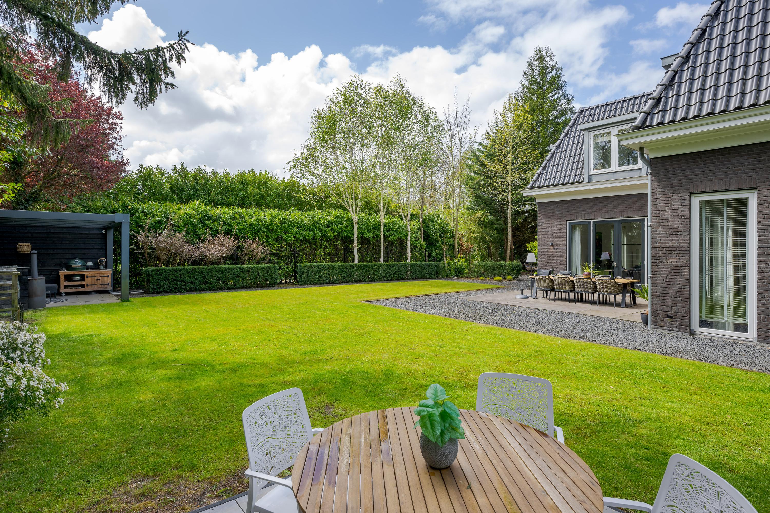 De tuin heeft een zeer gunstige zonligging. Vanaf vroeg in de morgen tot laat in de avond staat de zon op het perceel. Achter in de tuin is een zithoek met overkapping en buitenkeuken, een heerlijk beschutte plek om in de zomer te BBQ-en of een mooi glas wijn te drinken. Het grote terras grenzend aan het gazon is op het zuiden gelegen en rondom de woning zijn nog diverse zithoekjes gecreëerd, zodat er op elk moment van de dag van de zon of de schaduw kan worden genoten.