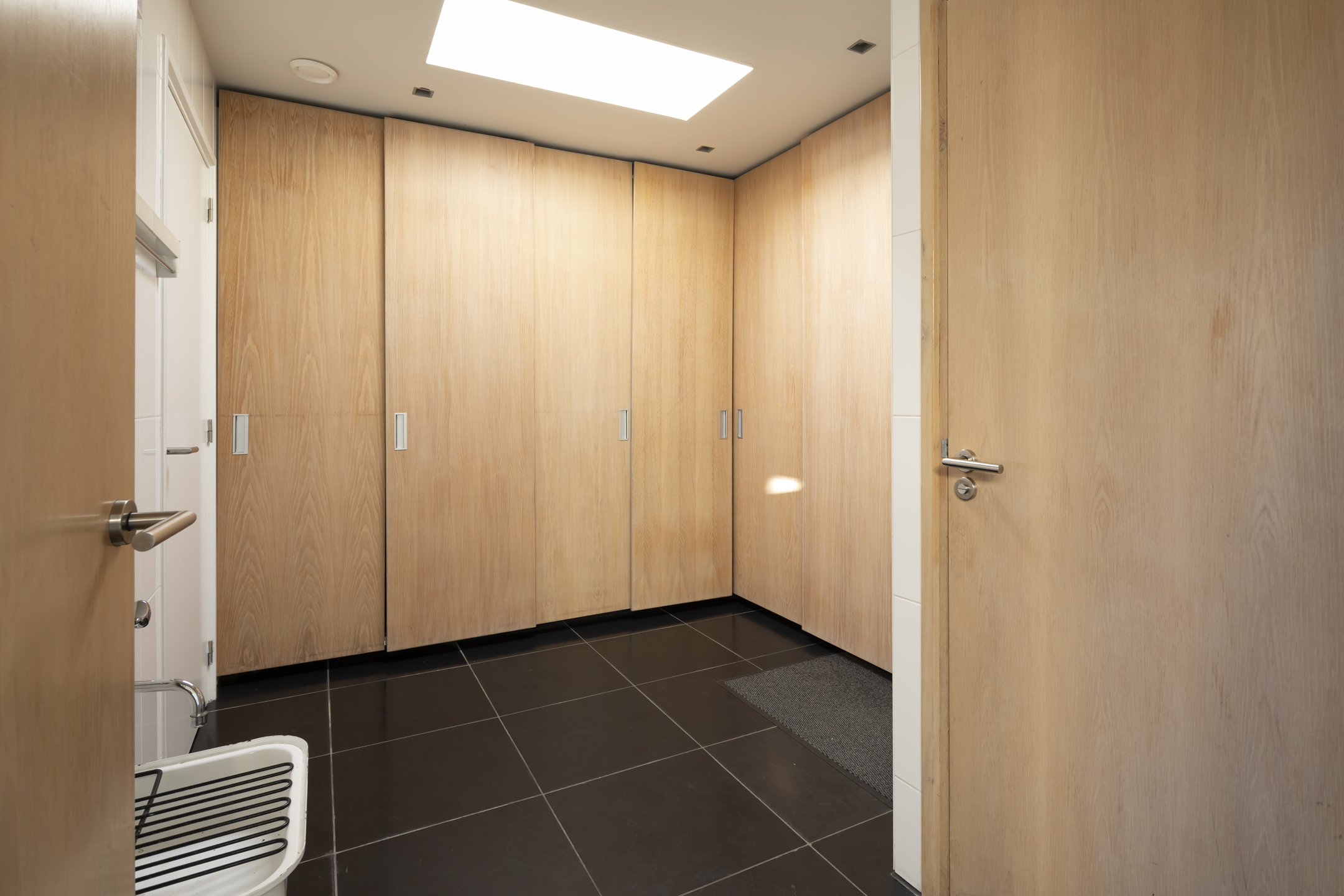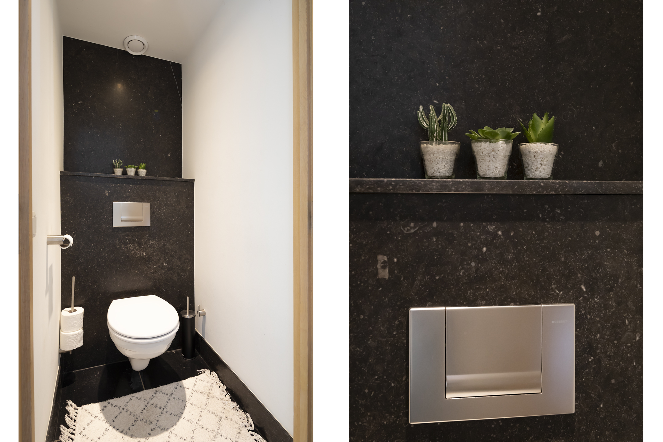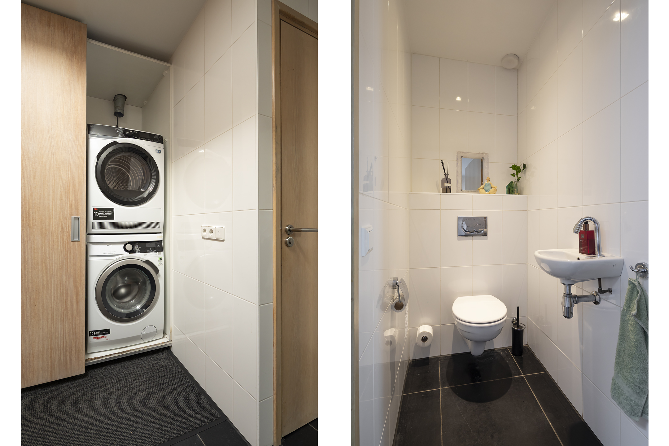 Het achterste gedeelte van de woning is vooral praktisch van aard. Grenzend aan de keuken bevindt zich een extra toiletruimte met een fonteintje, een bijkeuken met daarin de voorzieningen voor de wasapparatuur en heel veel praktische kastruimte in de op maat gemaakte inbouwkasten.