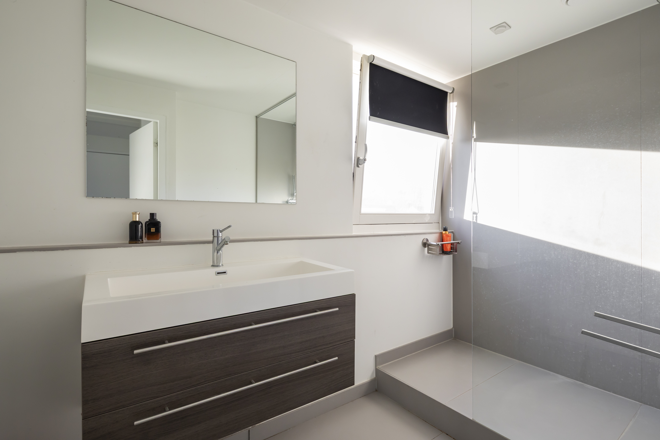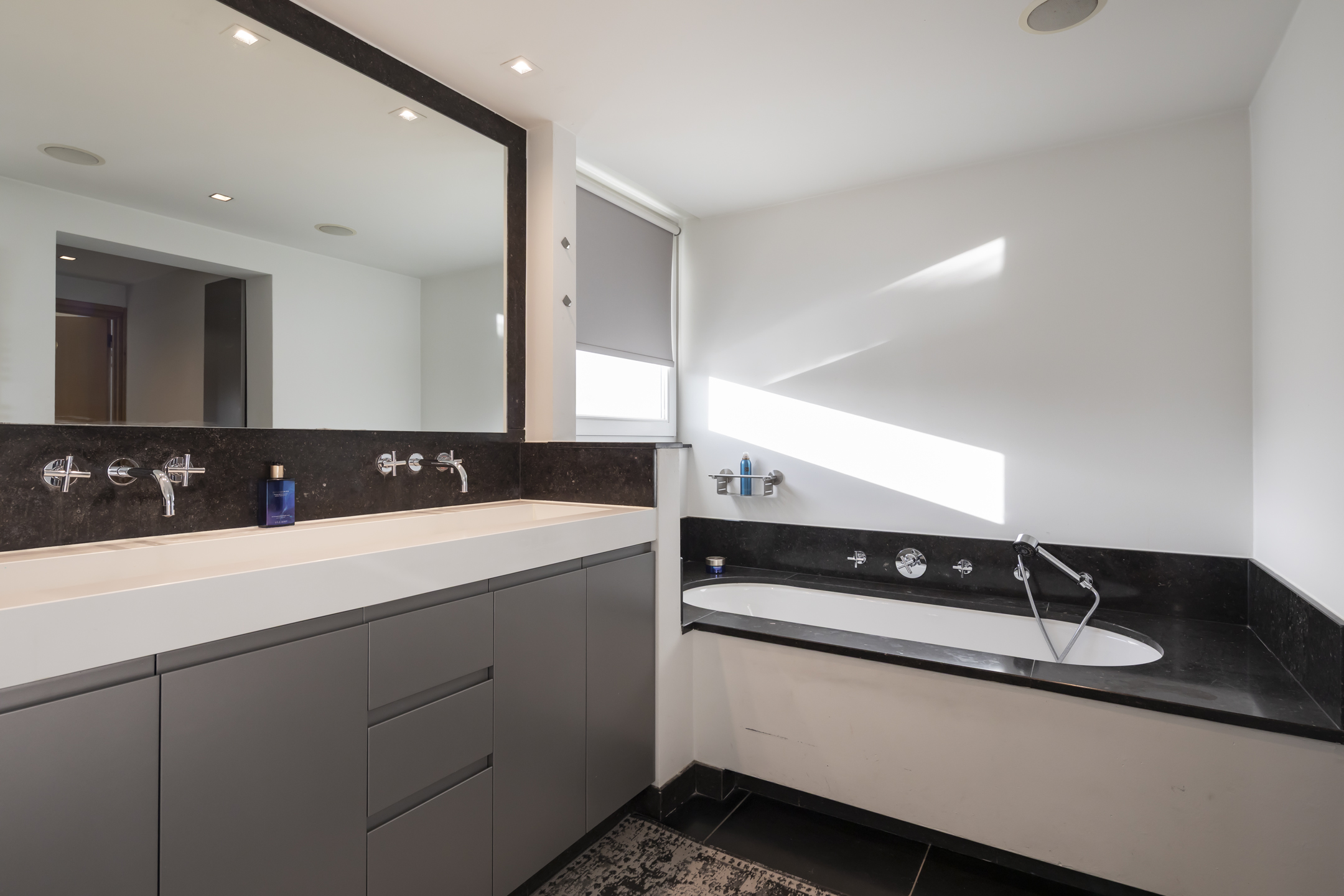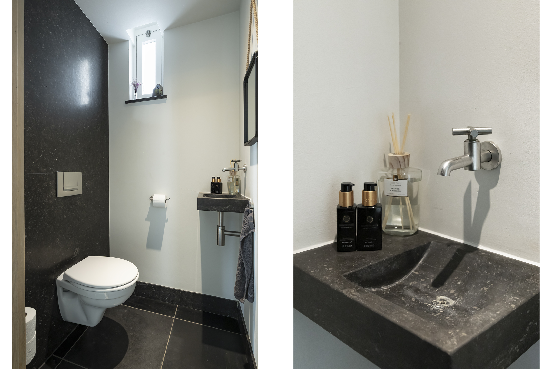 De moderne badkamer (voorzien van inbouwspeakers in het plafond) is van alle gemakken voorzien, is netjes betegeld, heeft natuurlijk daglicht en heeft vloerverwarming. Er is een dubbele wastafel, een comfortabel ligbad en een royale inloopdouche. De separate toiletruimte is via de overloop bereikbaar.