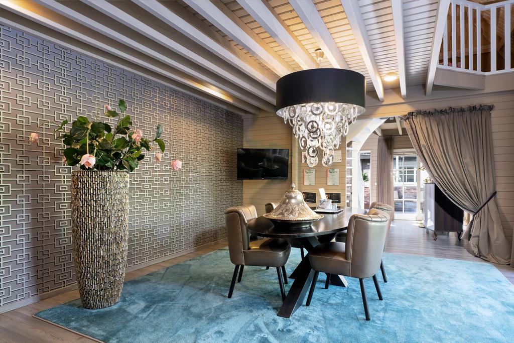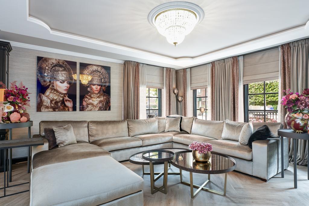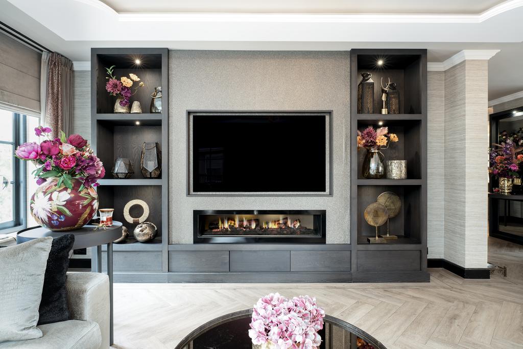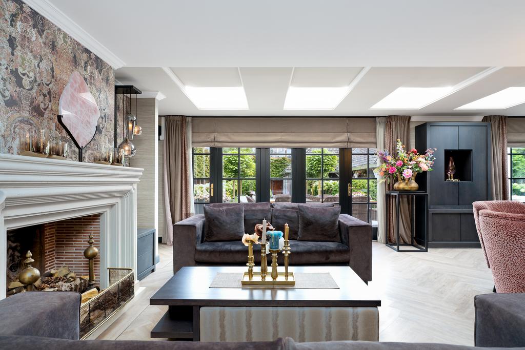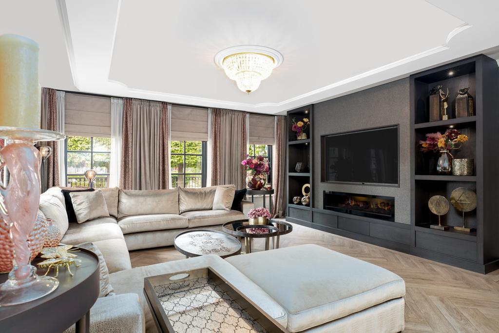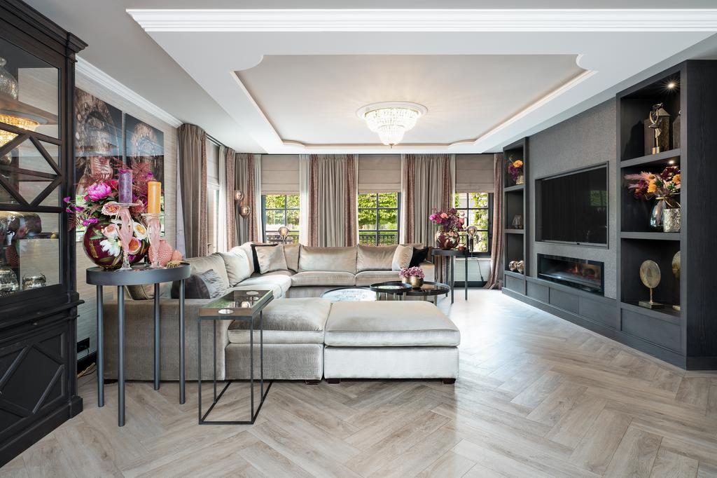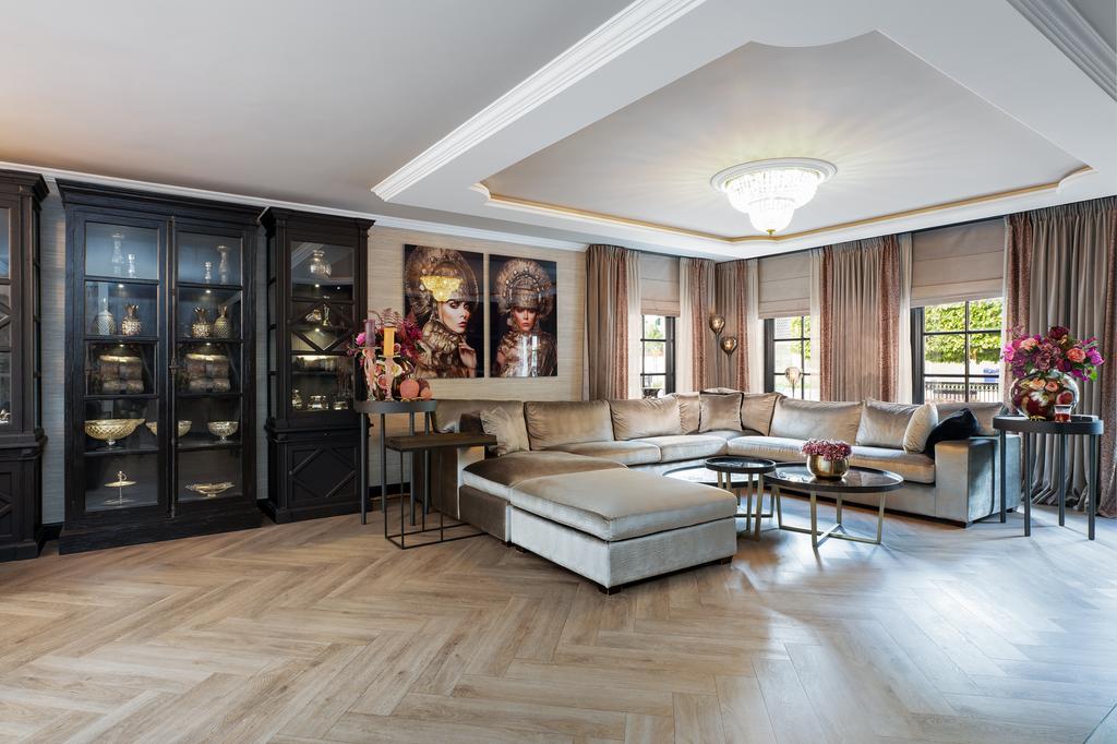 Bij binnenkomst wordt direct duidelijk dat dit geen doorsnee woning is. De grandeur van de villa wordt benadrukt door hoogwaardige afwerkingen zoals visgraatparketvloeren, Italiaanse marmeren badkamers, luxe raambekleding en handgemaakte inbouwkasten. De royale living is voorzien van een stijlvolle cinewall met een grote flatscreen en een sfeervolle open haard (Anneke Dekkers).