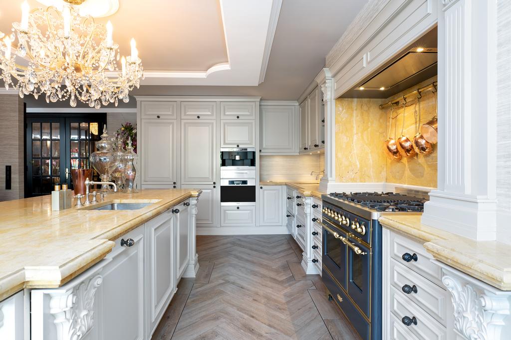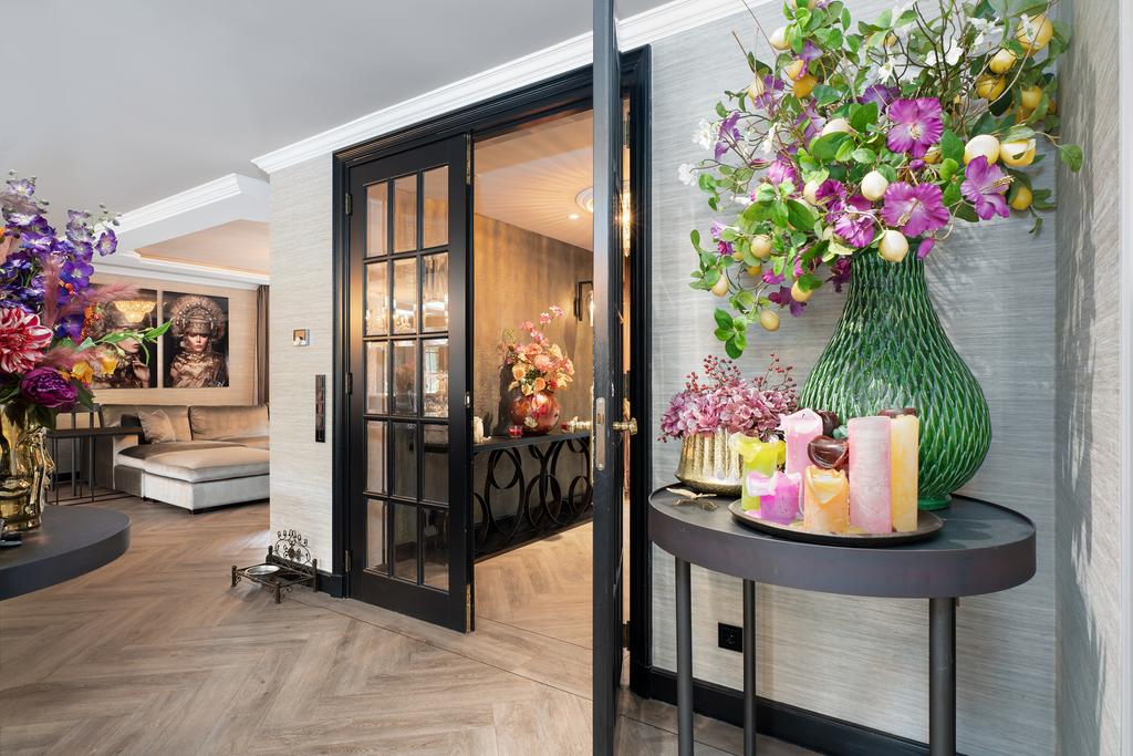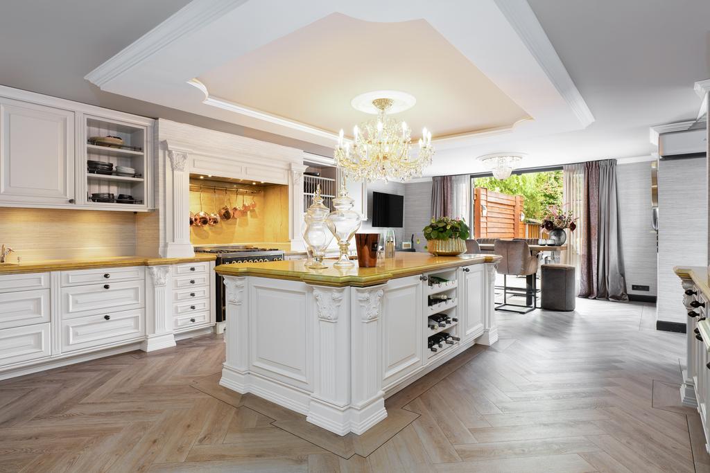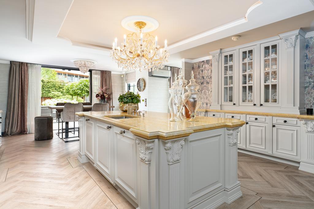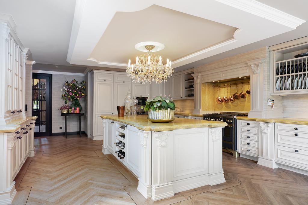 De statige entree met ingebouwde garderobe en gastentoilet leidt naar de royale woonkeuken in landhuisstijl, voorzien van een werkeiland, servieskast en luxe inbouwapparatuur, waaronder twee vaatwassers, twee koelkasten, twee vriezers, twee combi-heteluchtovens en een vijfpits Boretti-fornuis. Vanuit de woonkeuken, living en zwembadruimte bieden dubbele openslaande deuren directe toegang tot de prachtig aangelegde achtertuin.