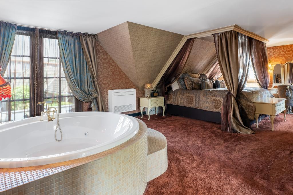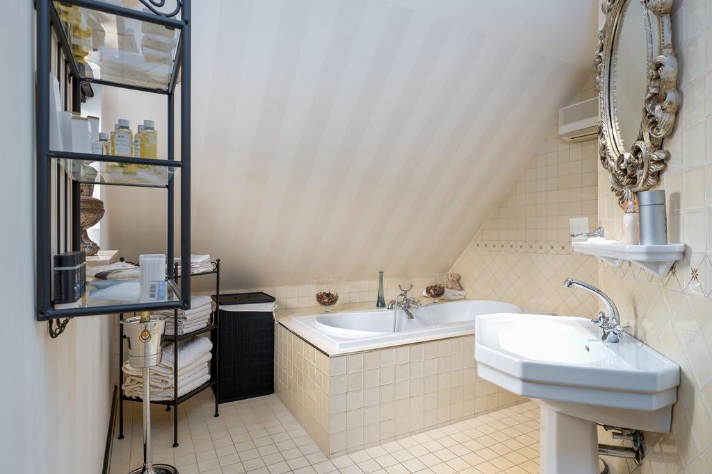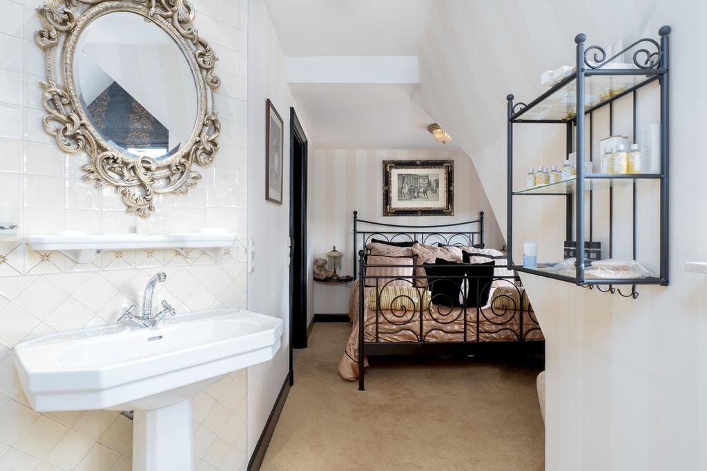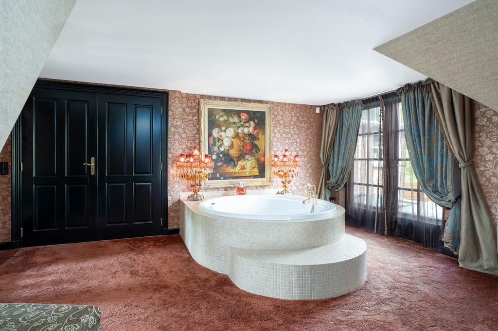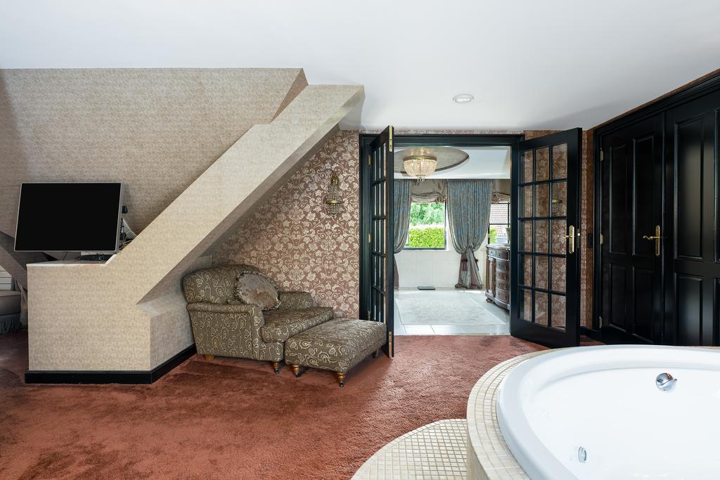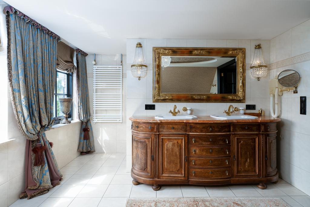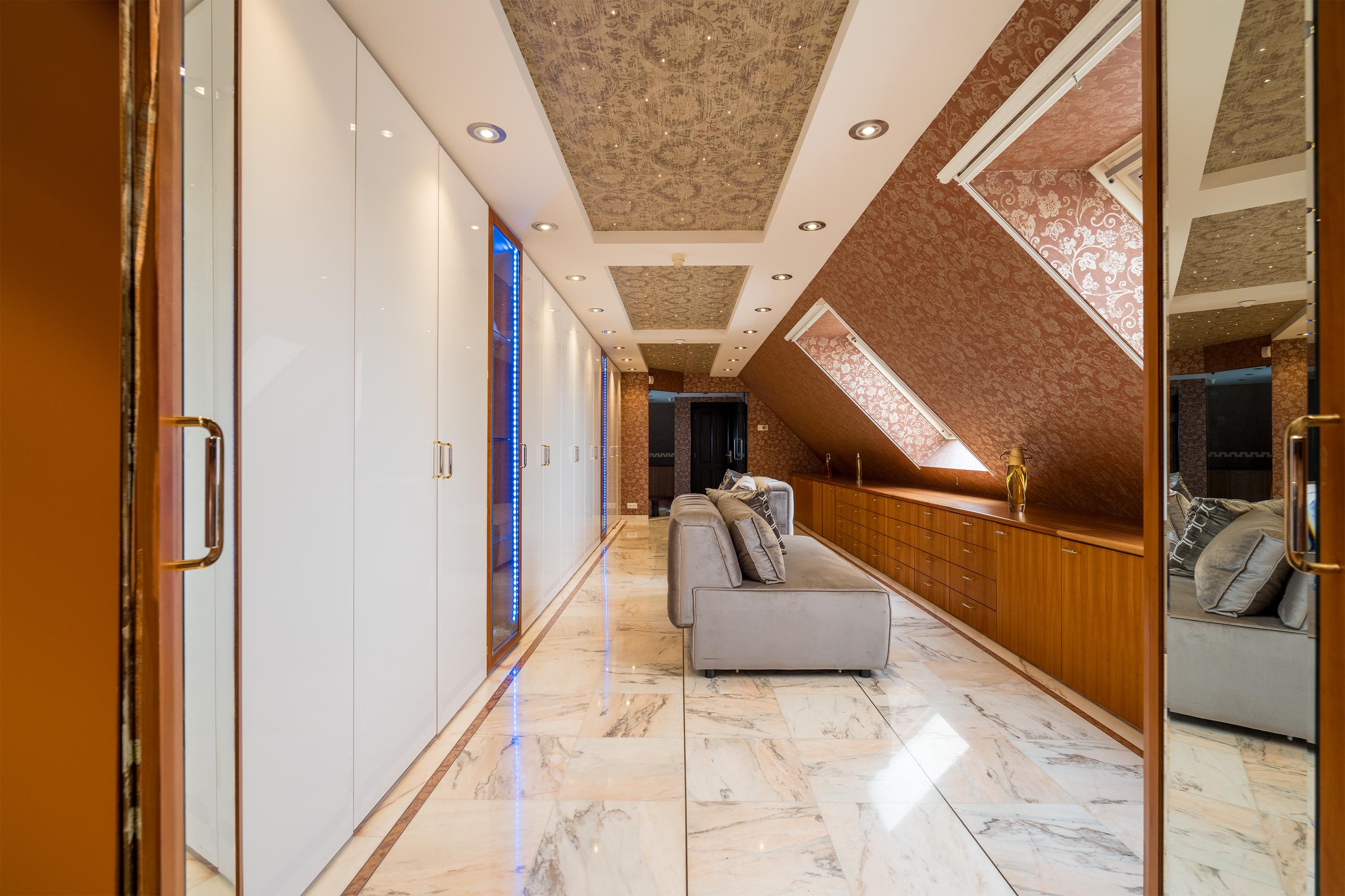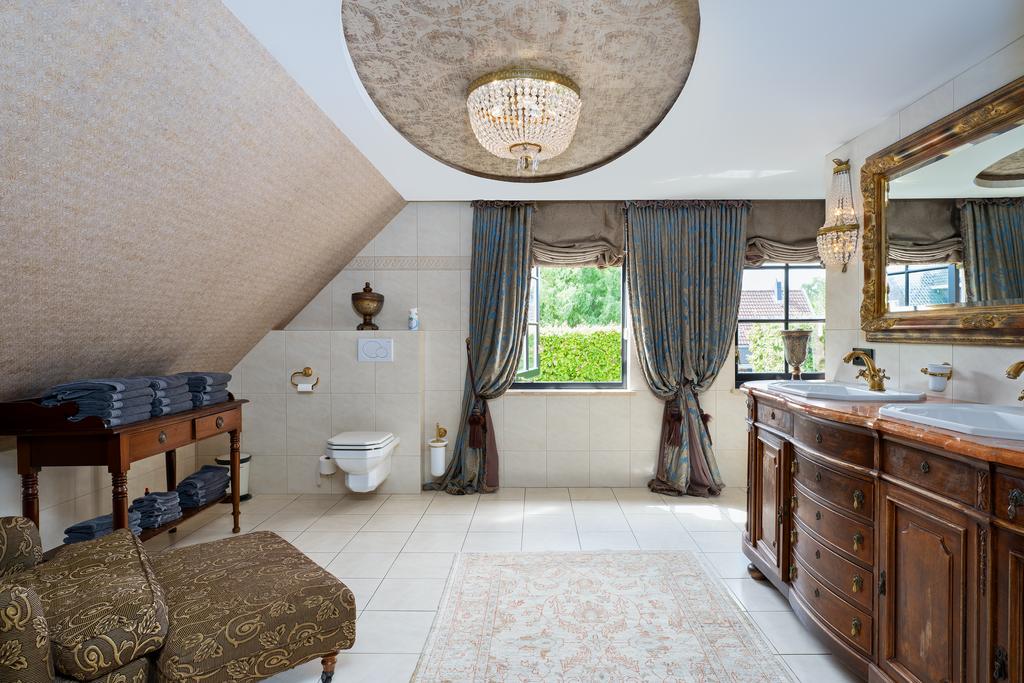 Op de eerste verdieping bevinden zich drie riante slaapkamers, elk met een privébadkamer. De mastersuite is een klasse apart, met een vrijstaand rond ligbad, een eigen badkamer met toilet, een exclusief antiek badmeubel (Pander) met dubbele wastafel en een ruime inloopdouche. De suite beschikt daarnaast over een directe verbinding met de wellnessruimte op de begane grond via een privétrap. Een absolute eyecatcher is de indrukwekkende walk-in closet van circa 50 m², compleet met maatwerk kastensysteem, spiegels, sfeerverlichting en een marmeren vloer. Alle slaapkamers zijn uitgerust met airconditioning.
