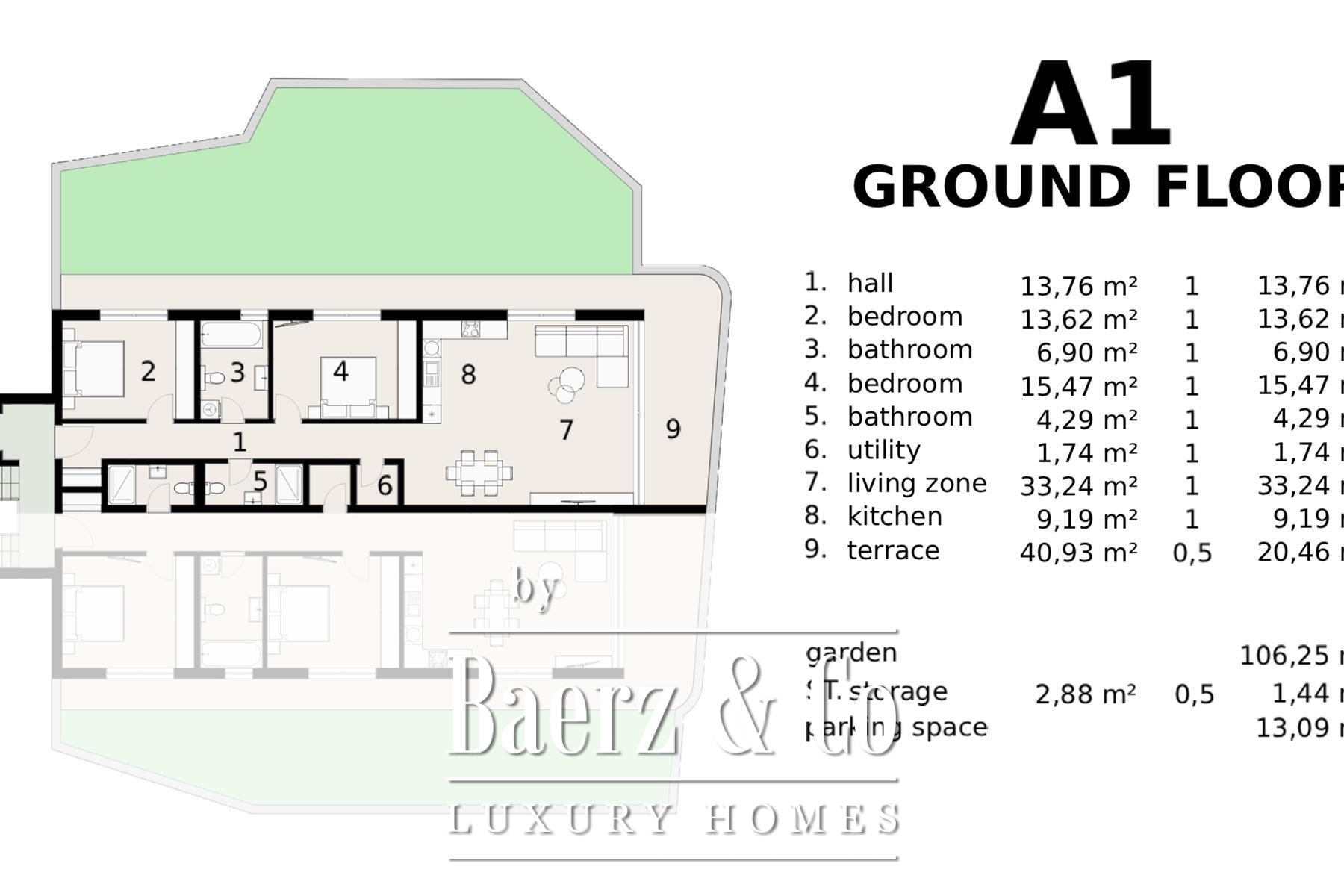 Het appartement is ontworpen met aandacht voor eigentijdse architectuur en duurzame kwaliteit en omvat een entreehal, twee ruime slaapkamers, twee moderne badkamers en een open woonkamer met keuken en eetgedeelte. Via grote glazen schuifdeuren komt u vanuit de leefruimte op het royale terras van 40,93 m², waarmee binnen en buiten naadloos in elkaar overlopen en u geniet van panoramisch zeezicht. De privé tuin van 106,25 m² vormt een besloten oase voor rust of om gasten te ontvangen tegen de achtergrond van de kust.