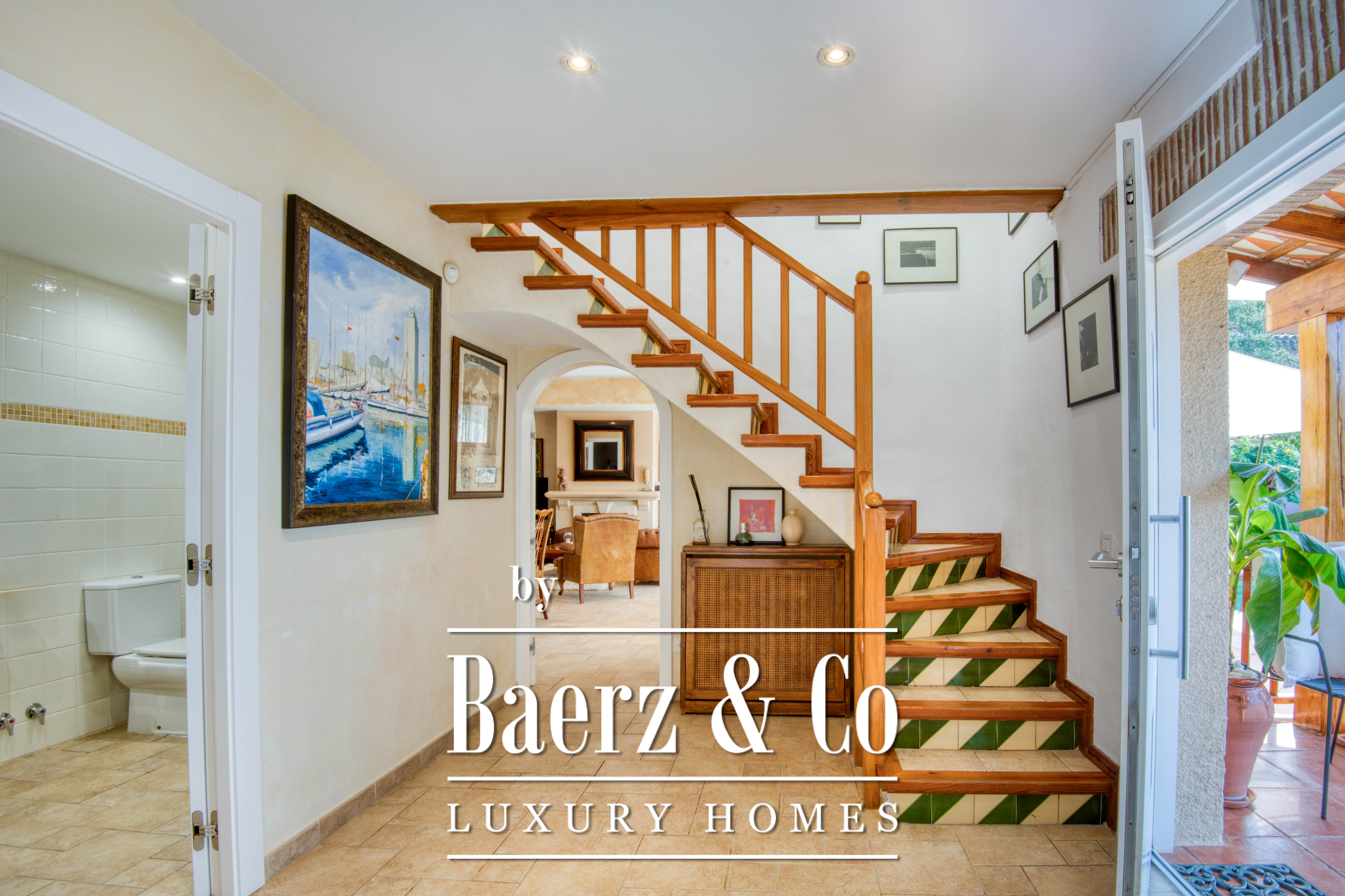 Dit rustieke landgoed in Platja d’Aro ademt een sfeer van tijdloze mediterrane elegantie, genesteld in een bevoorrechte omgeving. Het perceel beslaat 624 m², met 298 m² woonruimte verdeeld over twee niveaus. Elk detail getuigt van zorgvuldig behoud, waarbij natuurlijke materialen worden gecombineerd met een kalm en authentiek karakter in iedere ruimte. De begane grond biedt een lichte woon- en eetkamer, verdeeld in drie onderscheidende sferen, met een volledig uitgeruste keuken, een multifunctionele kamer (geschikt voor gastenverblijf of als privéwerkkamer) en een complete badkamer. Licht speelt een centrale rol en is op stijlvolle wijze georkestreerd voor privacy en rust.