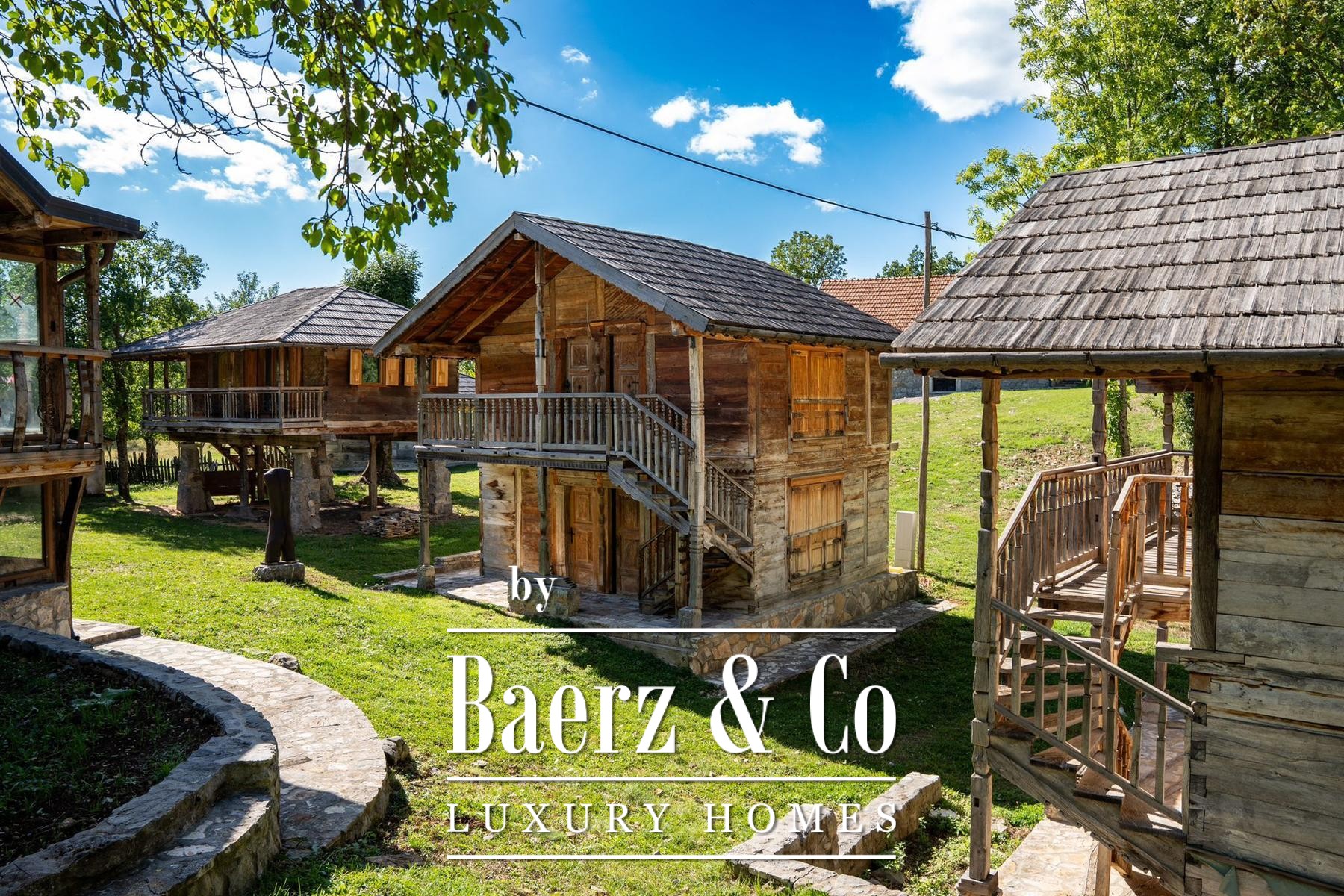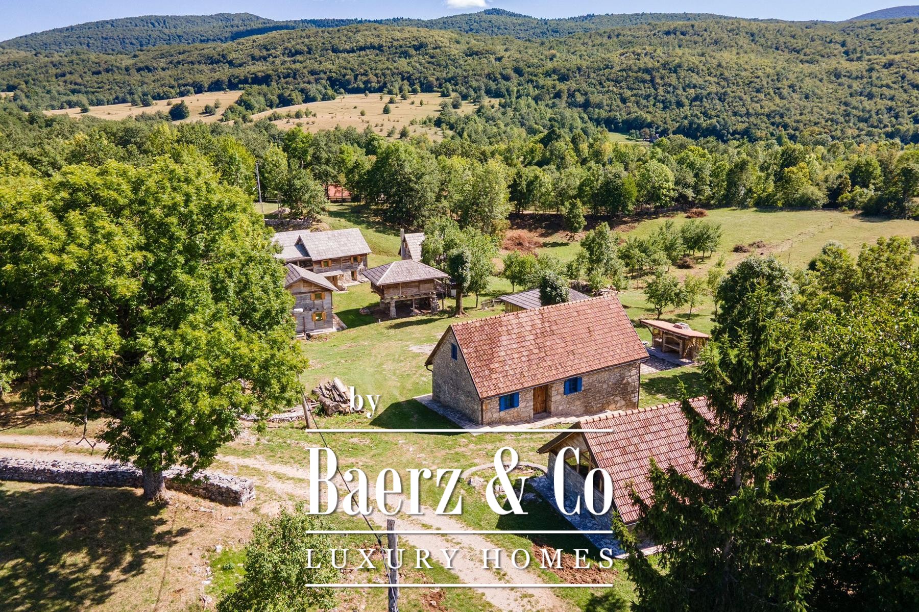 Landgoed te koop Plitvička Jezera biedt een zeldzame kans om een volledig omheind landgoed van 40.000 m² te verwerven, bestaande uit 11 zorgvuldig gerenoveerde en stijlvol op elkaar afgestemde huizen. Het geheel vormt een privé toevluchtsoord, met gecontroleerde toegang en maximale privacy. Centraal op het terrein bevinden zich een hoofdverblijf en een ruim gemeenschapsgebouw, voorzien van een professionele keuken en royale eetruimte, ontworpen voor bijeenkomsten, zakelijke programma’s of creatieve retraites. Daarnaast zijn er negen gastverblijven, elk met twee slaapkamers en eigen badkamers, wat in totaal minstens 22 en suite kamers oplevert, goed voor maximaal 44 gasten.