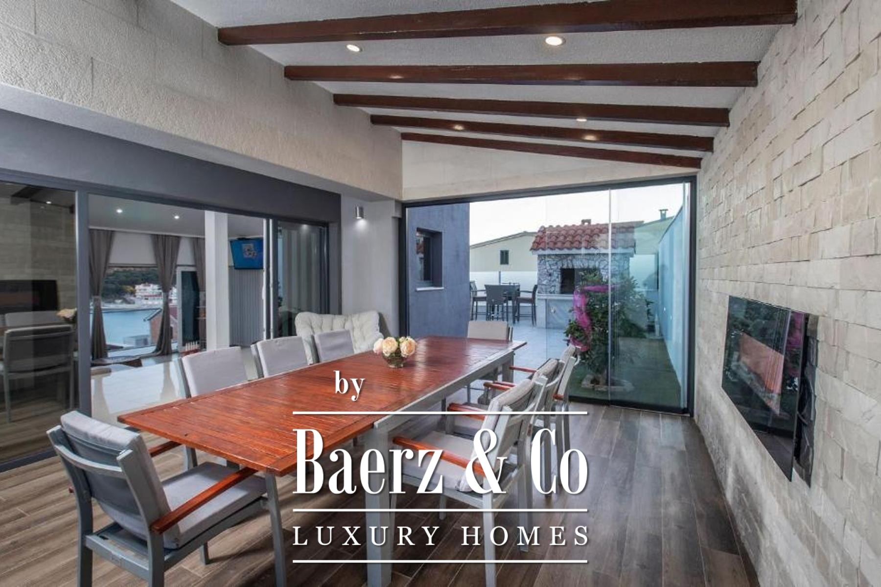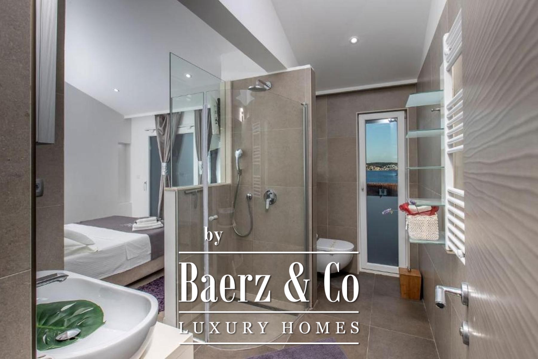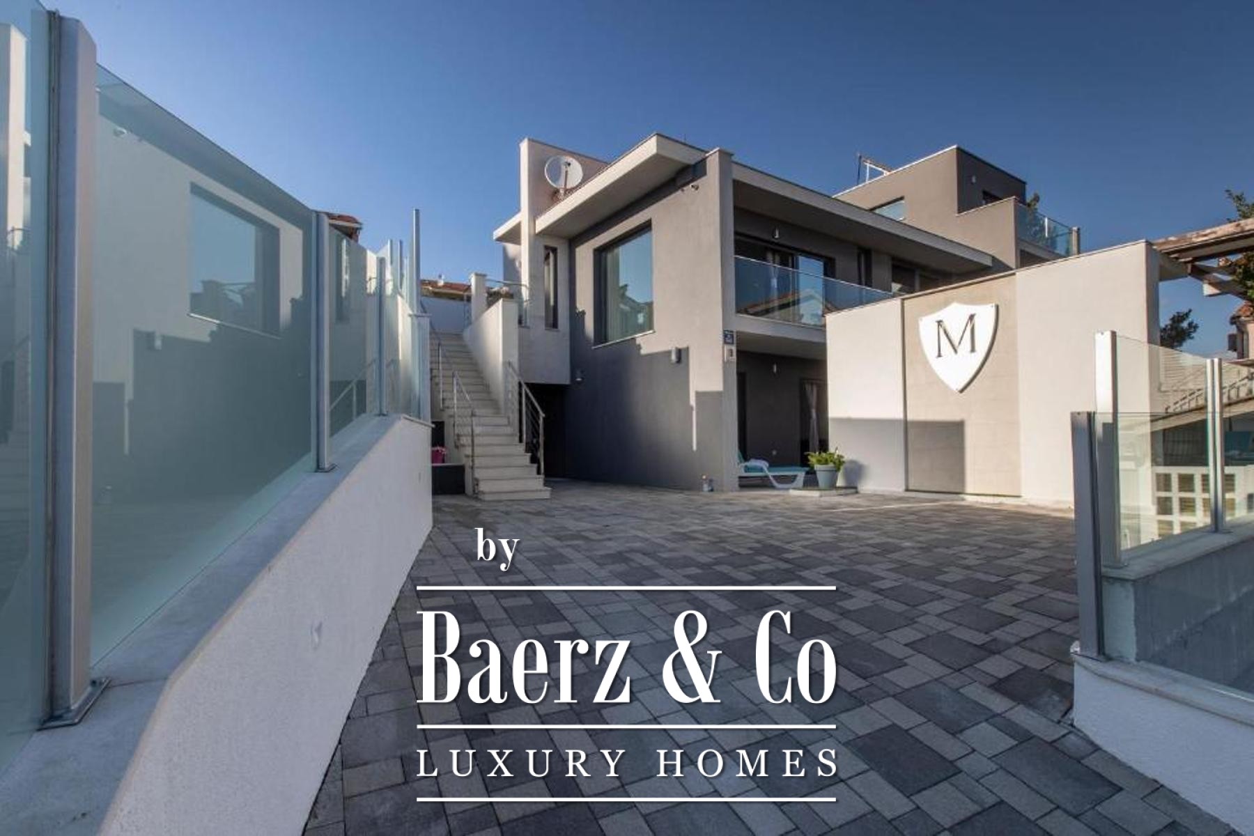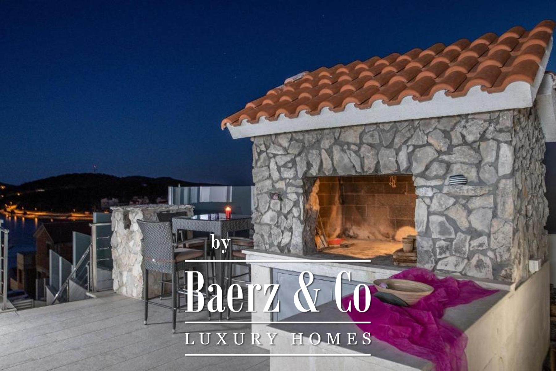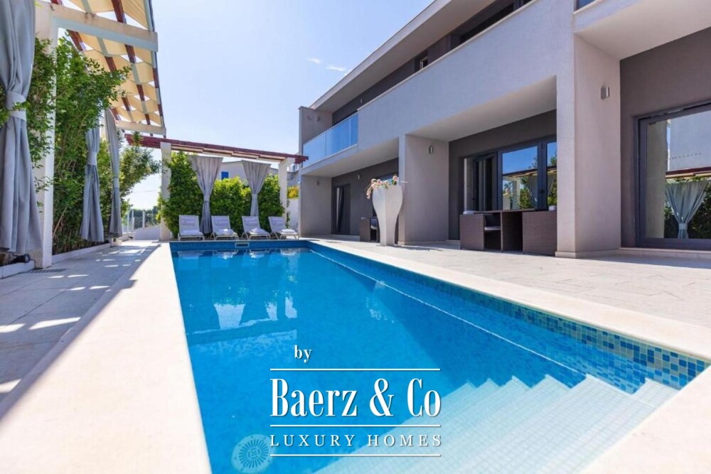 De bovenverdieping biedt een lichte leefruimte met keuken en eetgedeelte, twee slaapkamers en twee badkamers, waarbij elke hoofdruimte toegang biedt tot balkons met uitzicht op zee en zwembad. Flexibiliteit staat centraal, want de eerste verdieping kan worden gescheiden in zelfstandige appartementen om tegemoet te komen aan diverse woonwensen of voor eventuele gastverblijven. Verfijnde afwerkingen en hoogwaardige inrichting kenmerken elk detail, terwijl doordachte voorzieningen zoals een taverne met barbecue, een uitnodigende eet- en ontmoetingsruimte en een zonnige tuin bijdragen aan het wooncomfort. Drie parkeerplaatsen maken het geheel compleet, voor ontspanning en mogelijkheden aan de prachtige Kroatische kust.