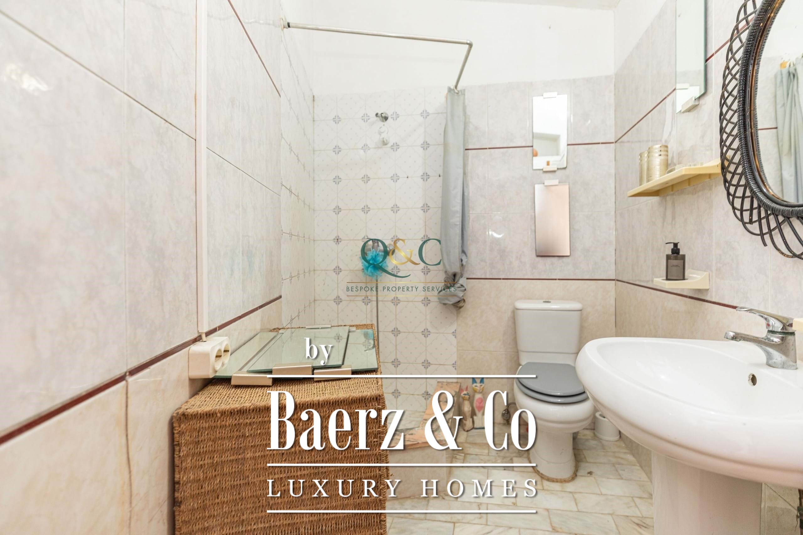Set behind electric gates, the fully enclosed gardens provide a variety of inviting spaces for both relaxation and entertaining. From the driveway with ample parking, steps lead up to a covered main terrace and double doors opening into a grand entrance hall. This flows into a bright sitting room with fireplace and sliding doors back onto the terrace, as well as a semi-open dining room. A sweeping staircase adds a touch of grandeur, leading to the upper floor.