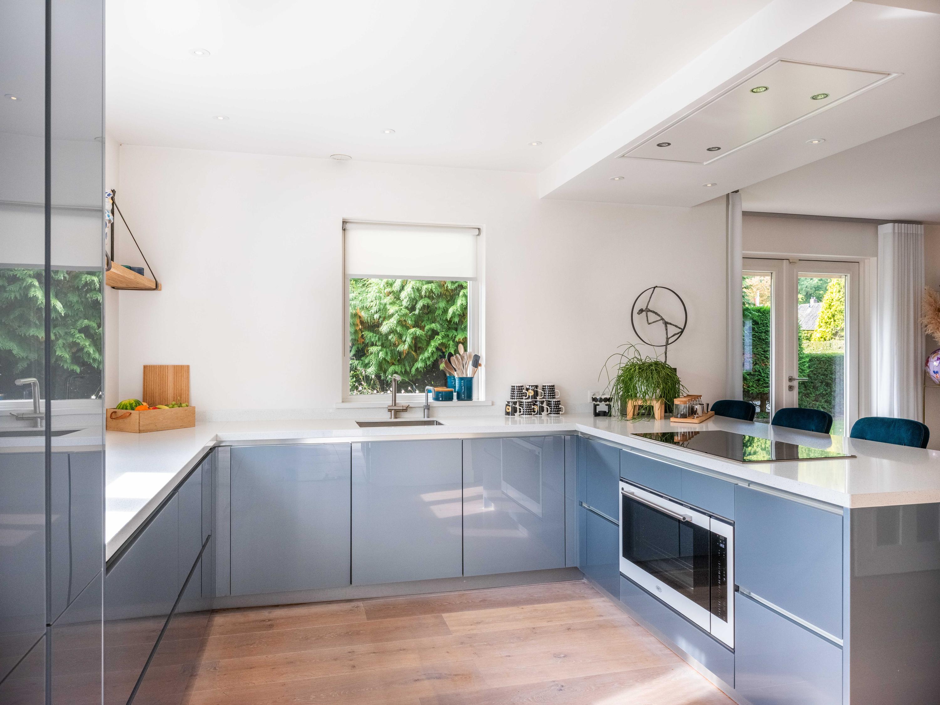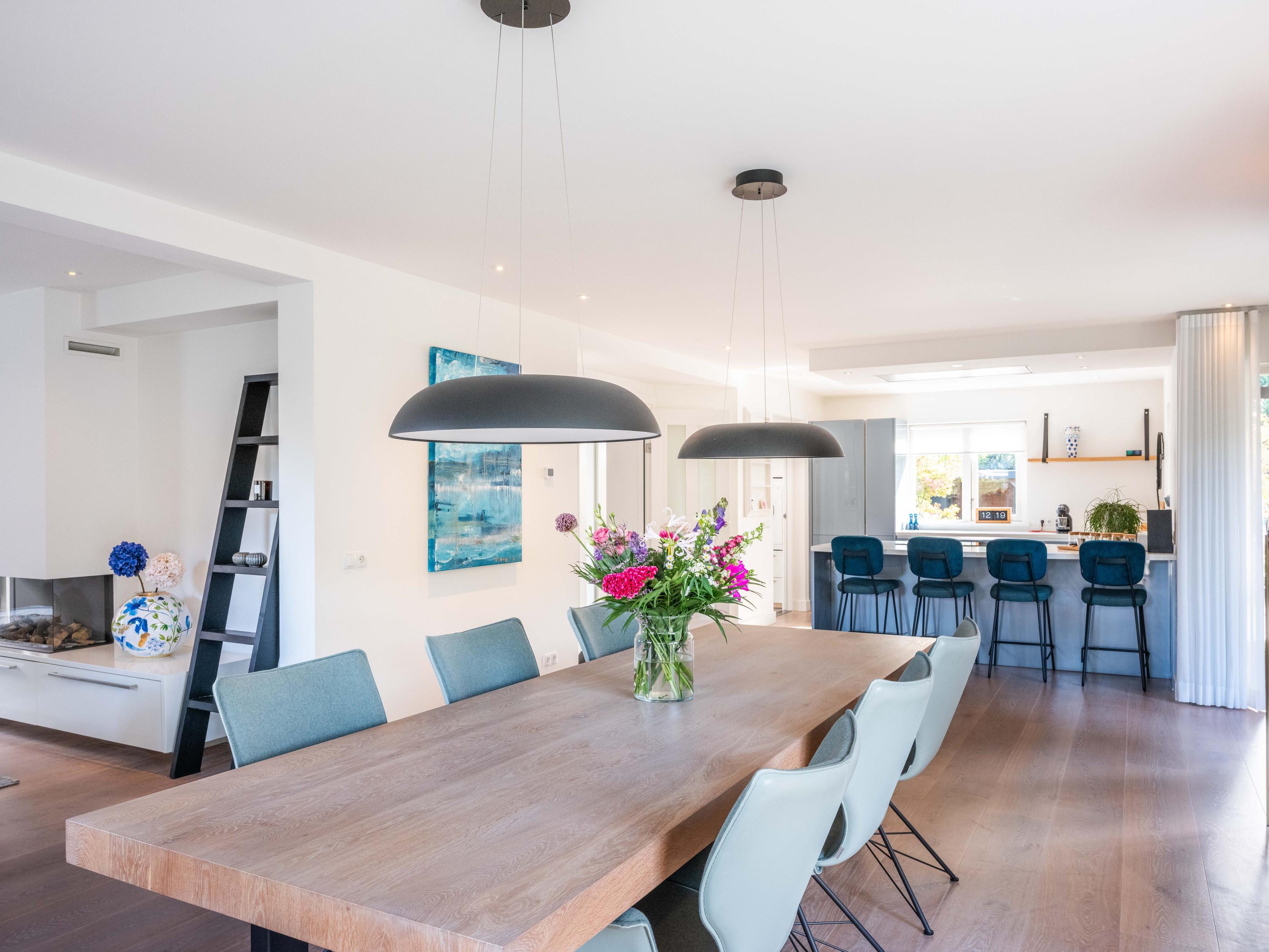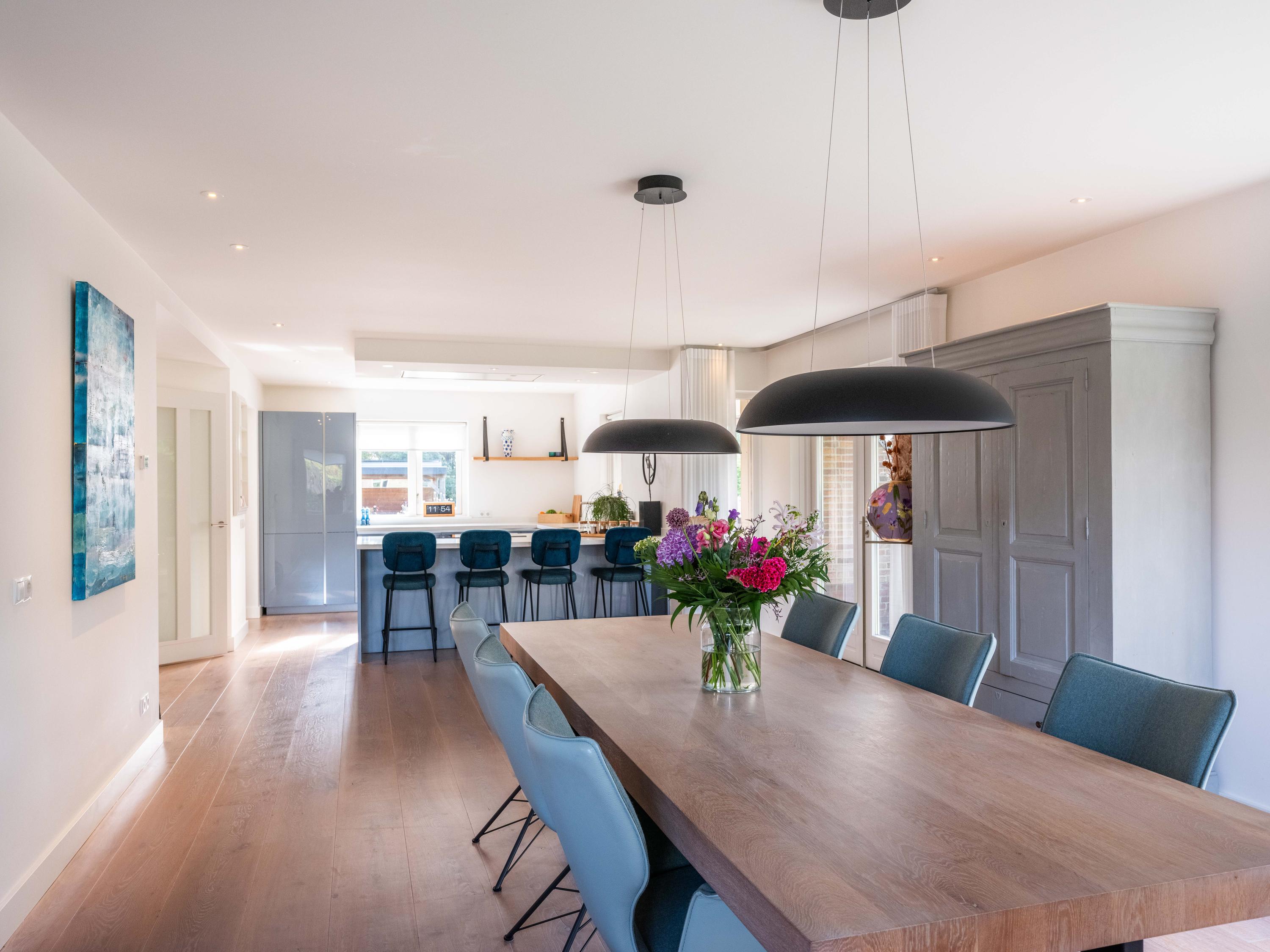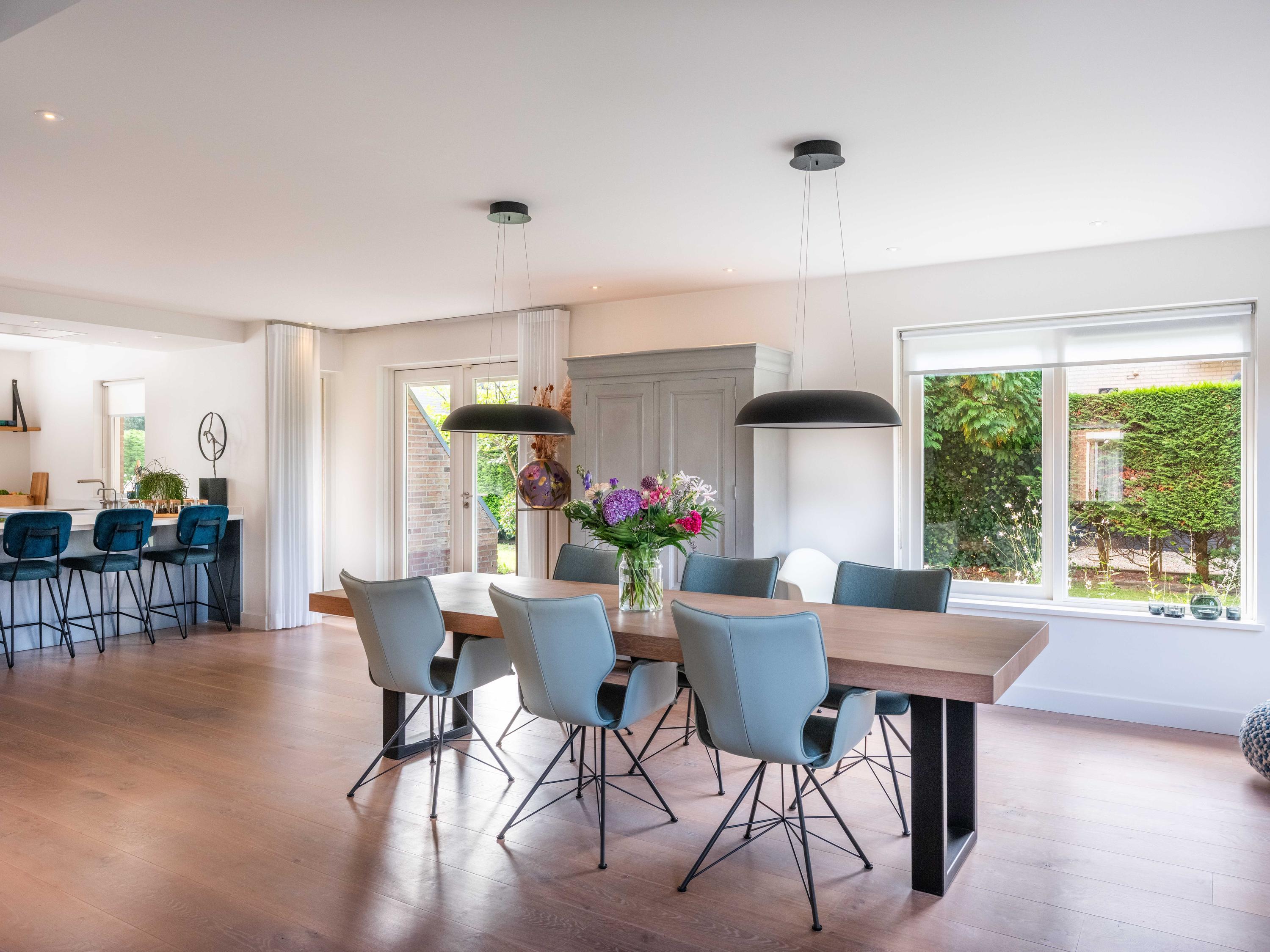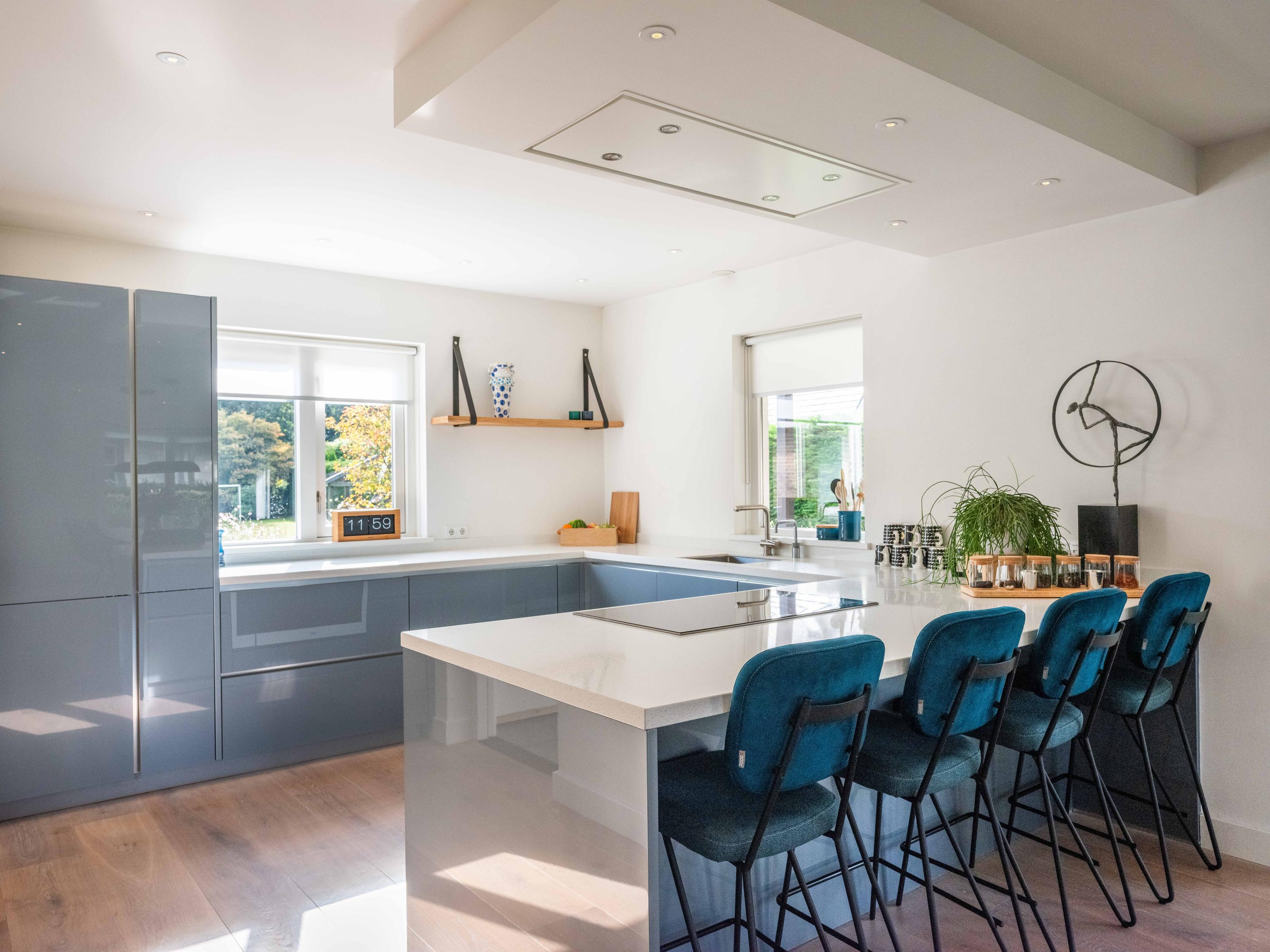 De open keuken is sfeervol ingericht en voorzien van een gezellige bar met zitplaatsen. Vanuit de keuken geniet je van een prachtig uitzicht over de tuin en is er directe verbinding met de woonkamer. Dankzij de open indeling en het overvloedige licht voelt alles ruim, fris en uitnodigend aan.