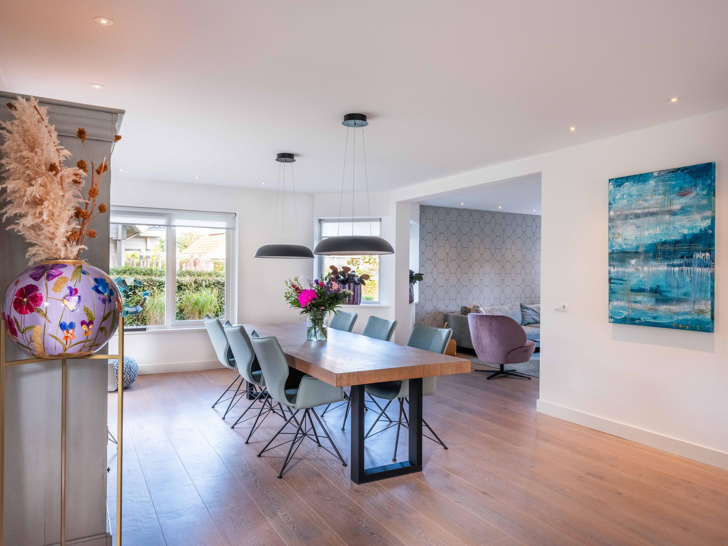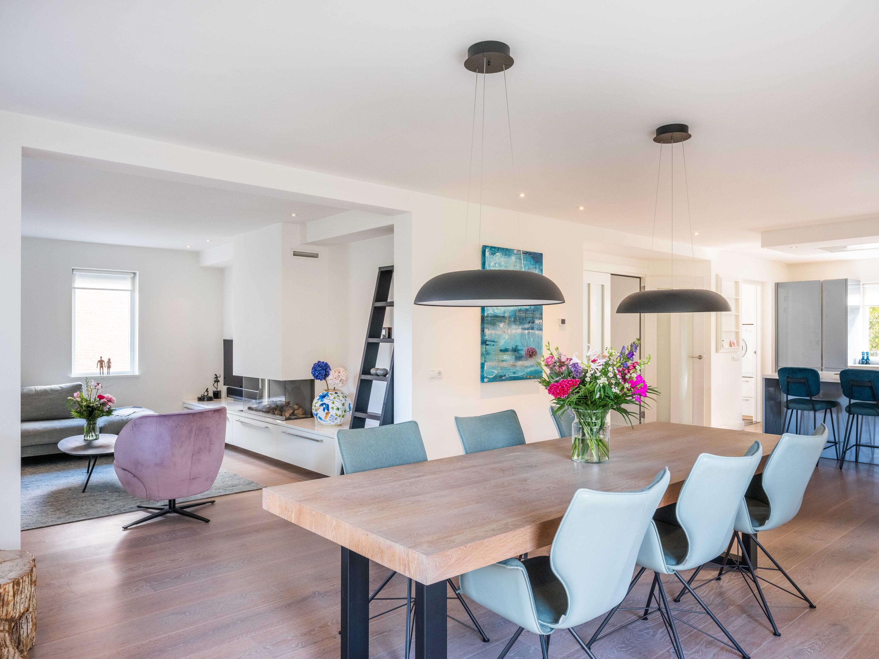 Via dubbele deuren is er toegang tot de royale L-vormige living, hier wordt je meteen wordt verwelkomd door veel licht dankzij de grote raampartijen. In de hoek is een gezellige zithoek met een sfeervolle gashaard. De eiken verlijmde vloer in combinatie met vloerverwarming over de volledige begane grond zorgt voor een warme en comfortabele sfeer.