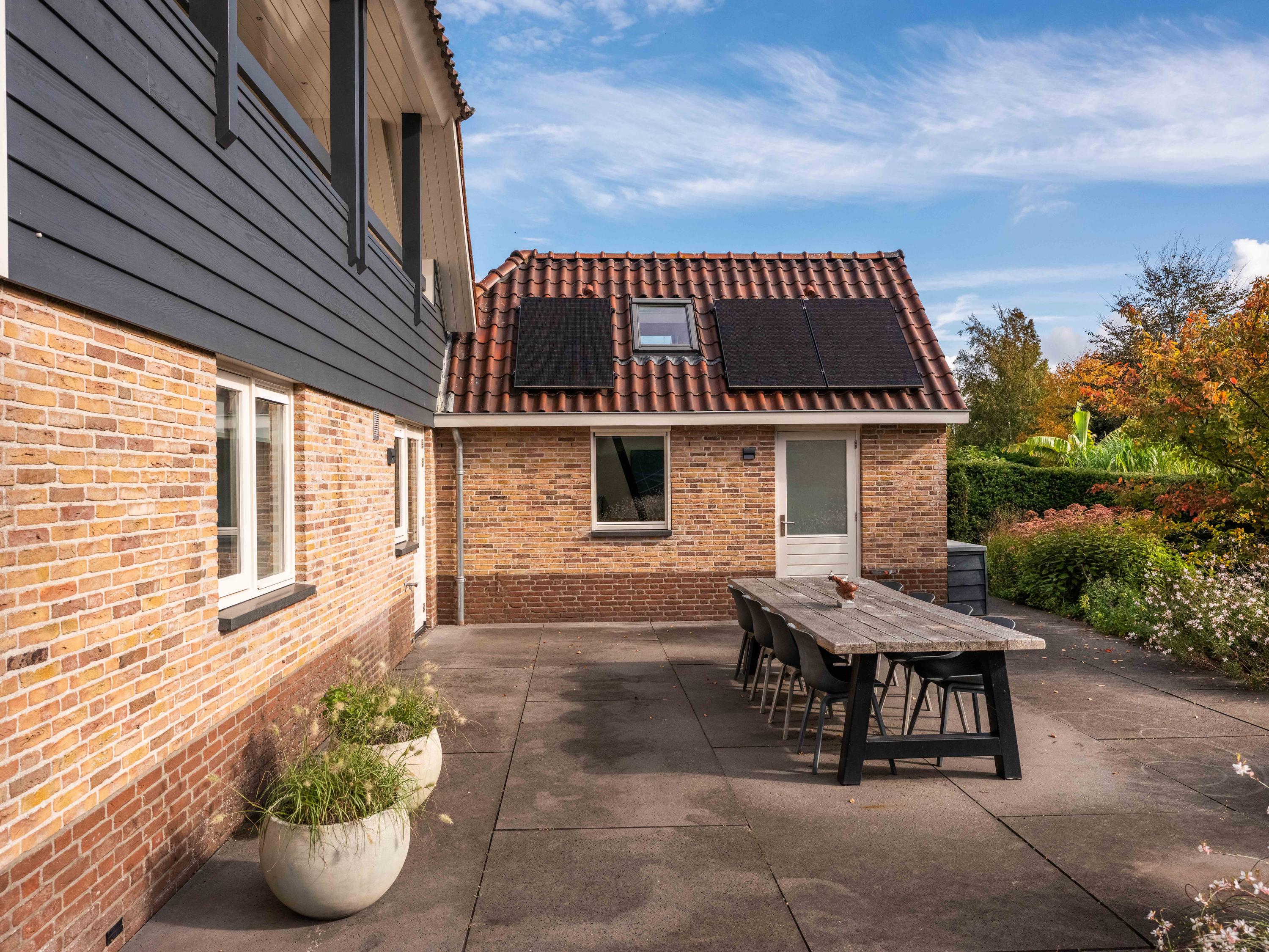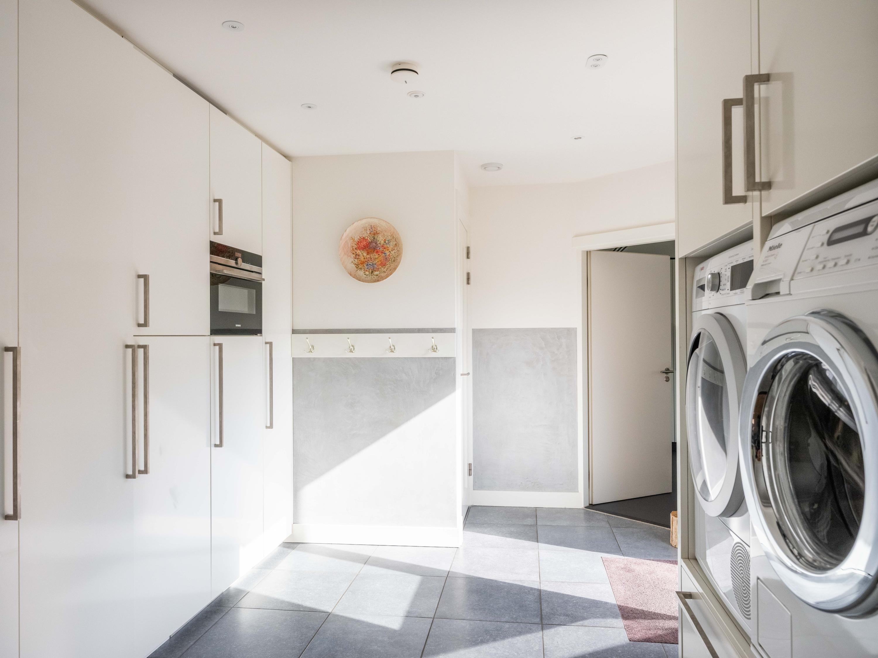 Aansluitend aan de keuken ligt de ruime bijkeuken met vaste kasten en aansluitingen voor wasmachine en droger. In de bijkeuken bevindt zich ook een extra toilet en een deur naar de tuin en het terras.