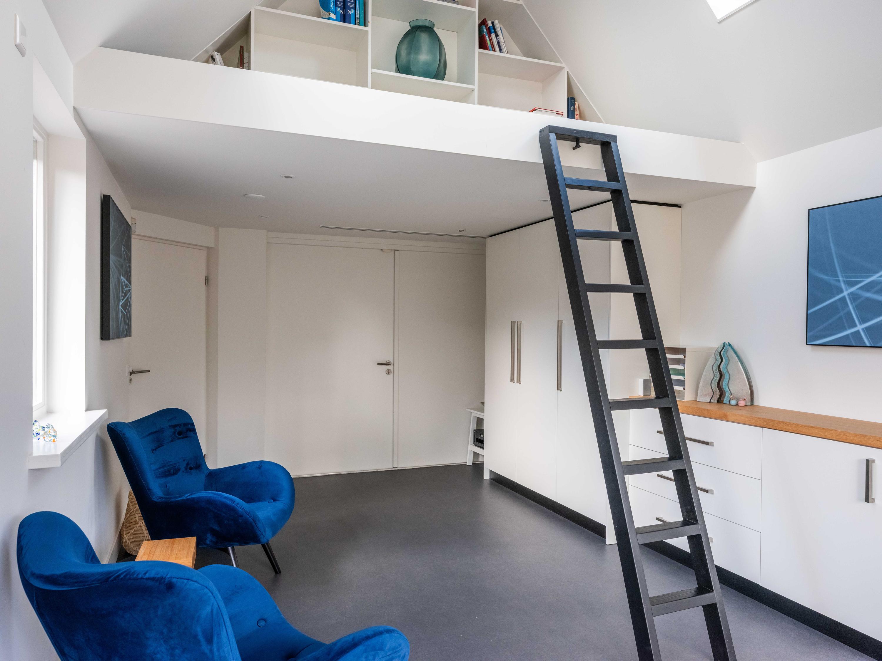 Vanuit de bijkeuken is er toegang tot nog een extra kamer, voorzien van airconditioning en een vliering. Deze kamer wordt nu gebruikt als kantoor, maar kan ook goed dienstdoen als slaapkamer of hobbyruimte. Op de vliering is extra bergruimte aanwezig.