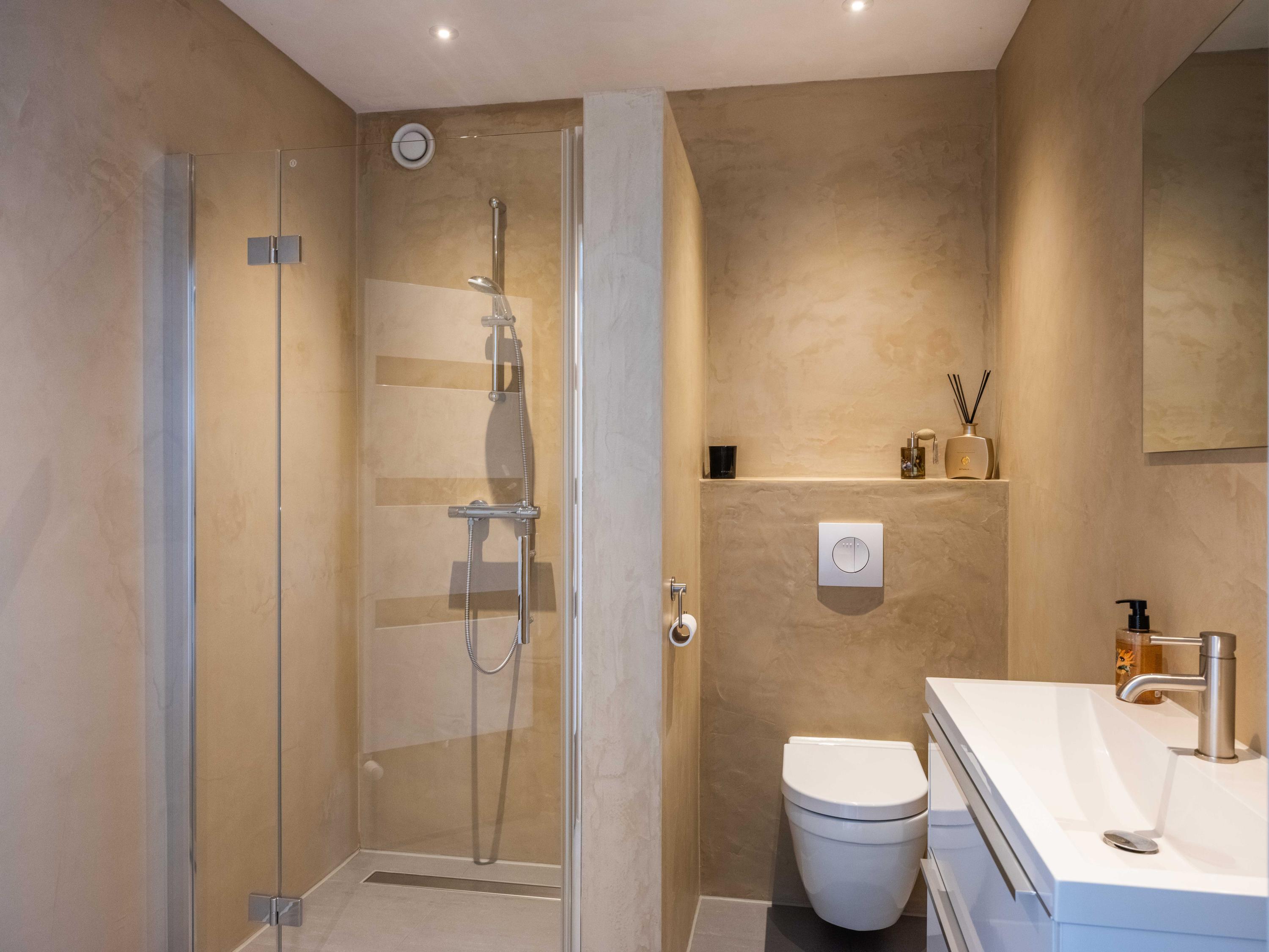 Bij binnenkomst valt direct de ruime hal op, met meterkast, badkamer en de trap naar boven. Onder de trap bevindt zich een praktische bergruimte. De badkamer is ruim opgezet en uitgerust met een douche, toilet, wastafel en radiator.