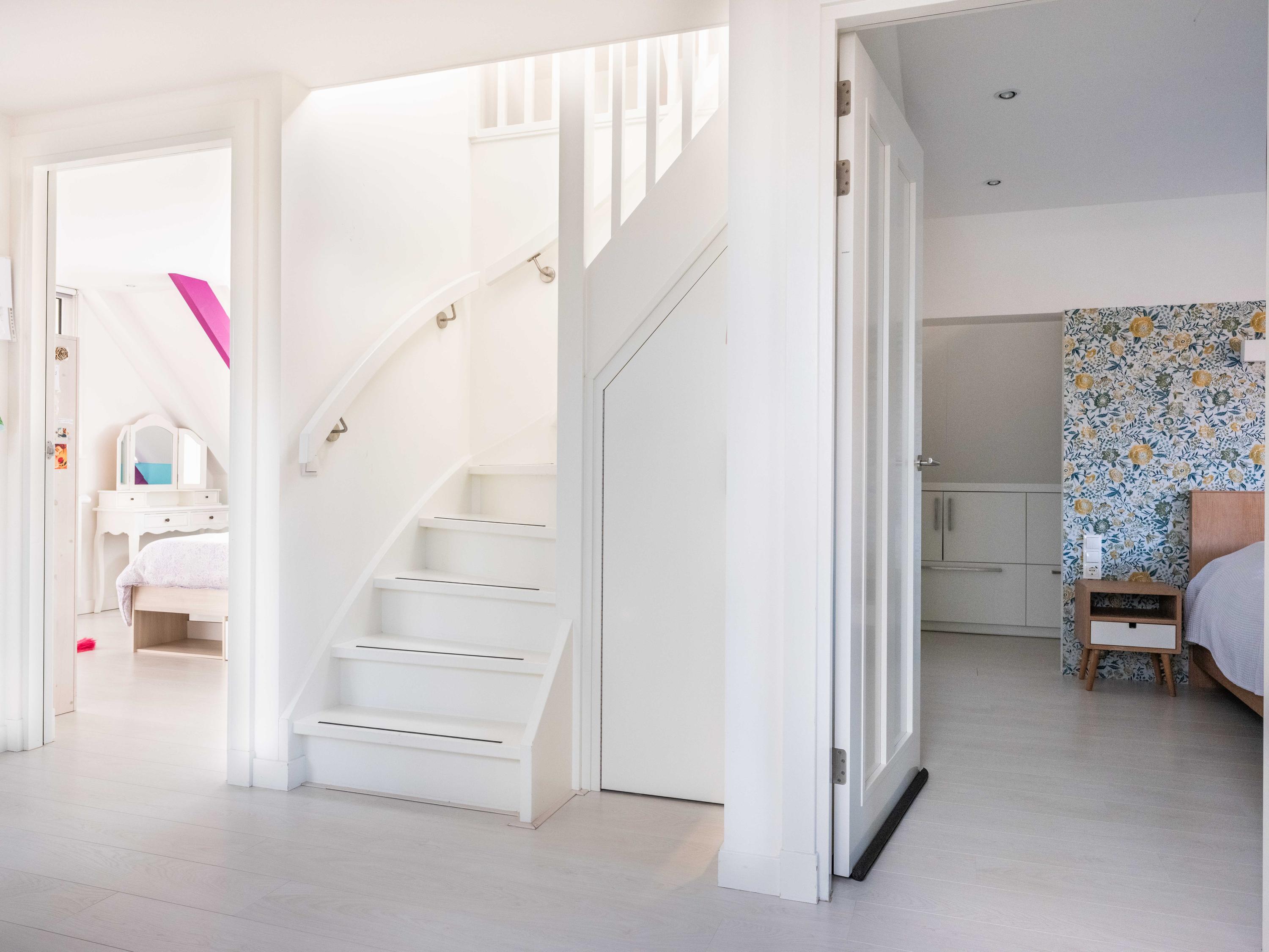 De tweede verdieping biedt nog meer ruimte: een grote overloop en twee kamers. Eén daarvan doet nu dienst als logeerkamer, de andere kamer bevat de cv-opstelling en kan eveneens als werkkamer worden gebruikt.