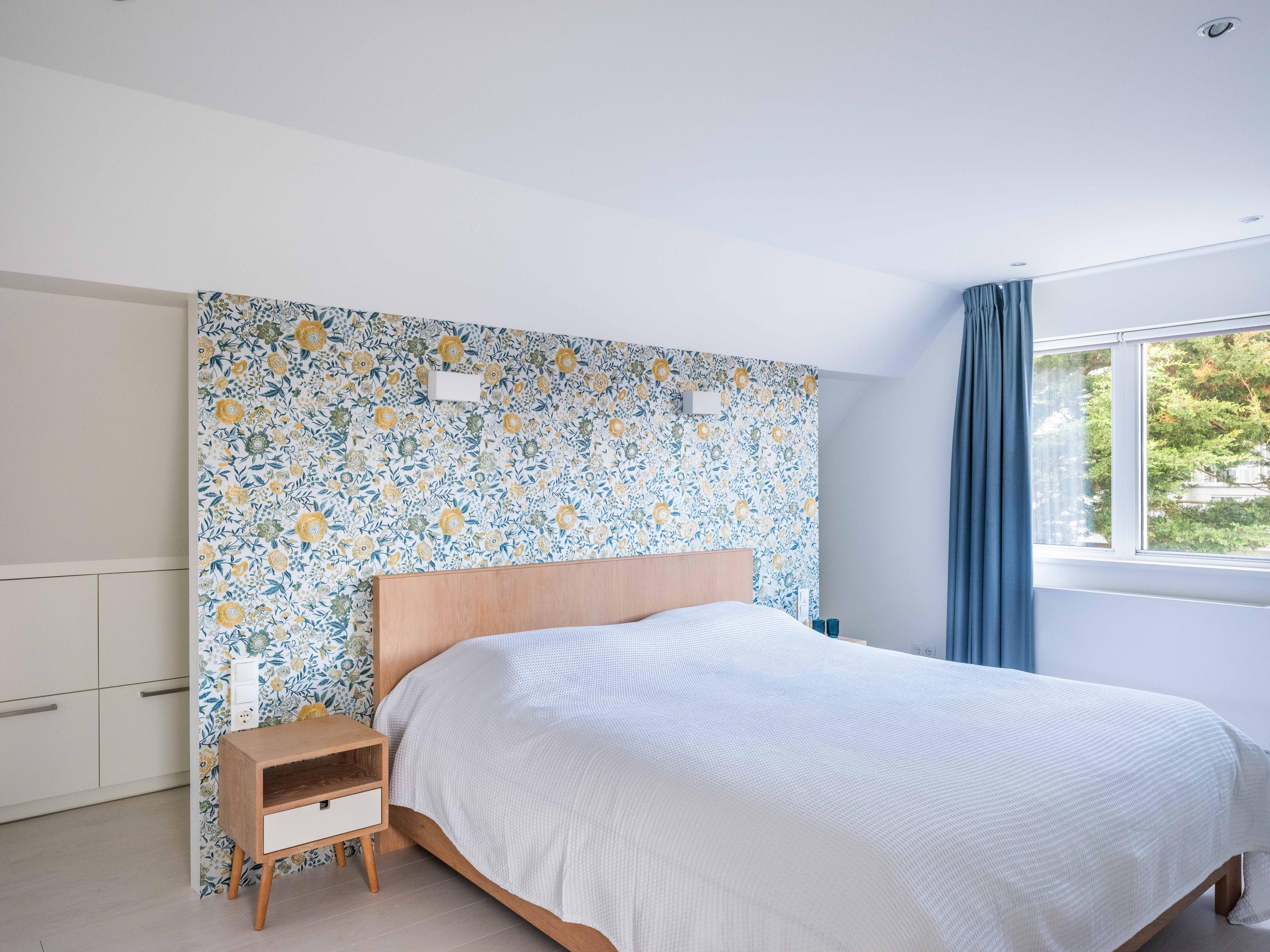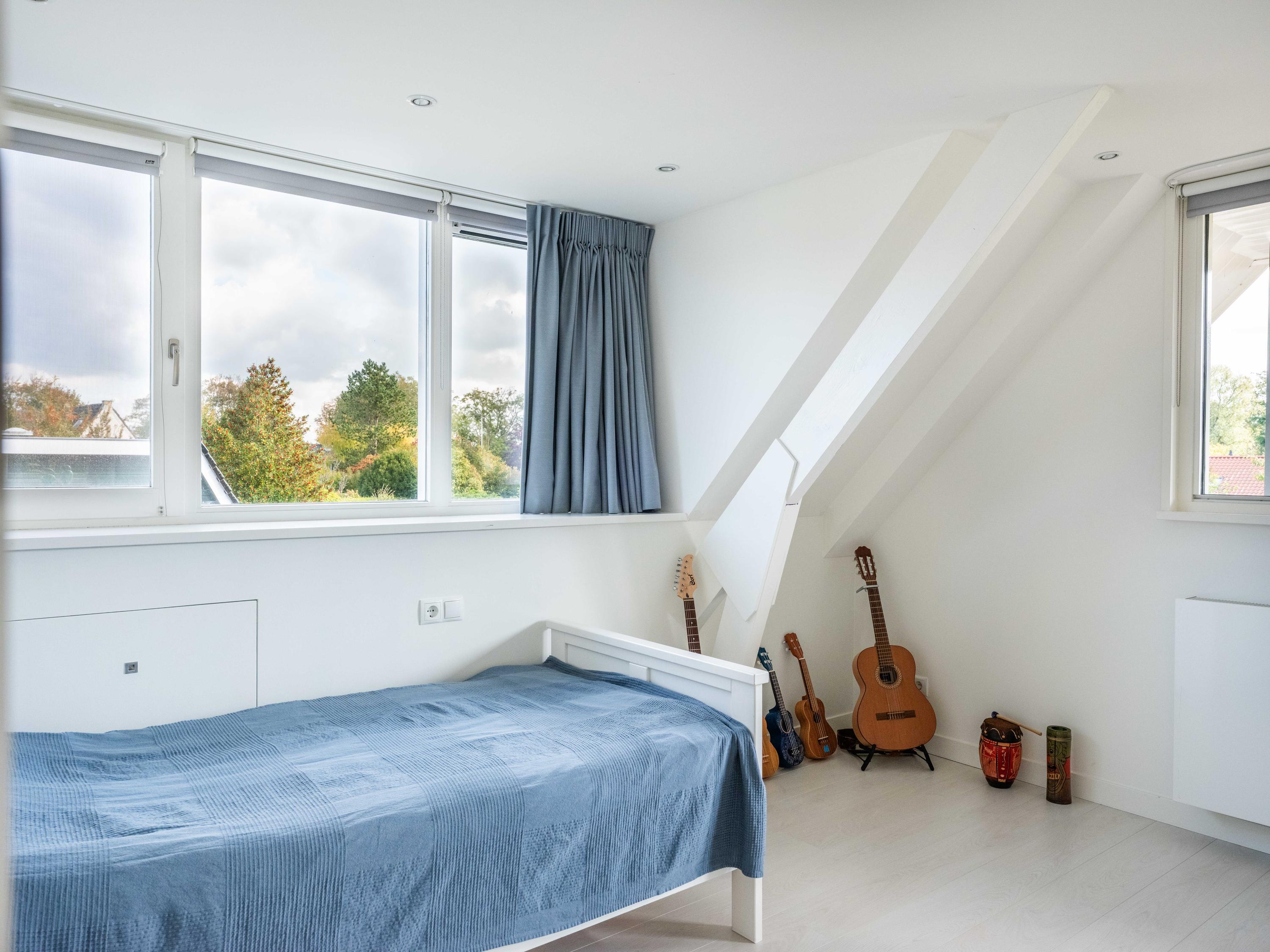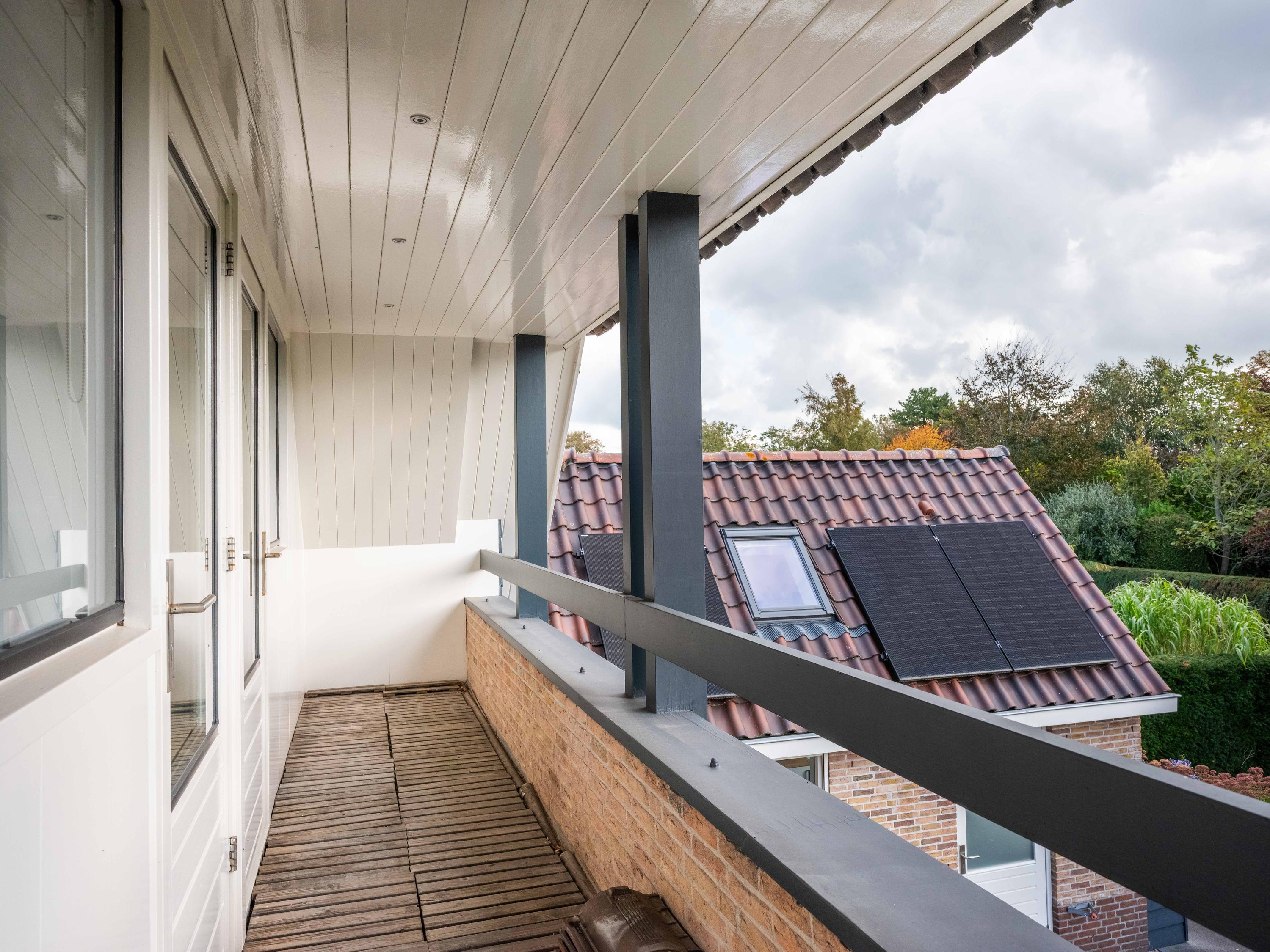 Op de eerste verdieping bevinden zich 3 slaapkamers en een ruime badkamer met dubbele wastafel, toilet, ligbad en een royale dubbele inloopdouche. Ook hier is vloerverwarming aanwezig, evenals een radiator. De grootste slaapkamer is ruim opgezet en beschikt over veel vaste kastruimte. Daarnaast zijn er nog twee lichte slaapkamers, beiden met vaste kasten en toegang tot een eigen balkon. Onder de trap naar zolder is nog een handige bergkast gesitueerd.