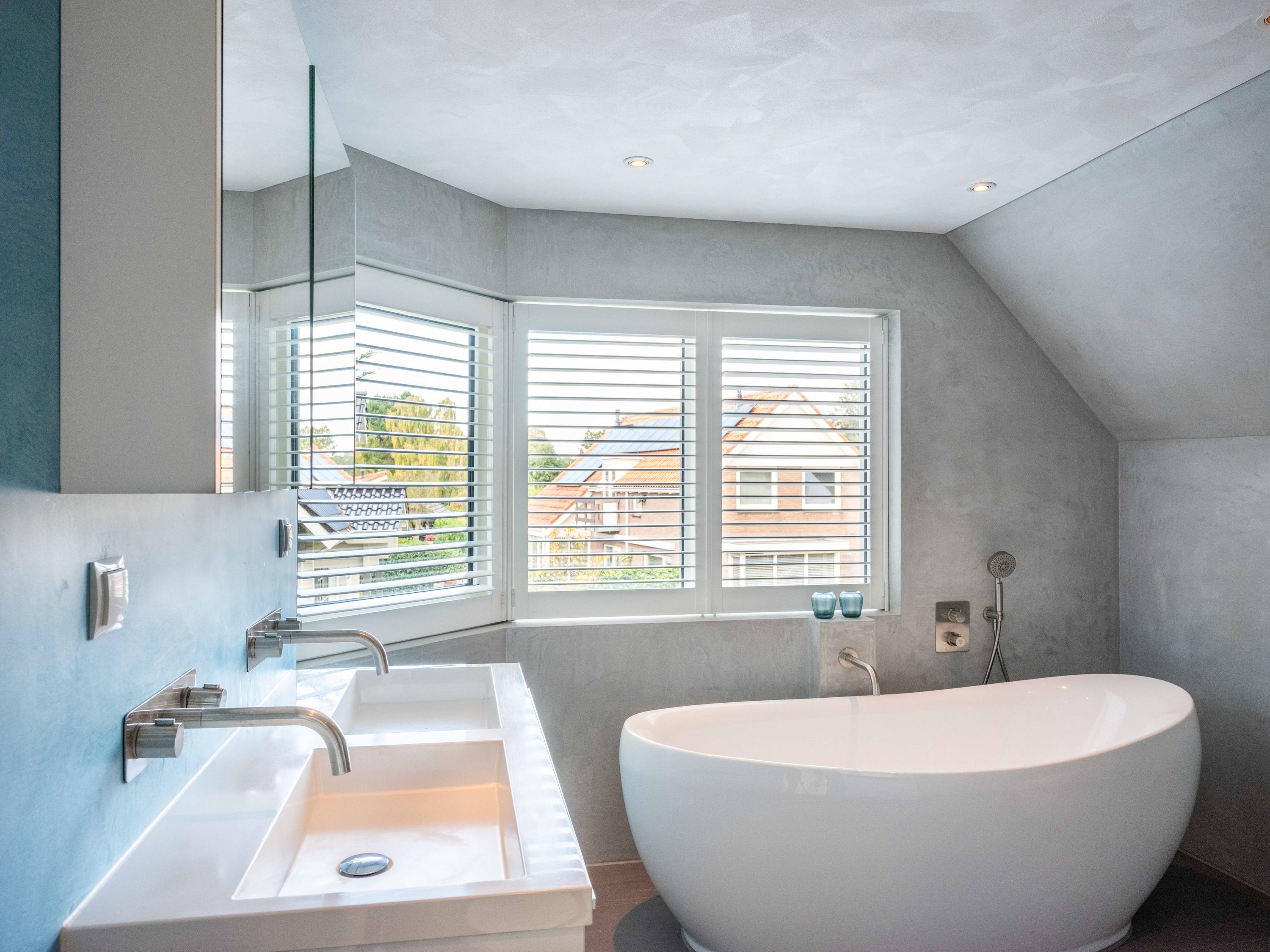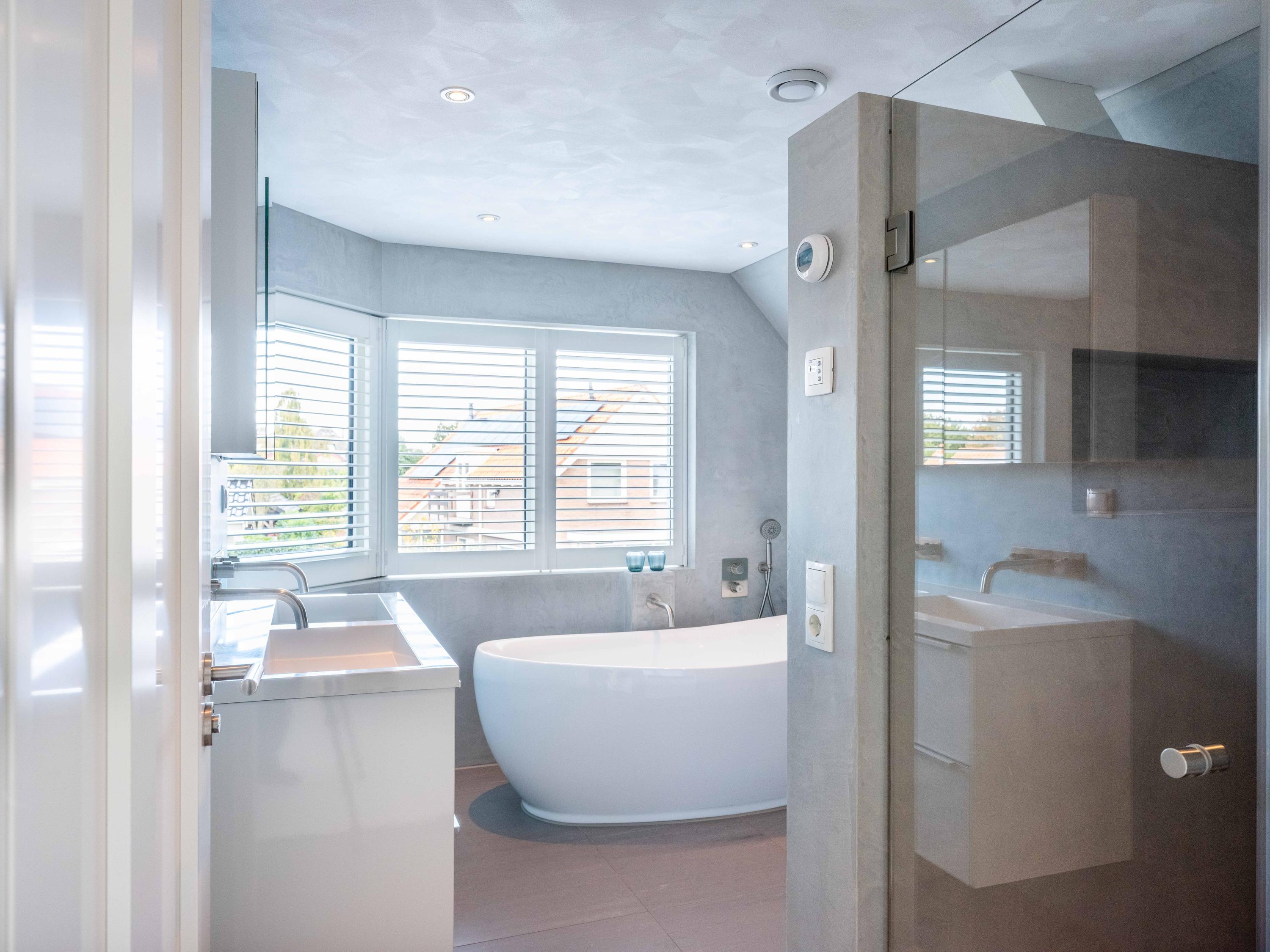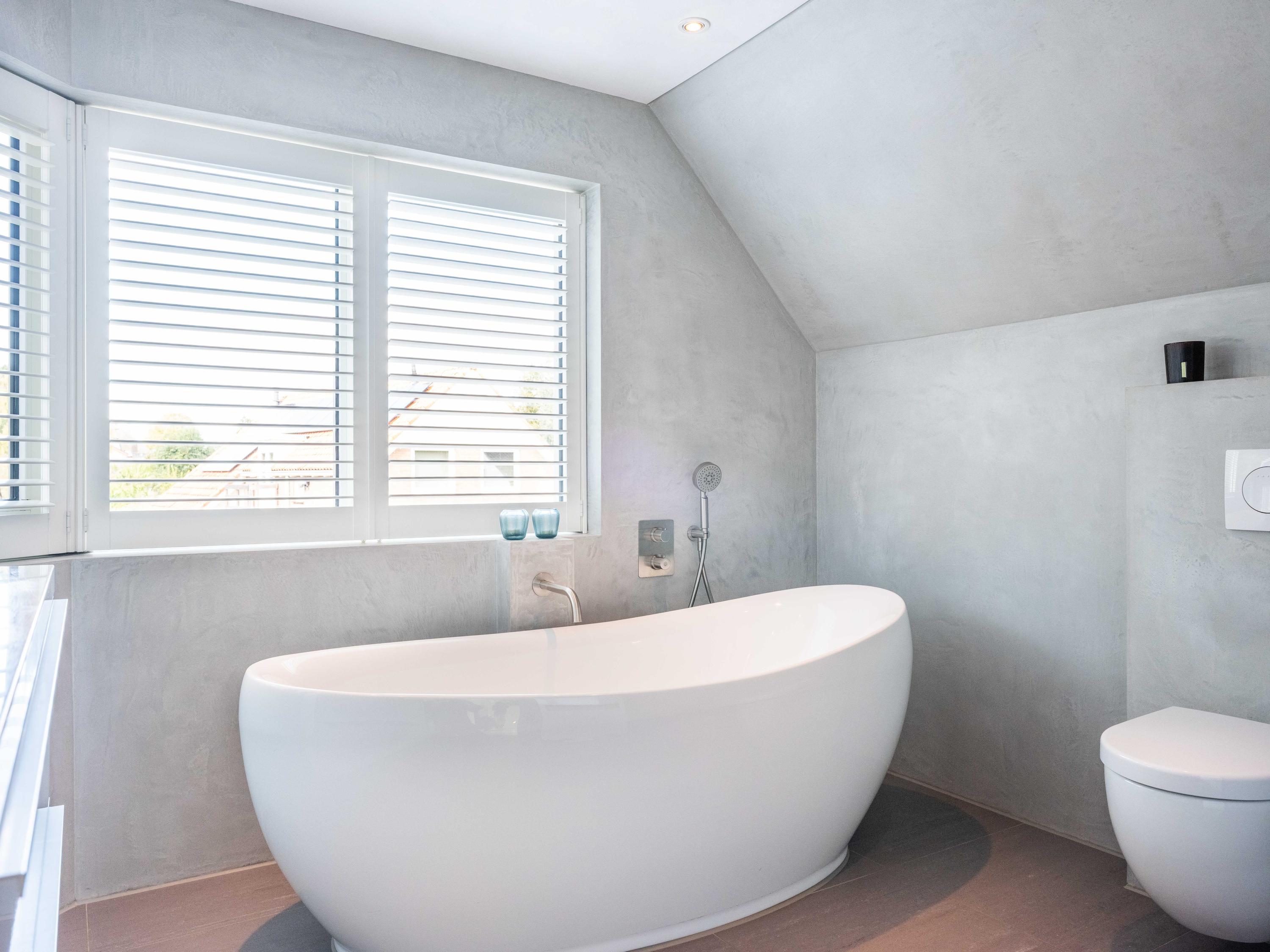 Op de eerste verdieping bevinden zich 3 slaapkamers en een ruime badkamer met dubbele wastafel, toilet, ligbad en een royale dubbele inloopdouche. Ook hier is vloerverwarming aanwezig, evenals een radiator. De grootste slaapkamer is ruim opgezet en beschikt over veel vaste kastruimte. Daarnaast zijn er nog twee lichte slaapkamers, beiden met vaste kasten en toegang tot een eigen balkon. Onder de trap naar zolder is nog een handige bergkast gesitueerd.