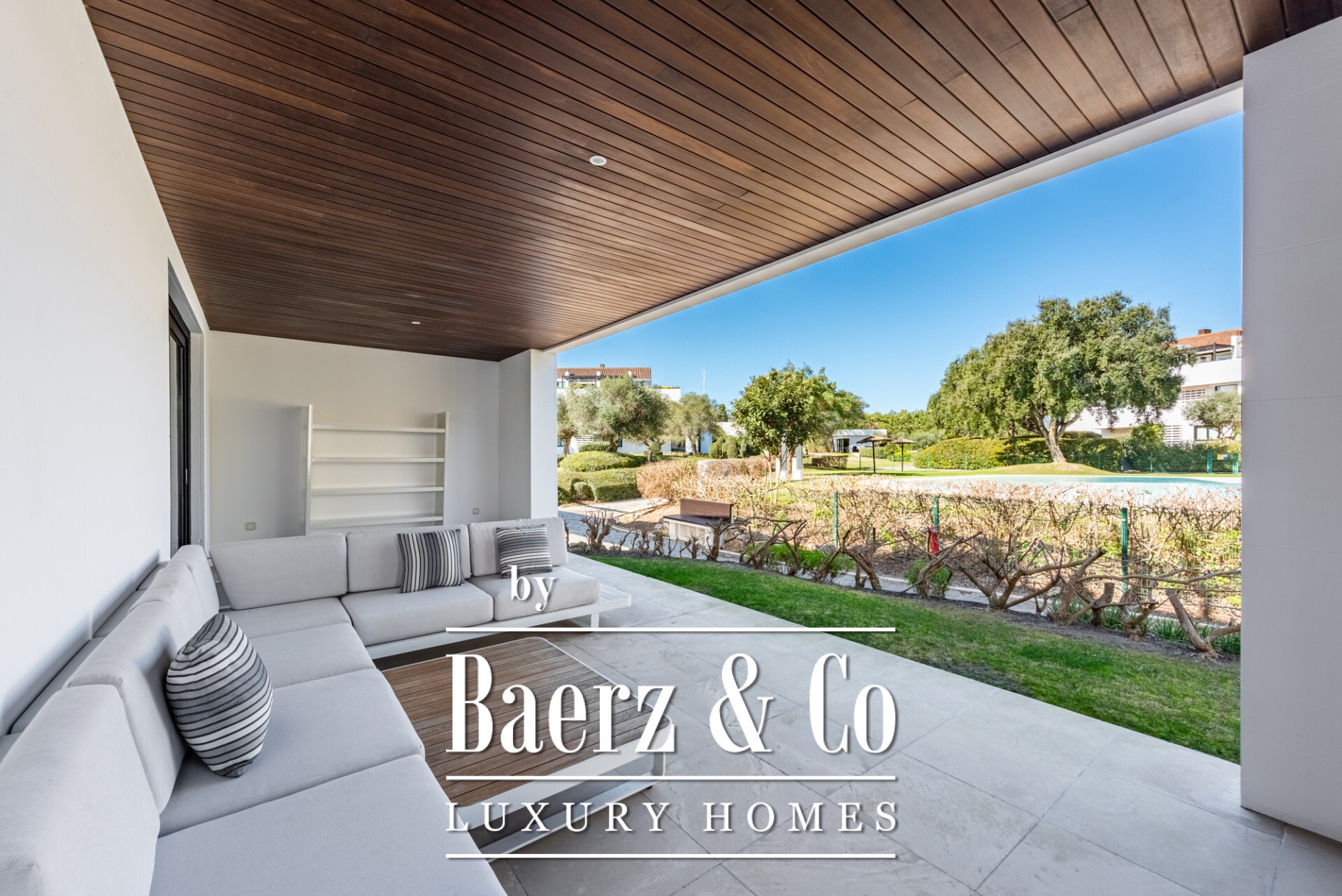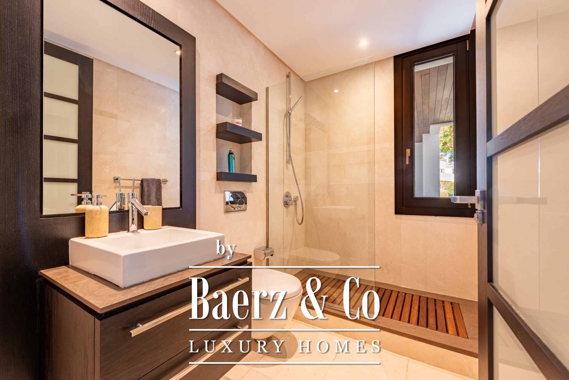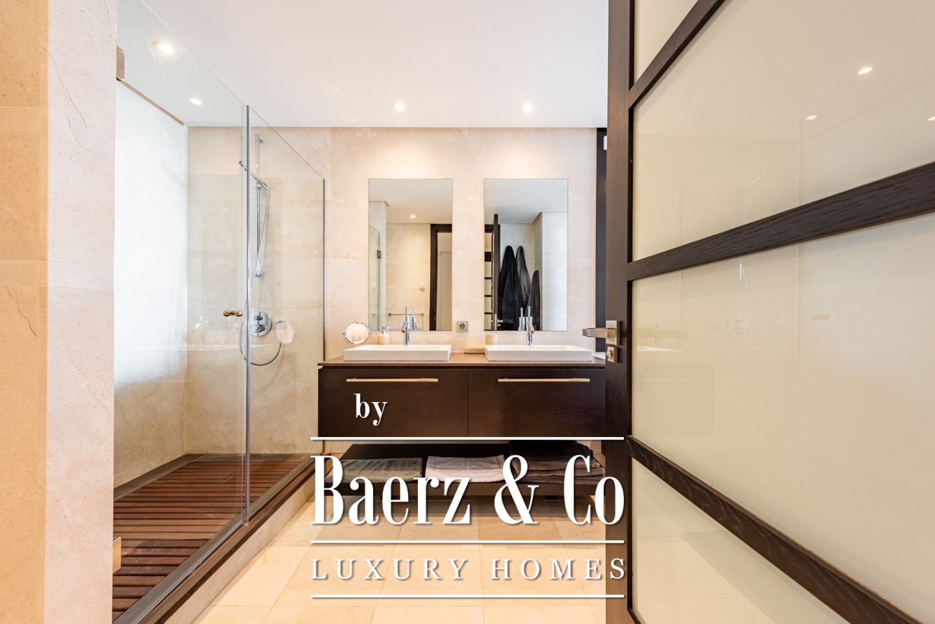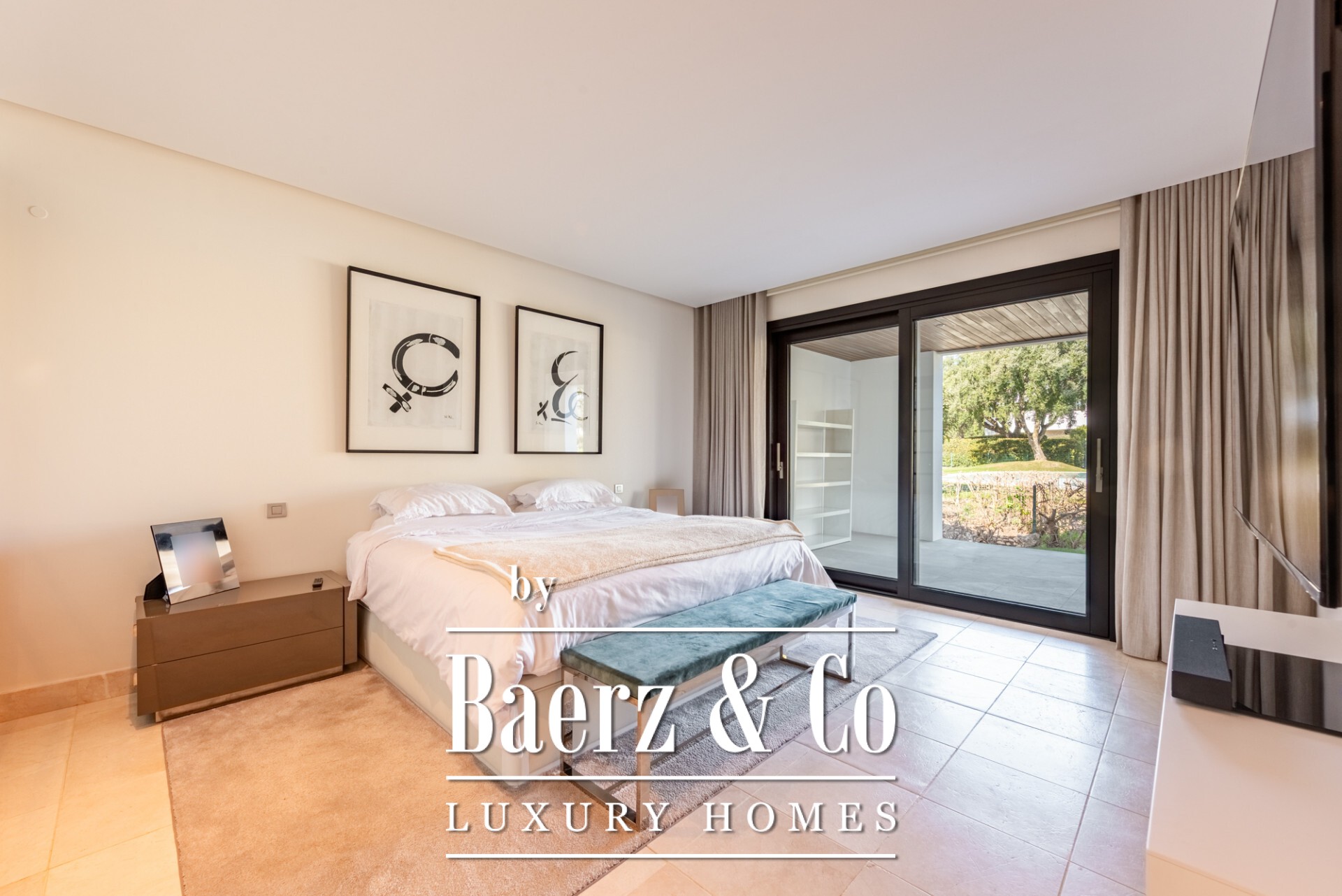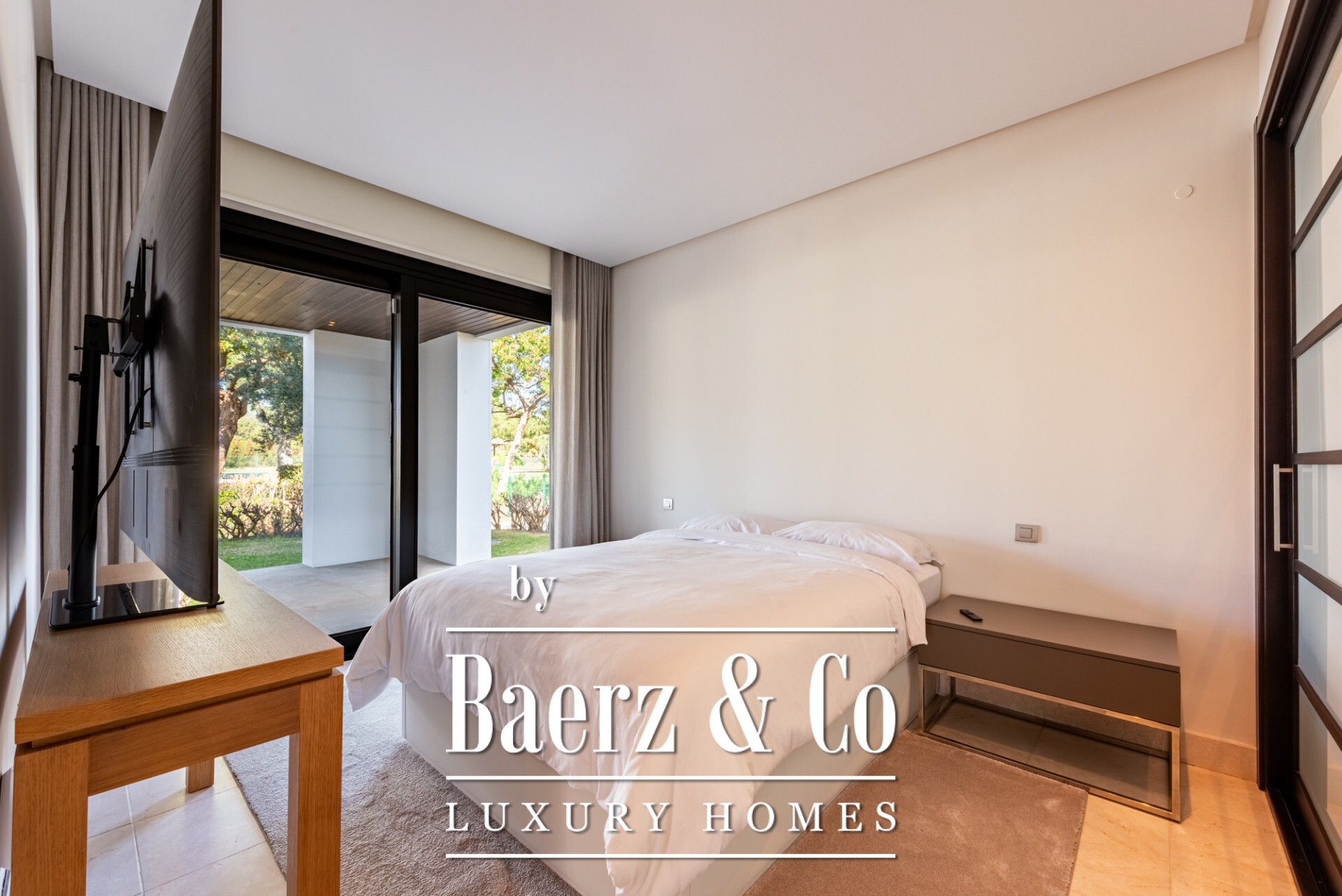 The property is a three-bedroom ground floor apartment, with all bedrooms featuring en-suite bathrooms. The interior offers large, well-proportioned living spaces finished with high-quality materials throughout. The apartment is equipped with air conditioning, underfloor heating, marble floors, a fully fitted kitchen, built-in wardrobes, and top-quality appliances. Home automation and advanced security systems are integrated to ensure comfort and peace of mind.
