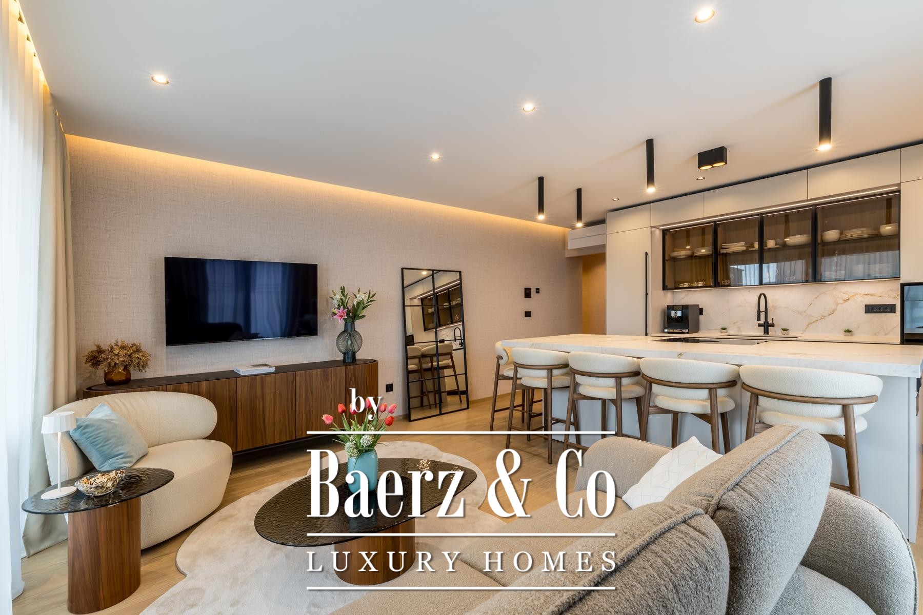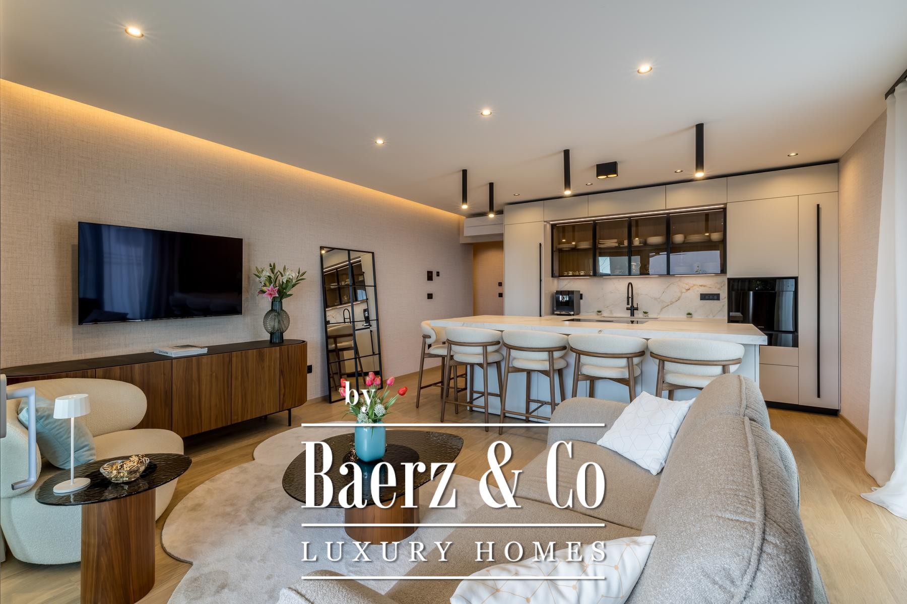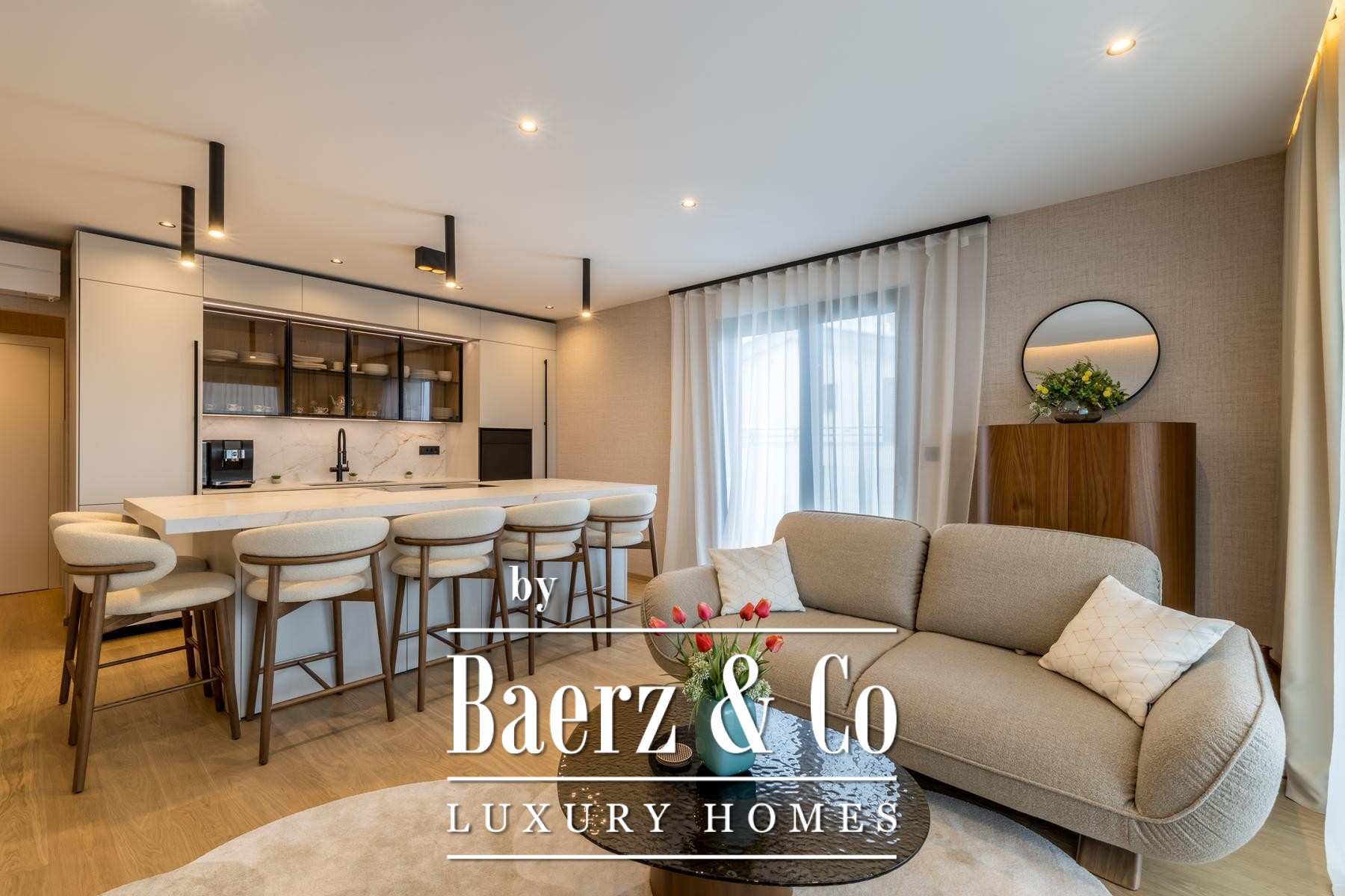 Het interieur wordt gekenmerkt door een open leefruimte waarin keuken, eetgedeelte en zithoek naadloos samenkomen onder ruim zuidelijk licht. De op maat gemaakte keuken is uitgerust met Miele- en Bora-apparatuur, een kookeiland, geïntegreerd waterfilter en ingebouwd afvalverwijderingssysteem. De doordachte plattegrond omvat een entreehal, gastentoilet, slaapkamer met toegang tot het balkon en een master suite met privébadkamer en inloopkast.