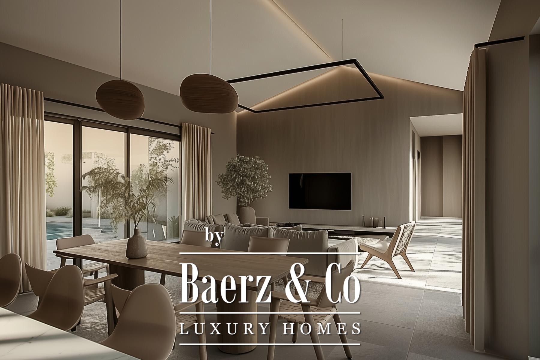 Het interieur wordt gekenmerkt door zorgvuldige balans tussen volumes en licht – van de ruime open woonkamer met eetgedeelte tot de eigentijdse keuken. Drie slaapkamers, elk met een luxueus afgewerkte en-suite badkamer, sluiten harmonieus aan op de leefruimtes. Daarnaast beschikt de villa over een privéfitness, gastentoilet en aparte berging. Het ontwerp bereikt een subtiele balans tussen vorm en functie en waarborgt rust en comfort in het hele huis.