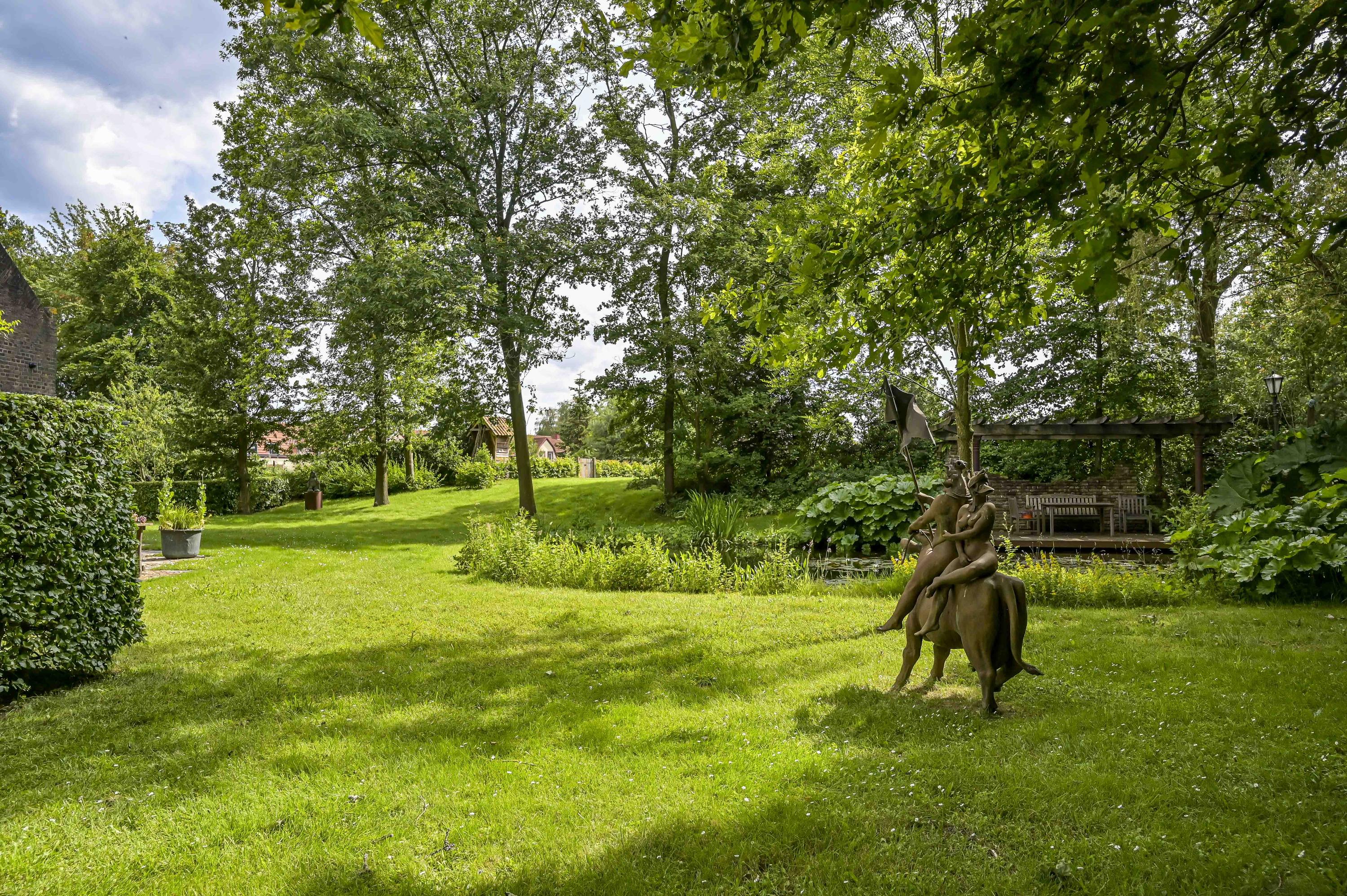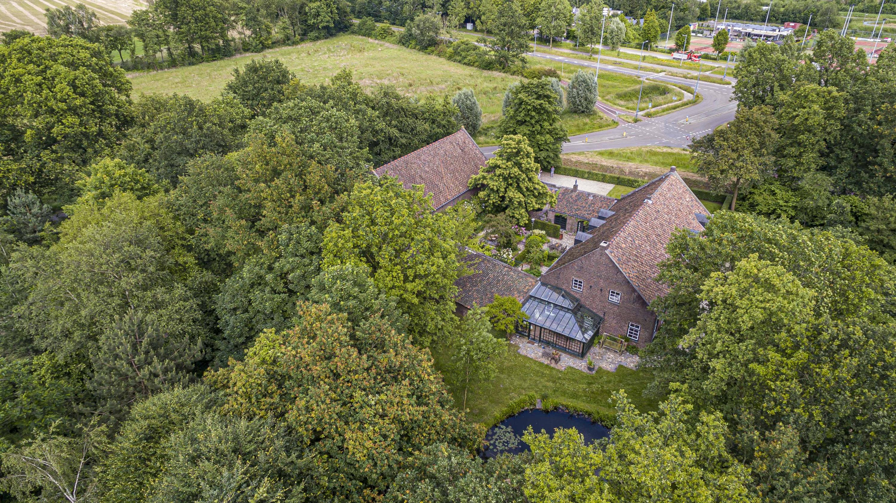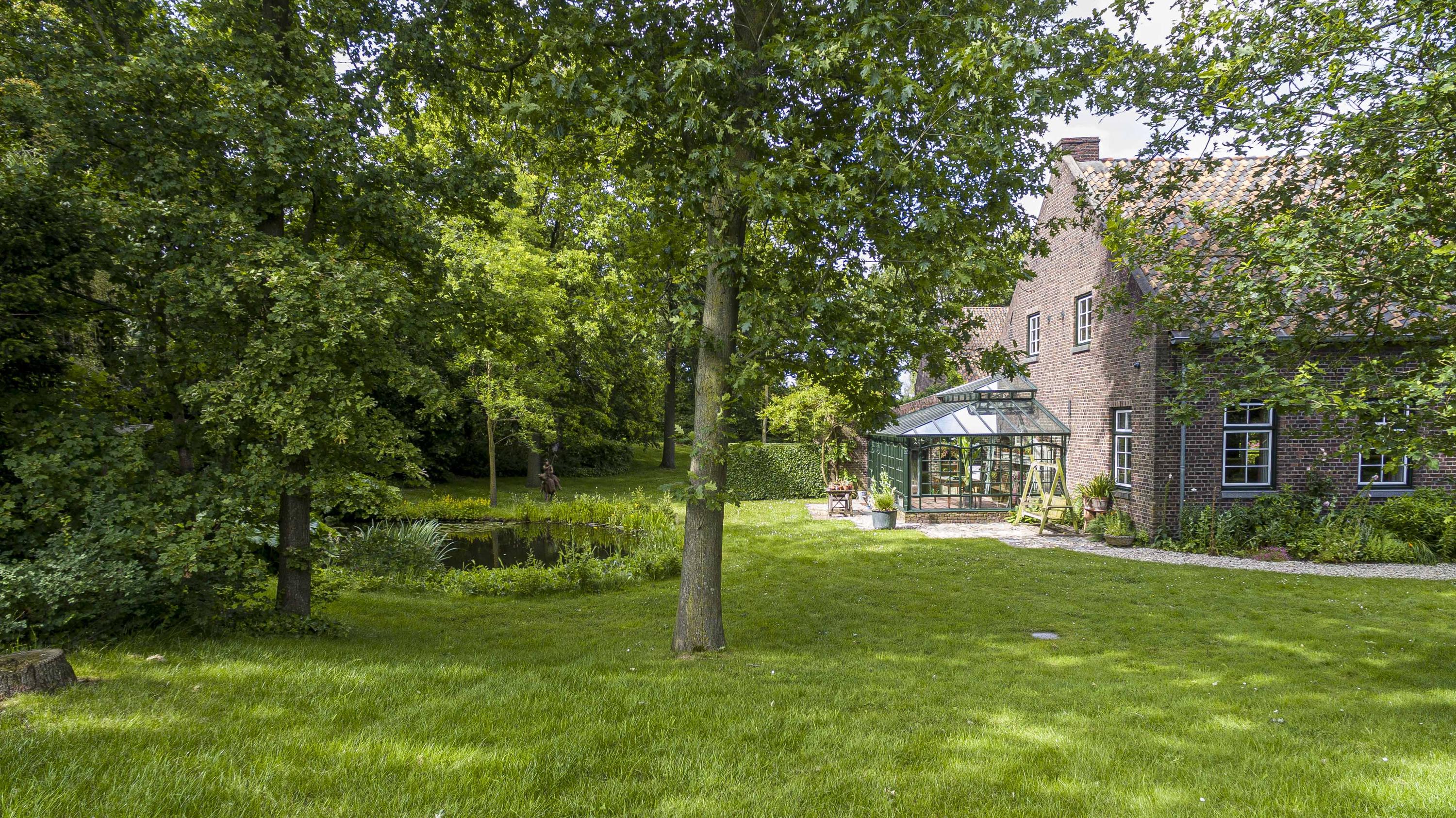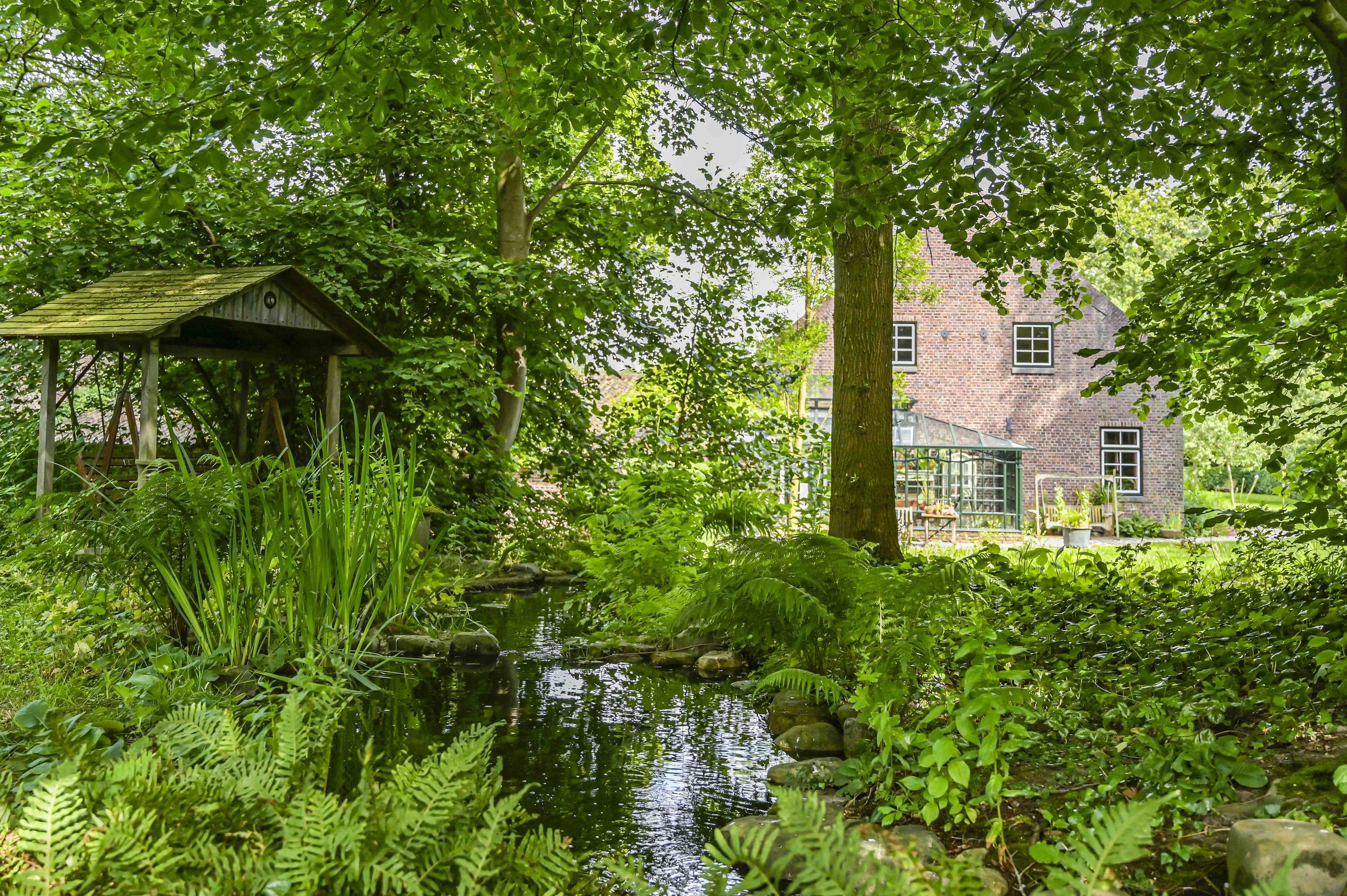 Uniek perceel van 7616m² met zeer veel groen, een royale vijver en diverse wandelpaden. U kunt hier heerlijk in eigen bostuin wandelen en toch waant u zich ergens anders. Het geheel zorgt voor een unieke flora en fauna op het terrein. Op het gehele perceel is een beregeningssysteem aanwezig. Op de vlonder bij de vijver kunt u aan het water rustig genieten van een zomerse avond. De oprijlaan met elektrische poort leidt u naar de monumentale woning.
