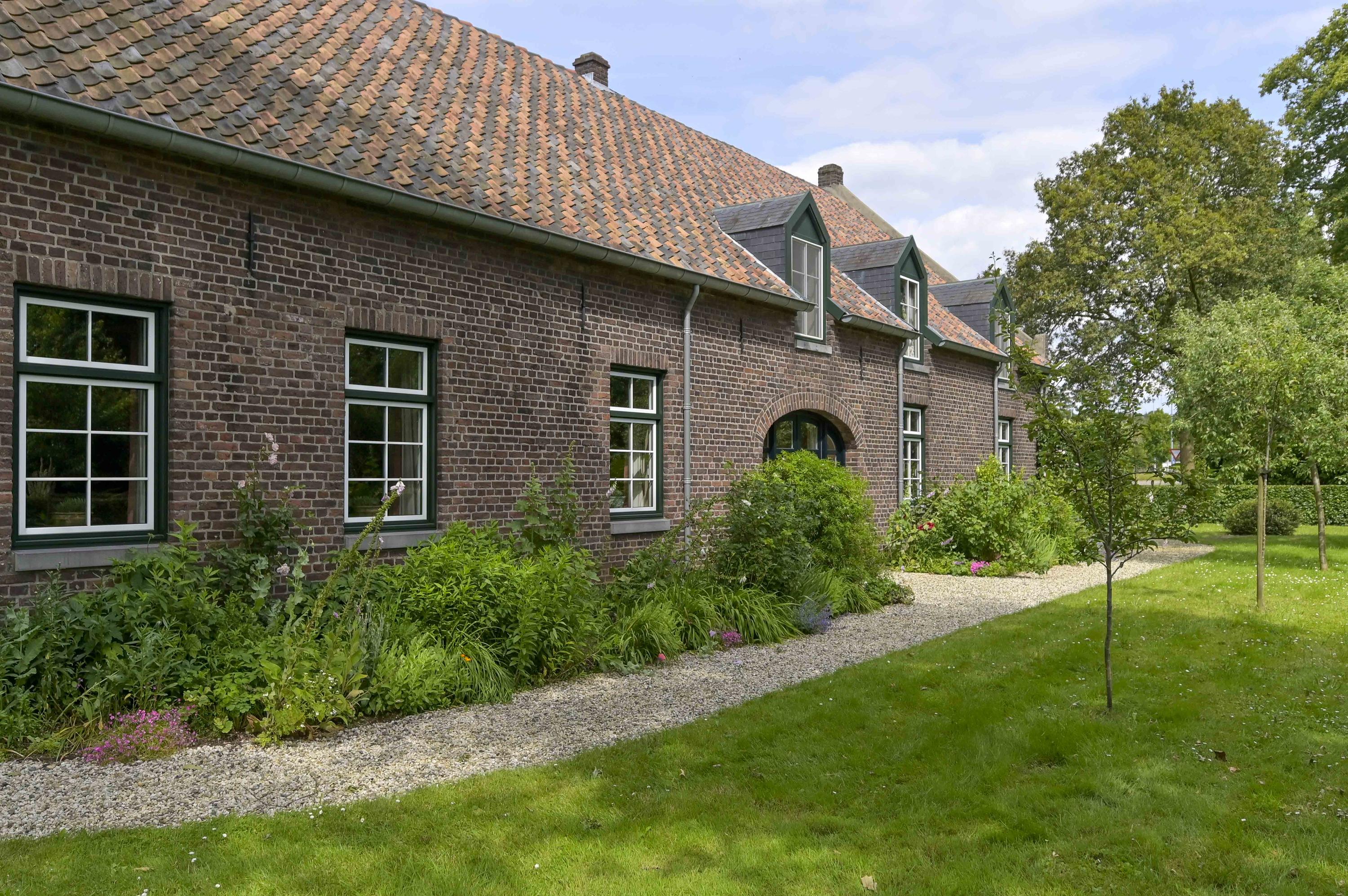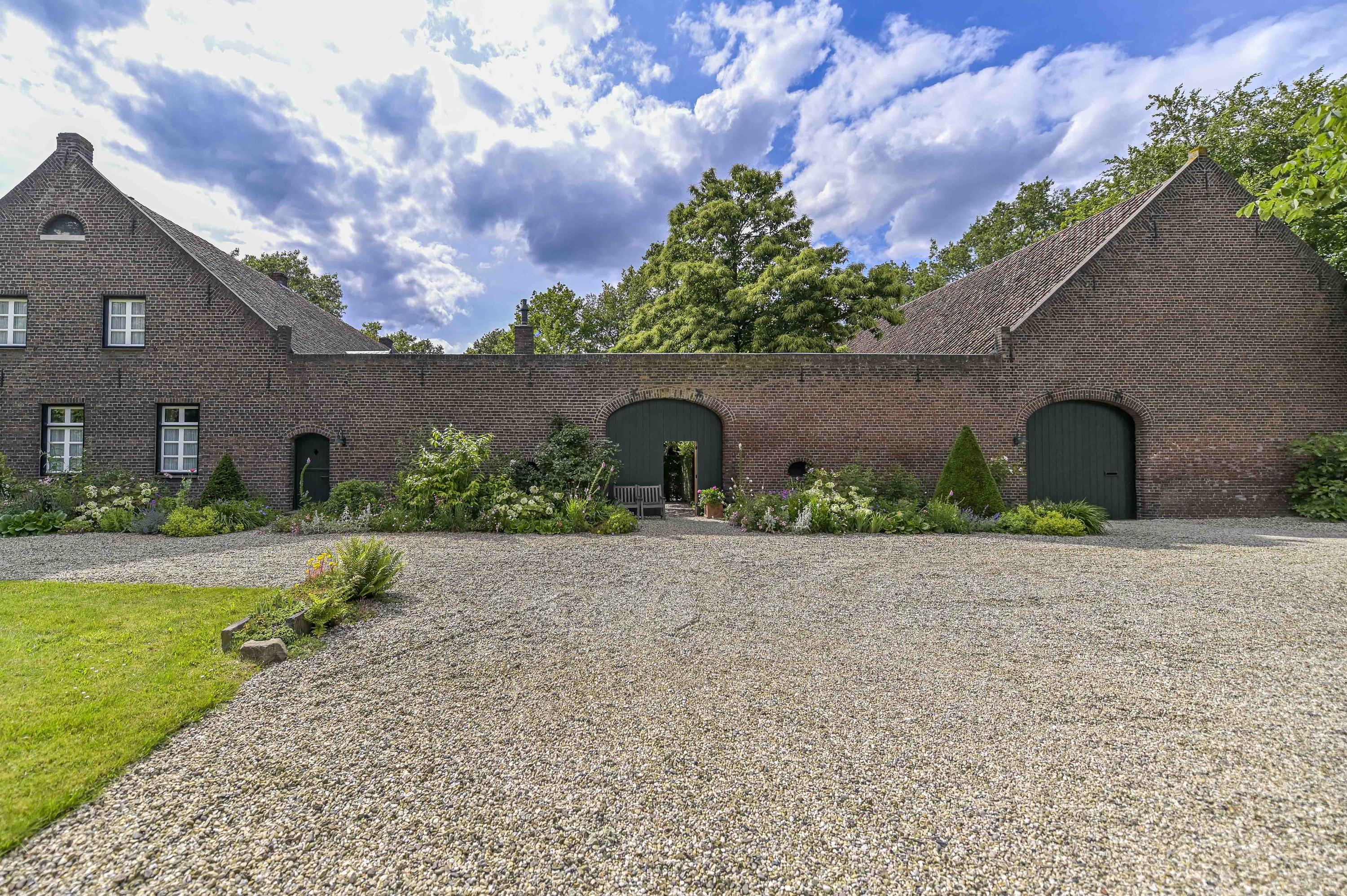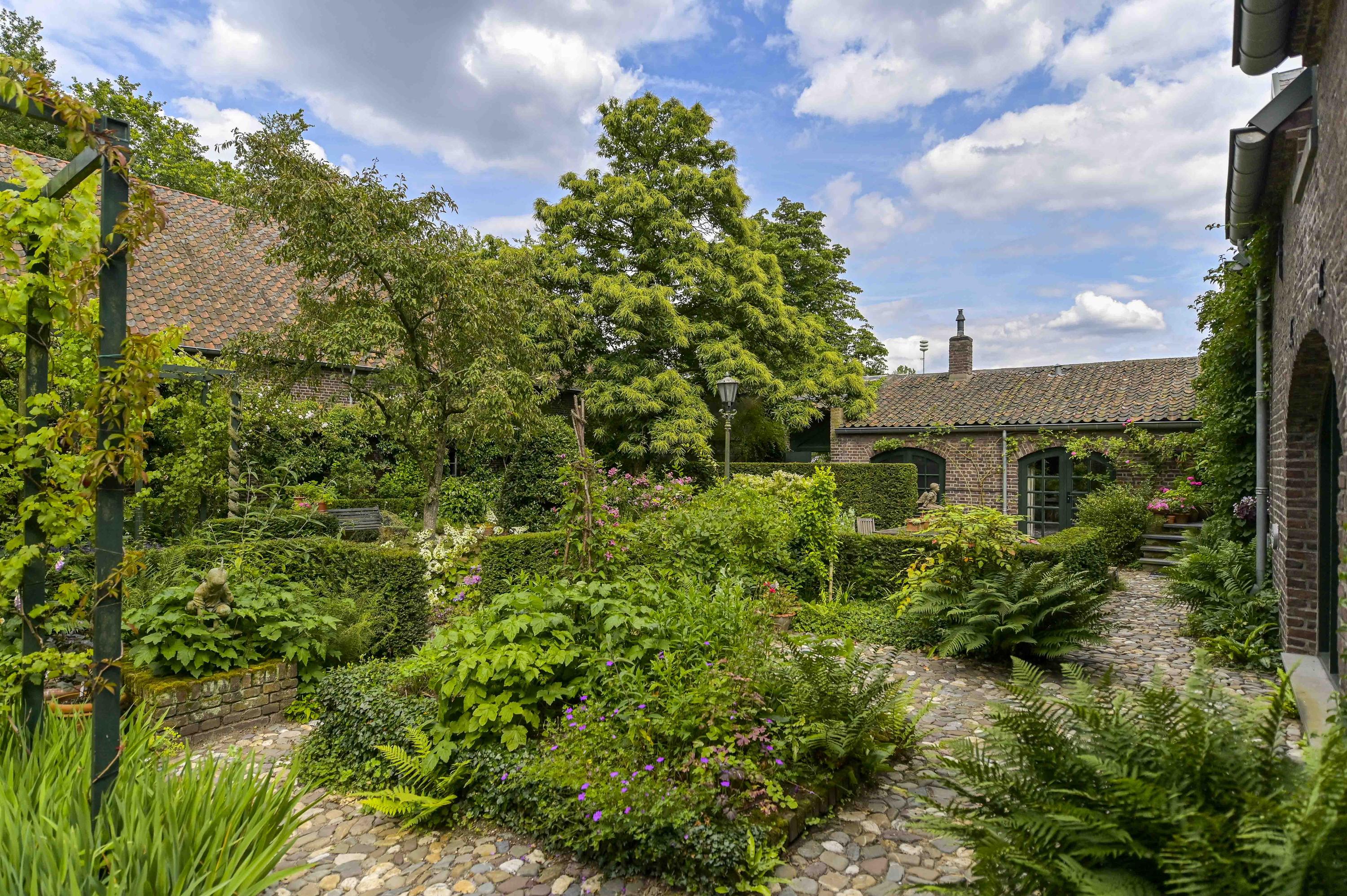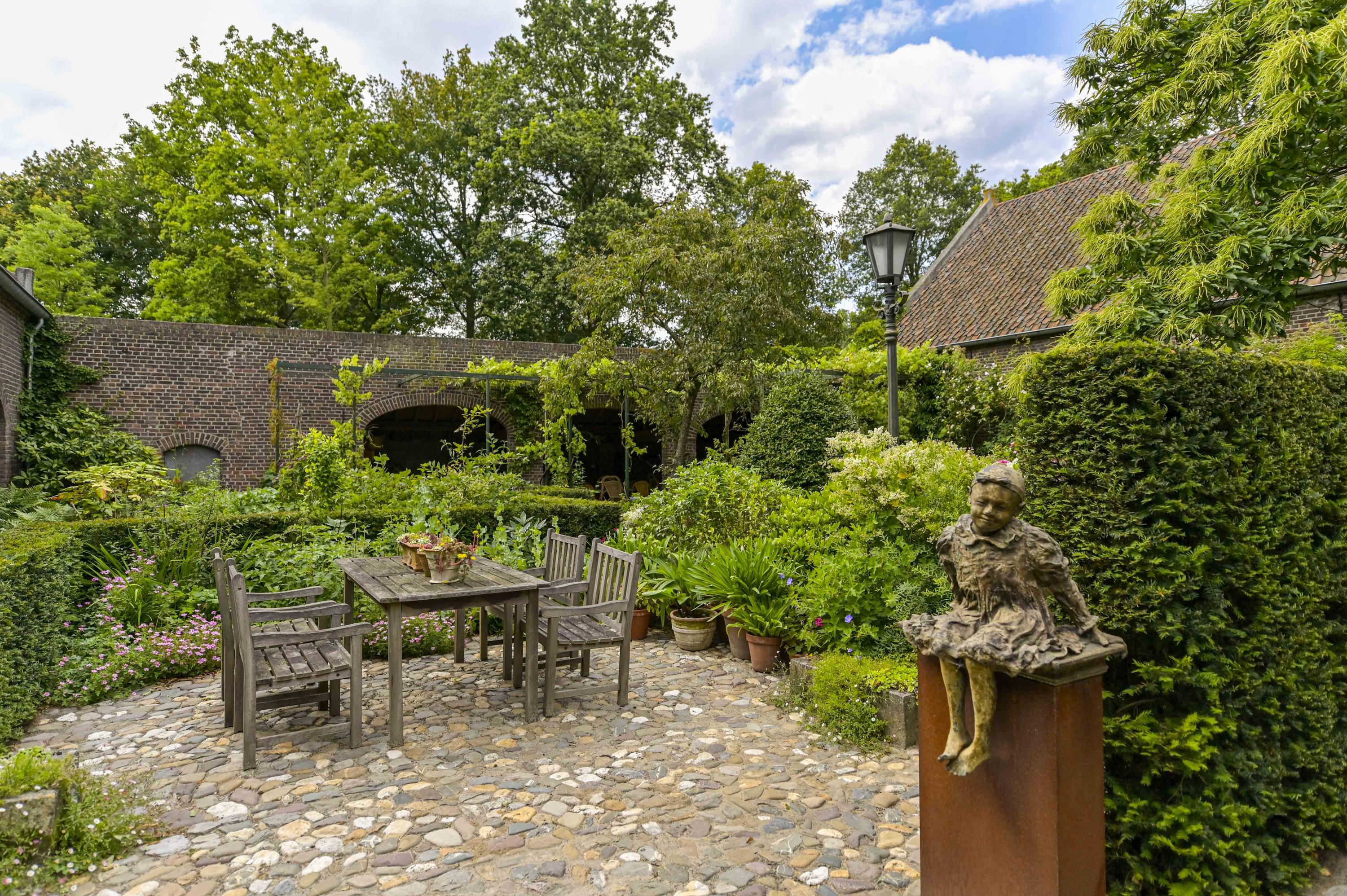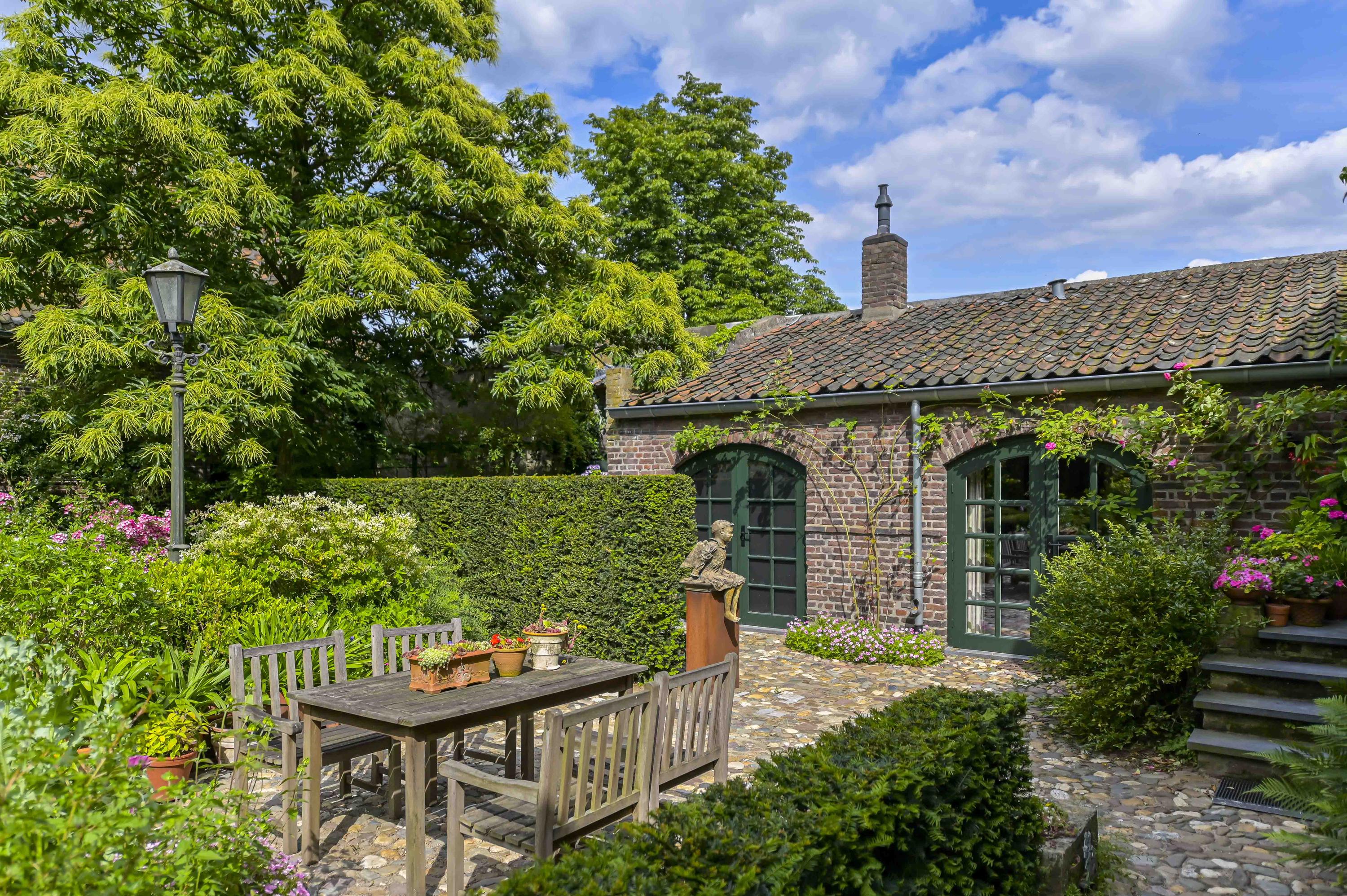 Prachtig aangelegde en zeer groene binnentuin met royale overkapping. Vanuit hier is de gehele carré boerderij zichtbaar. Alles is afgewerkt met zinken afvoeren en dakgoten.