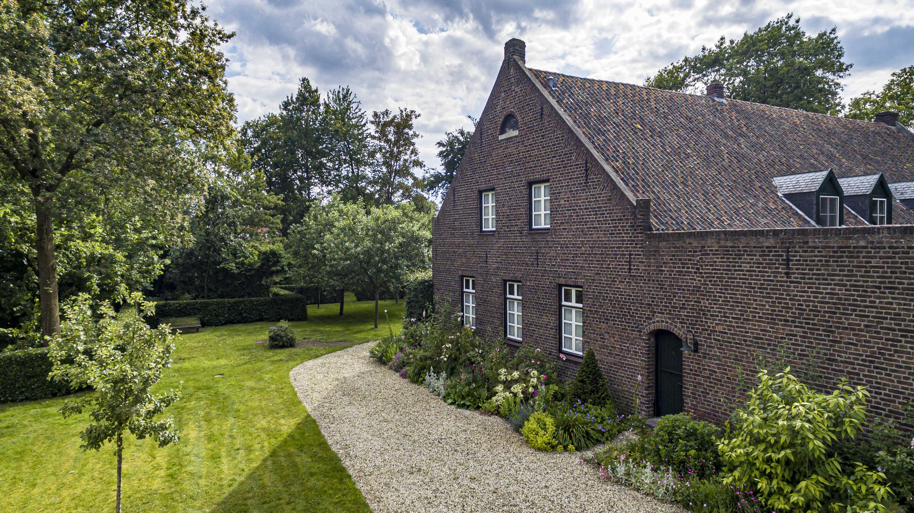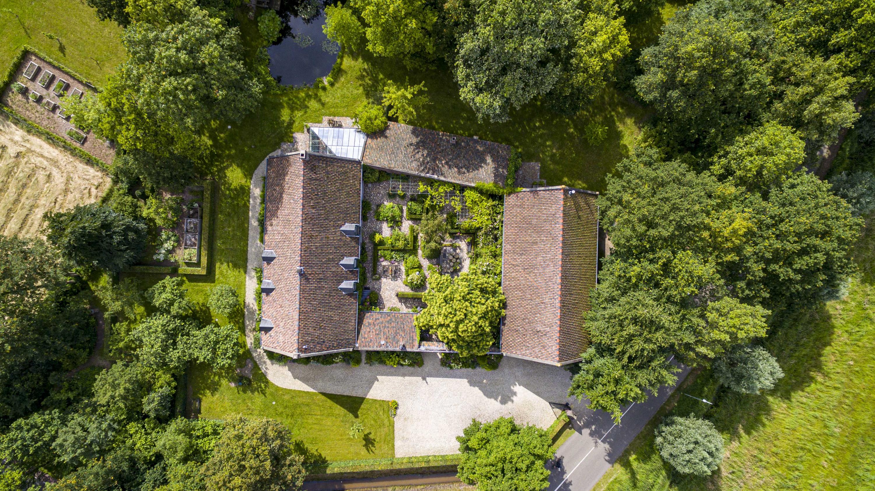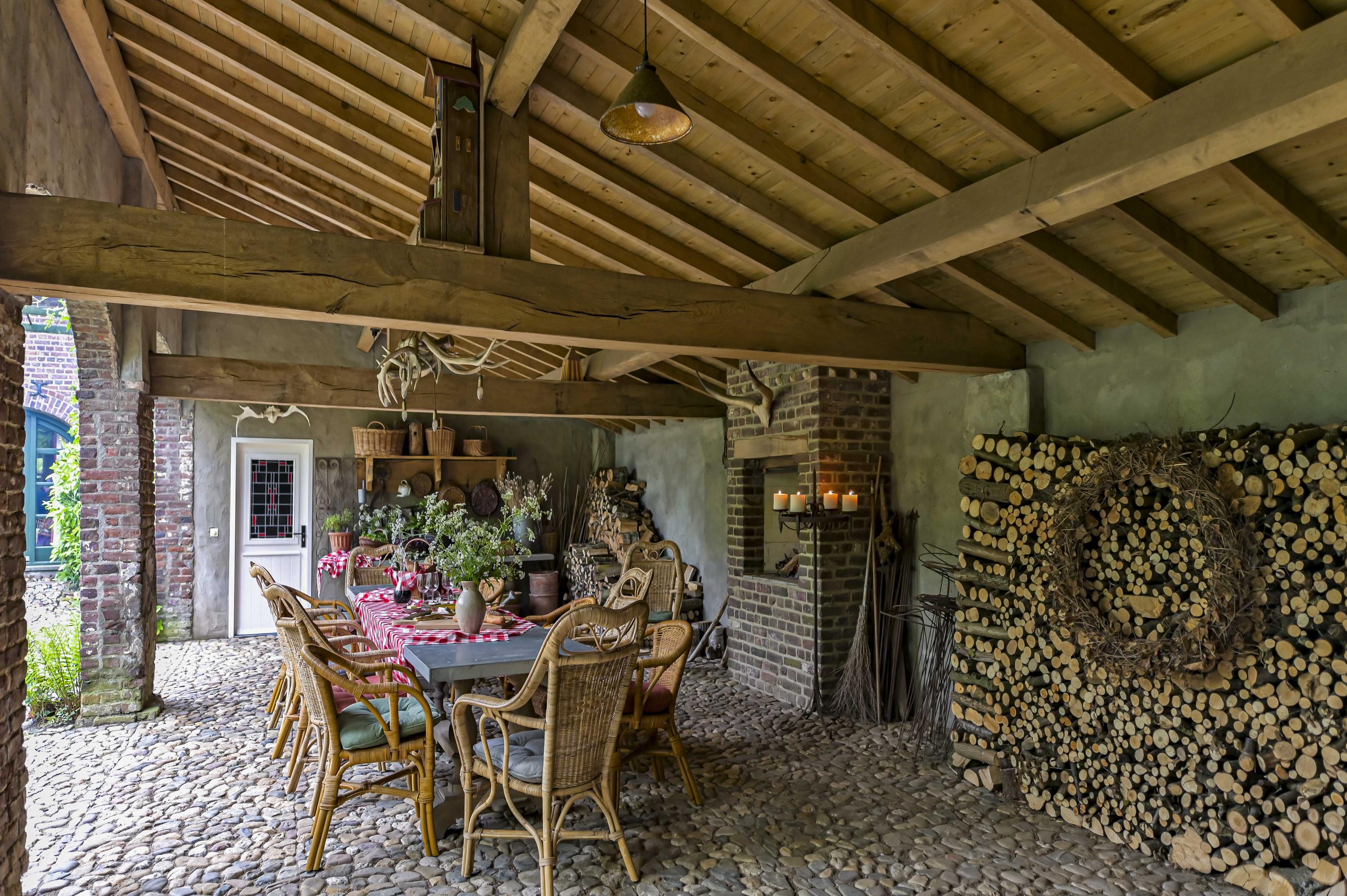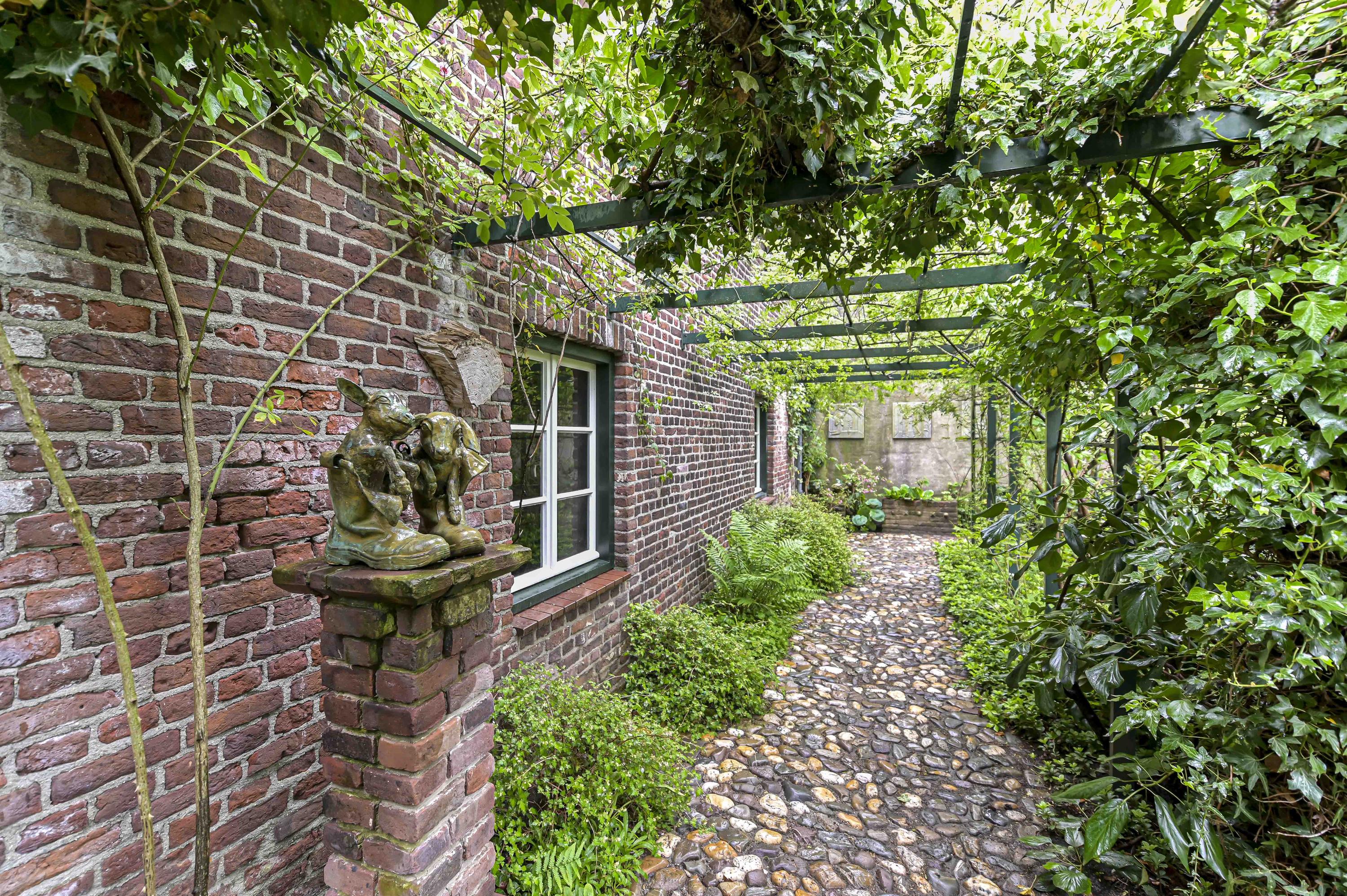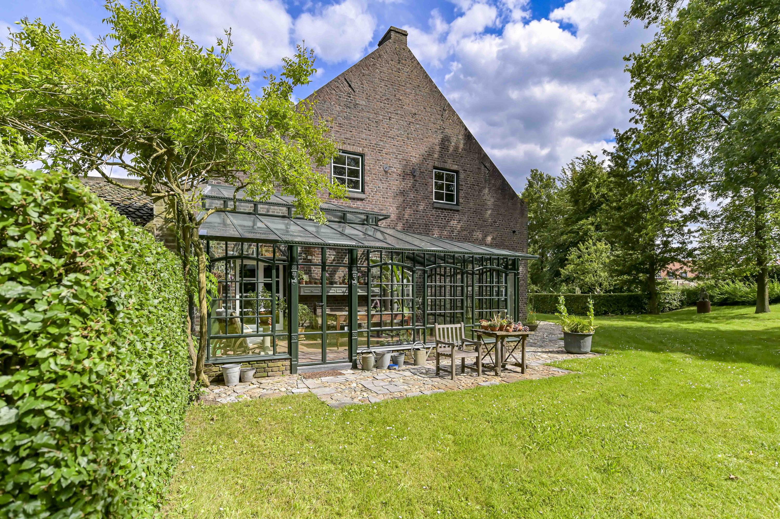 Prachtig aangelegde en zeer groene binnentuin met royale overkapping. Vanuit hier is de gehele carré boerderij zichtbaar. Alles is afgewerkt met zinken afvoeren en dakgoten.