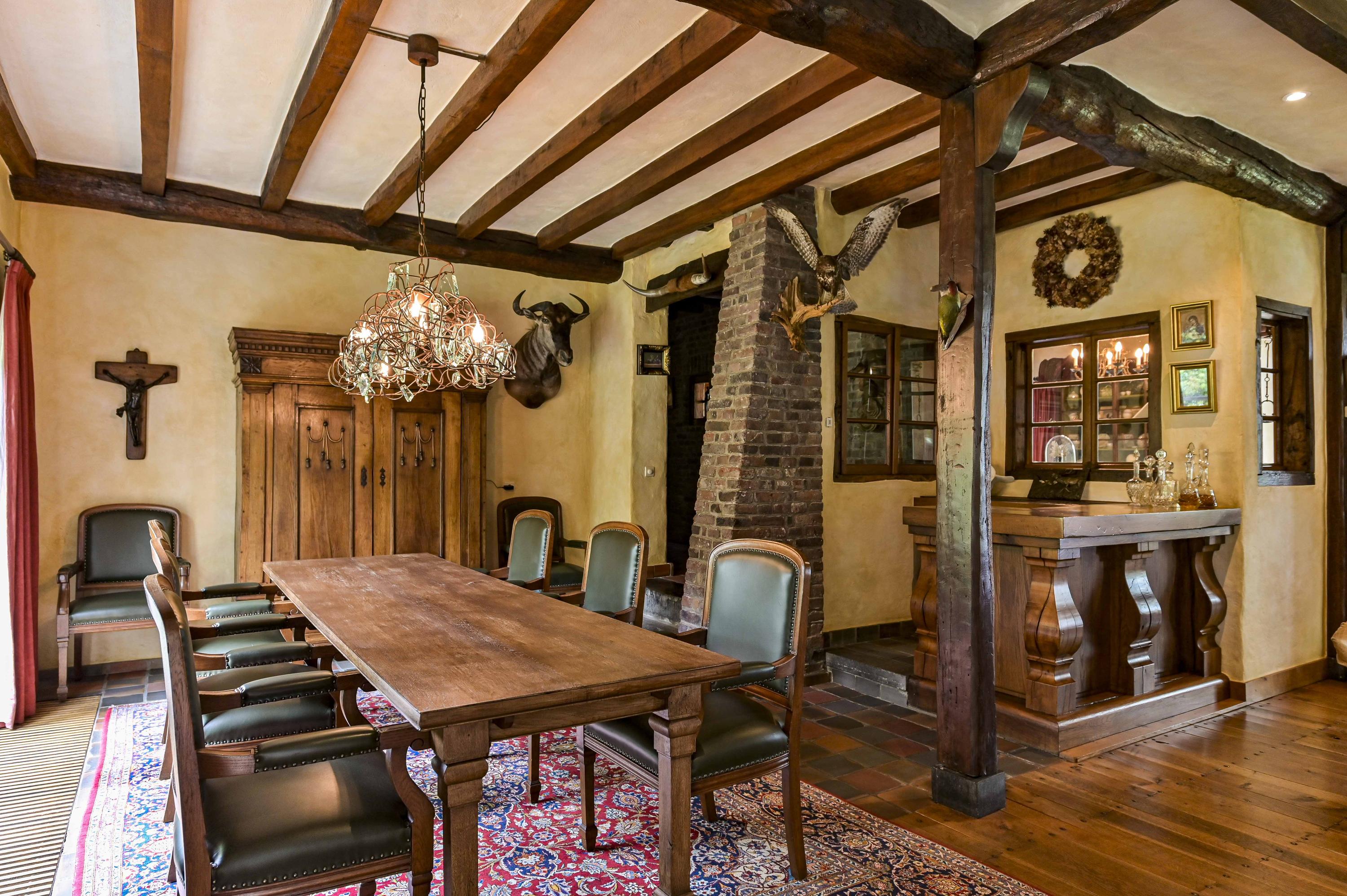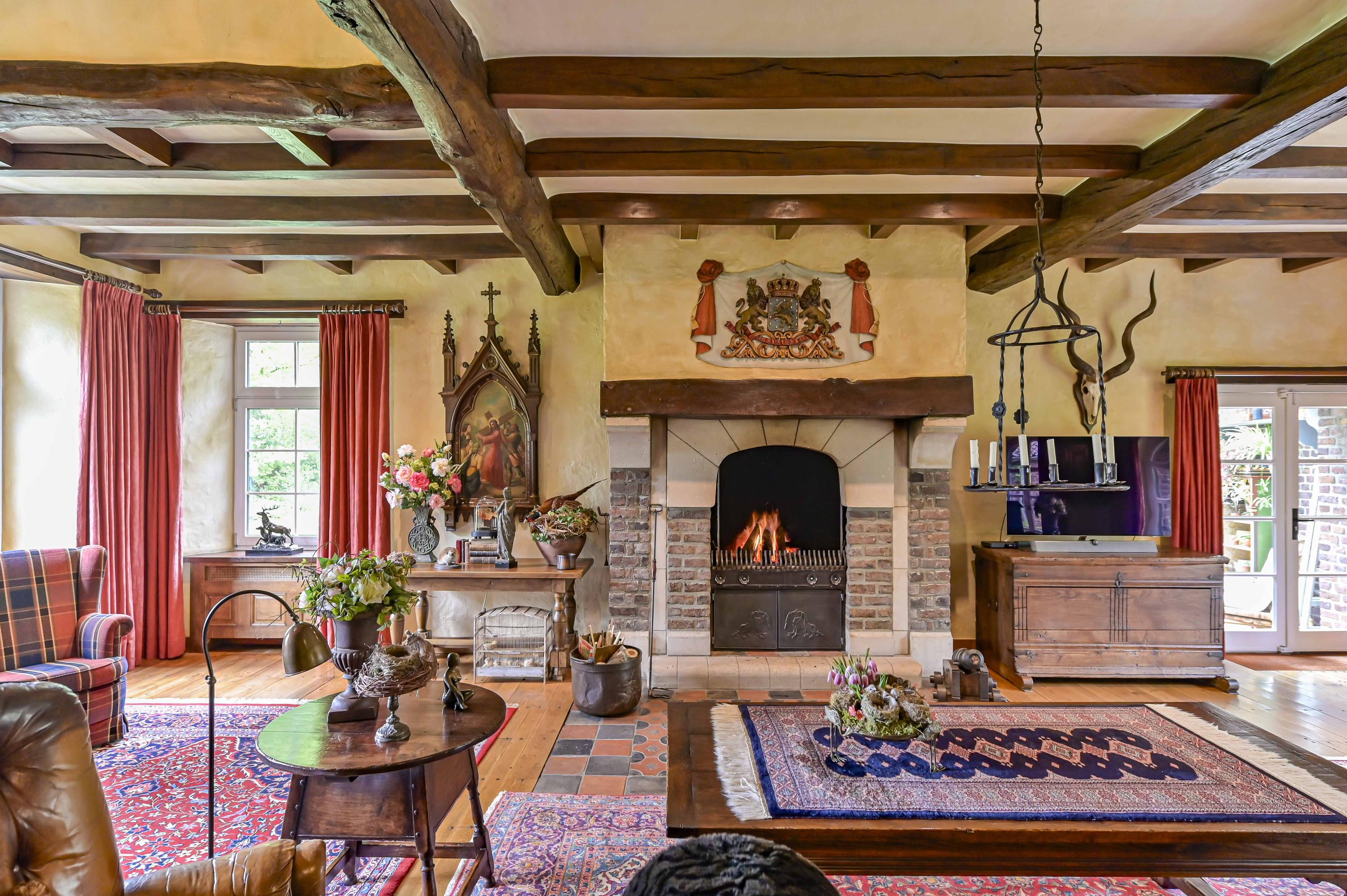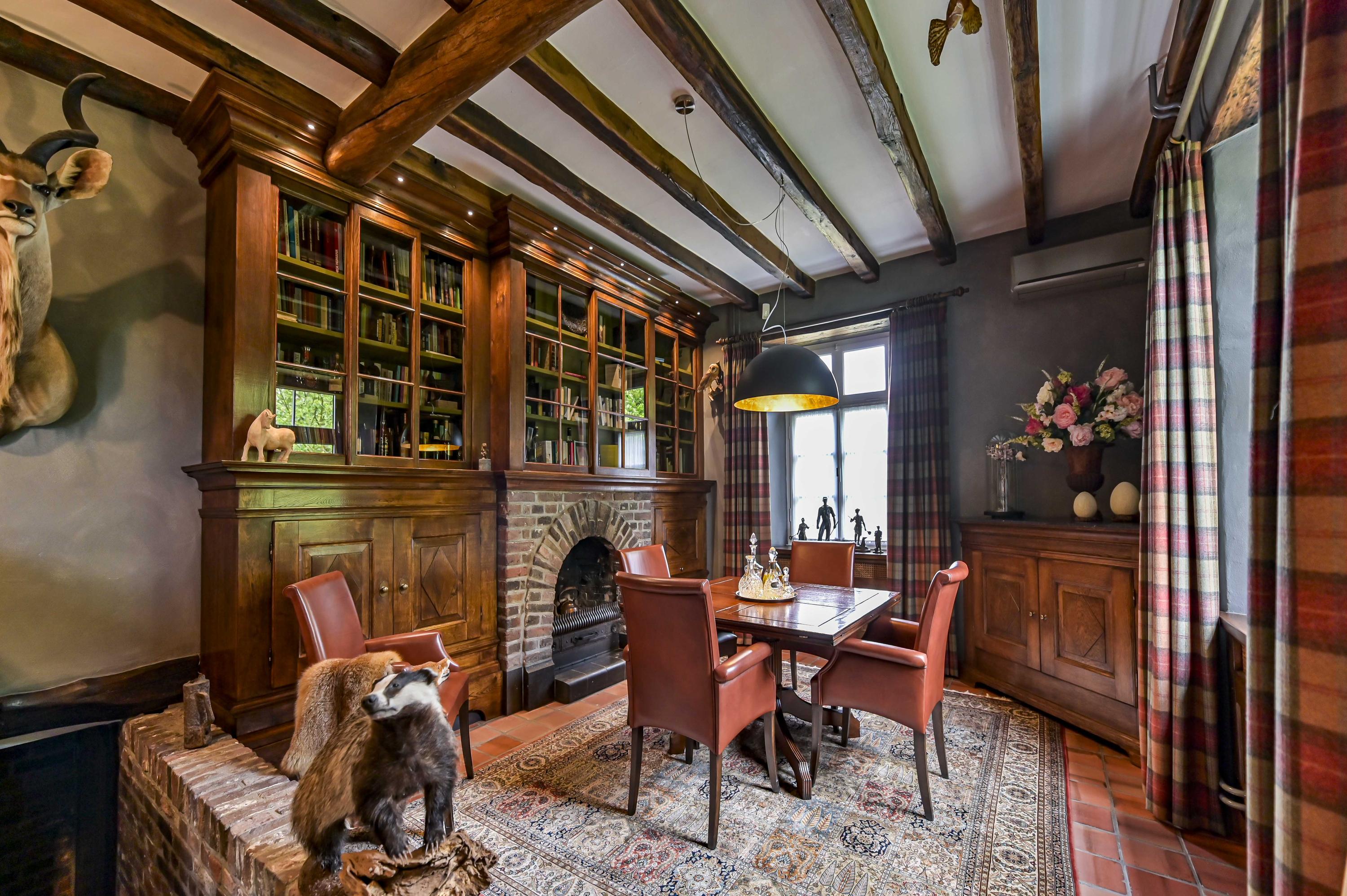 Prachtige, royale woonkamer (ca. 81m²) met ramen rondom die zorgen voor overal een natuurlijke lichtinval. Er zijn een zeer grote open haard/schouw aanwezig en een unieke houten bar. Openslaande deuren bieden toegang tot de binnentuin en een serre.