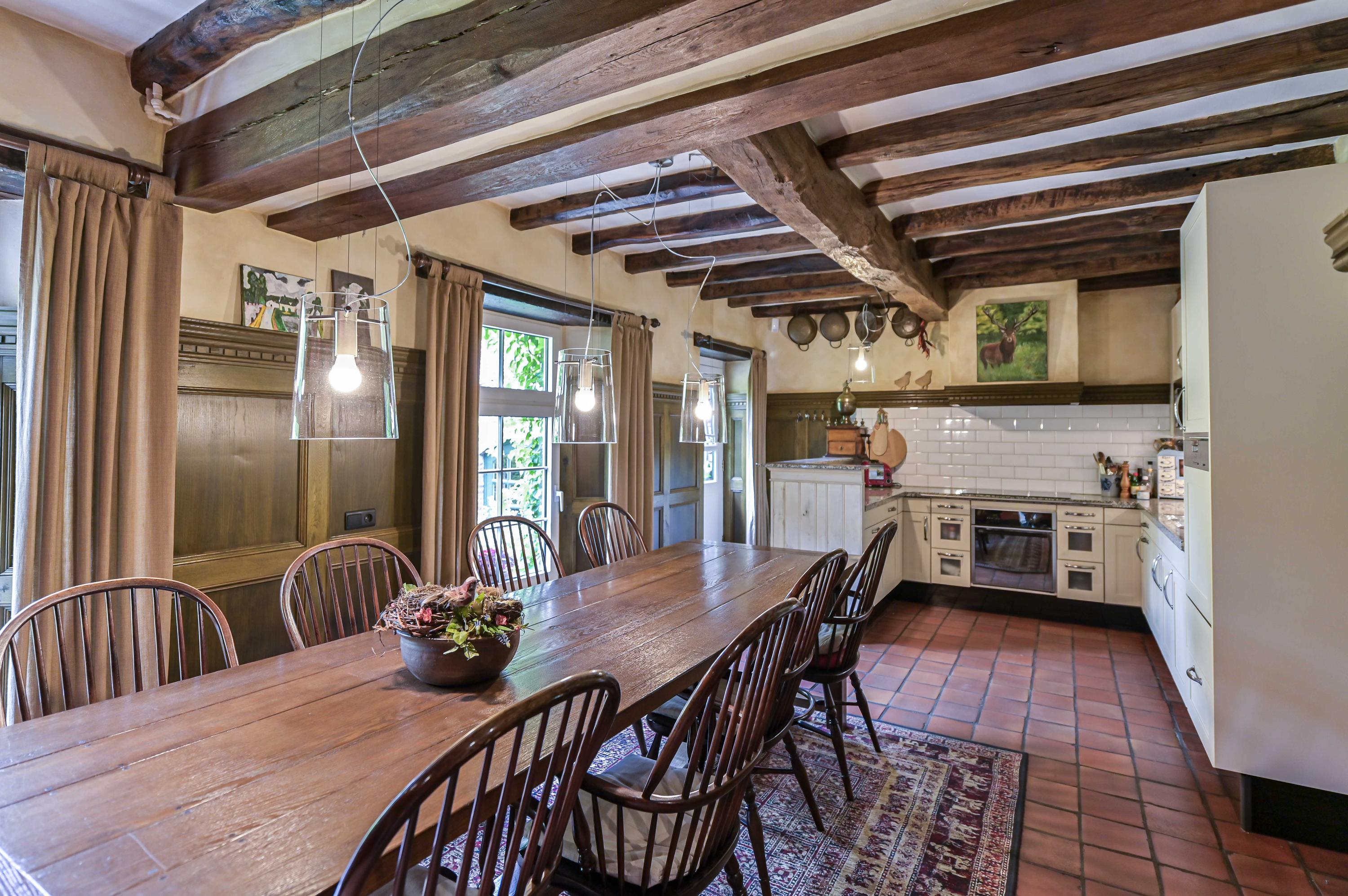 In de keuken (ca. 30m²) zijn diverse vaste kasten aanwezig en geniet u nog van unieke details. Vanuit hier is er direct contact met de binnentuin. De complete inrichting is afgewerkt met een granieten blad. Vanuit hier bieden dubbele deuren toegang tot de tussenhal. De vroegere eetkamer (ca. 26m²) biedt door middel van een doorgang toegang tot de woonkamer.