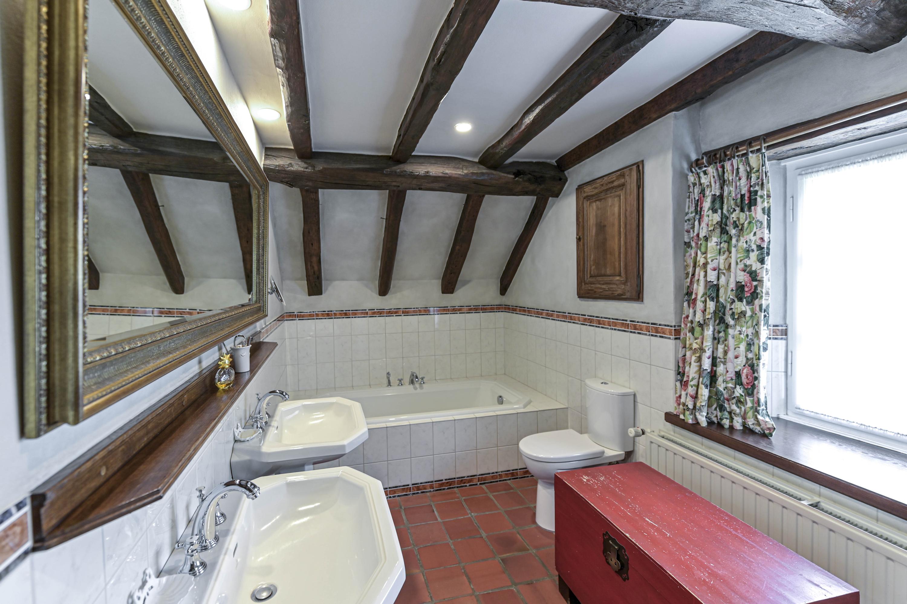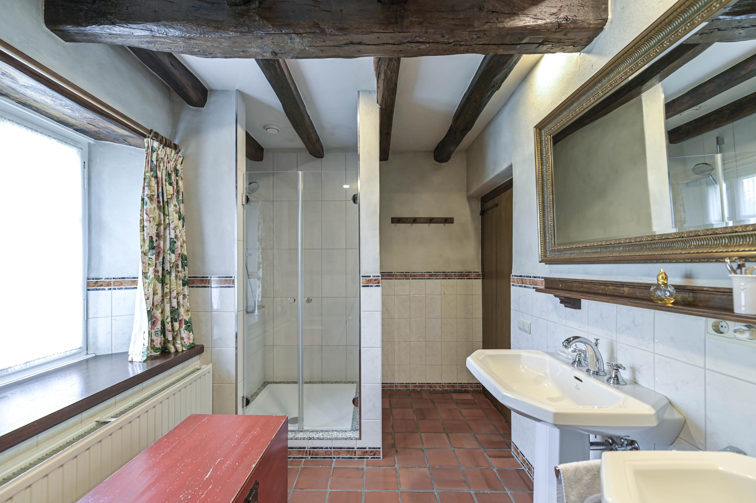 De badkamer (ca. 11m²) heeft een mooie groot ligbad, een royale inloopdouche, 2 wastafels, een toilet, bergruimte, een raam t.b.v. daglicht en mechanische ventilatie.