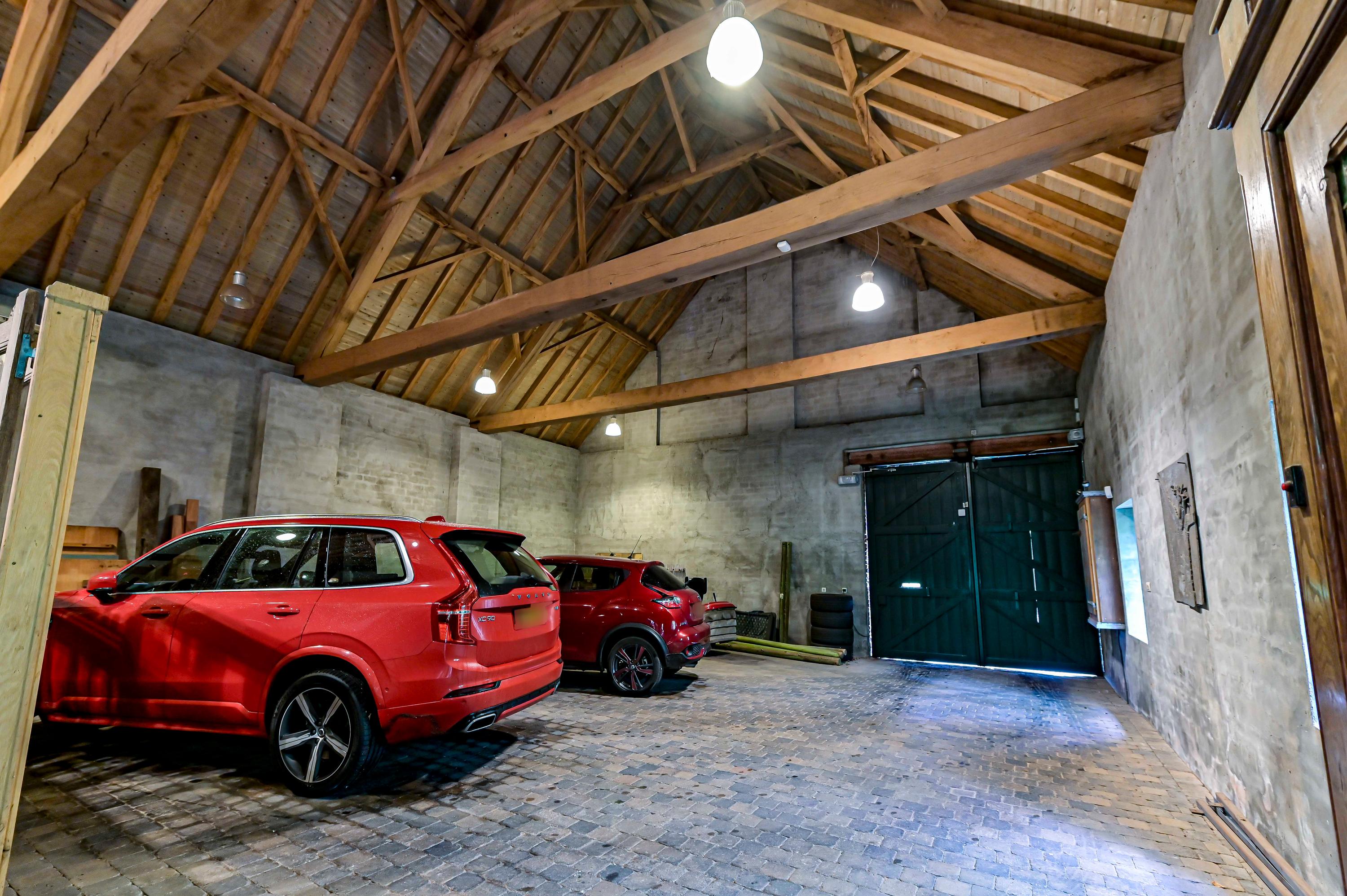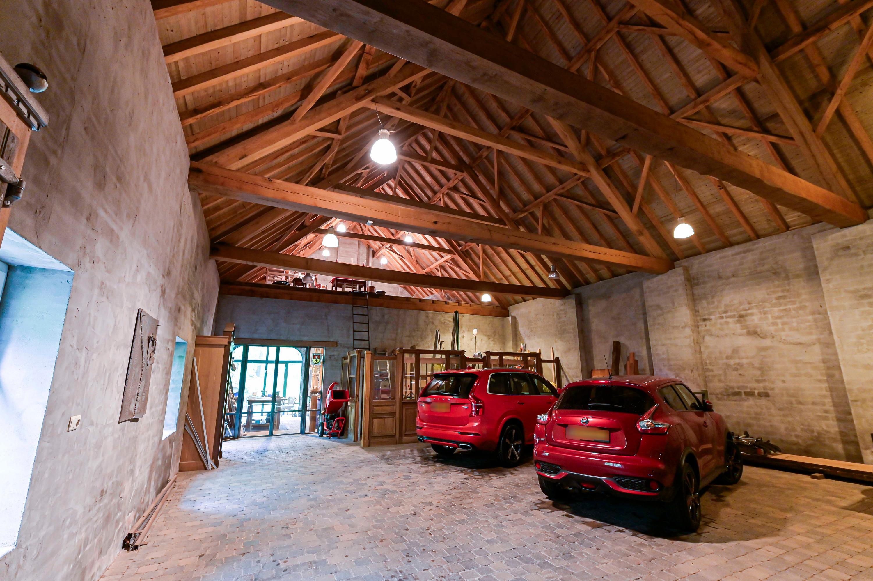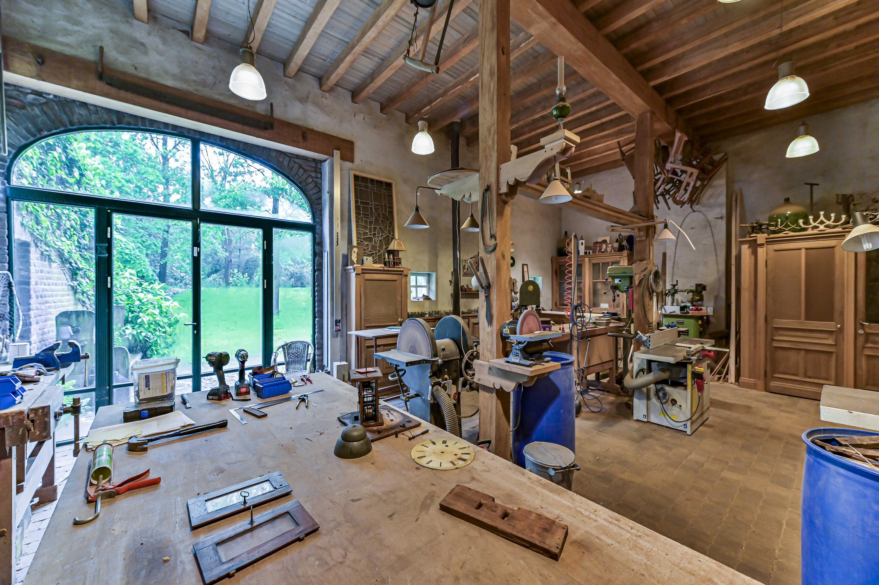 Deze zeer riante en hoge garage is tot in de puntjes afgewerkt. Een grote elektrische houten poort biedt toegang tot de oprit. Daarnaast is er een royale vliering aanwezig en bieden glazen deuren toegang tot de werkplaats met apparatuur.