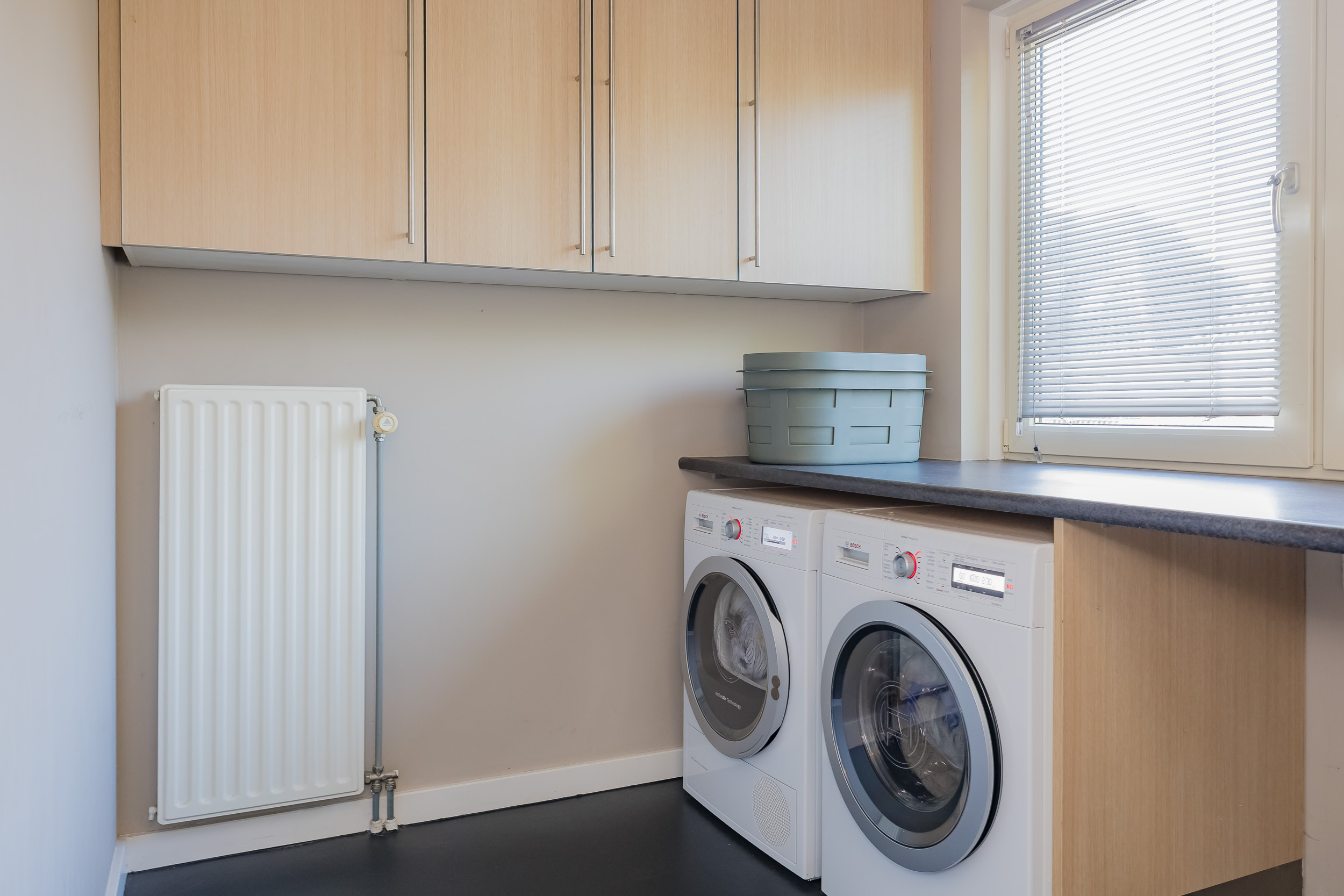 Naast de keuken ligt de praktische bijkeuken die is voorzien van een keukenblok met spoelbak en hier zijn ook de aansluitingen voor de wasmachine en droger. Van hieruit is er toegang tot de garage en het vlonderterras met aanlegplaats. Via een vaste trap bereik je de ruime, droge kelder (2,29 m hoog!), ideaal als extra opslagruimte of wijnkelder.