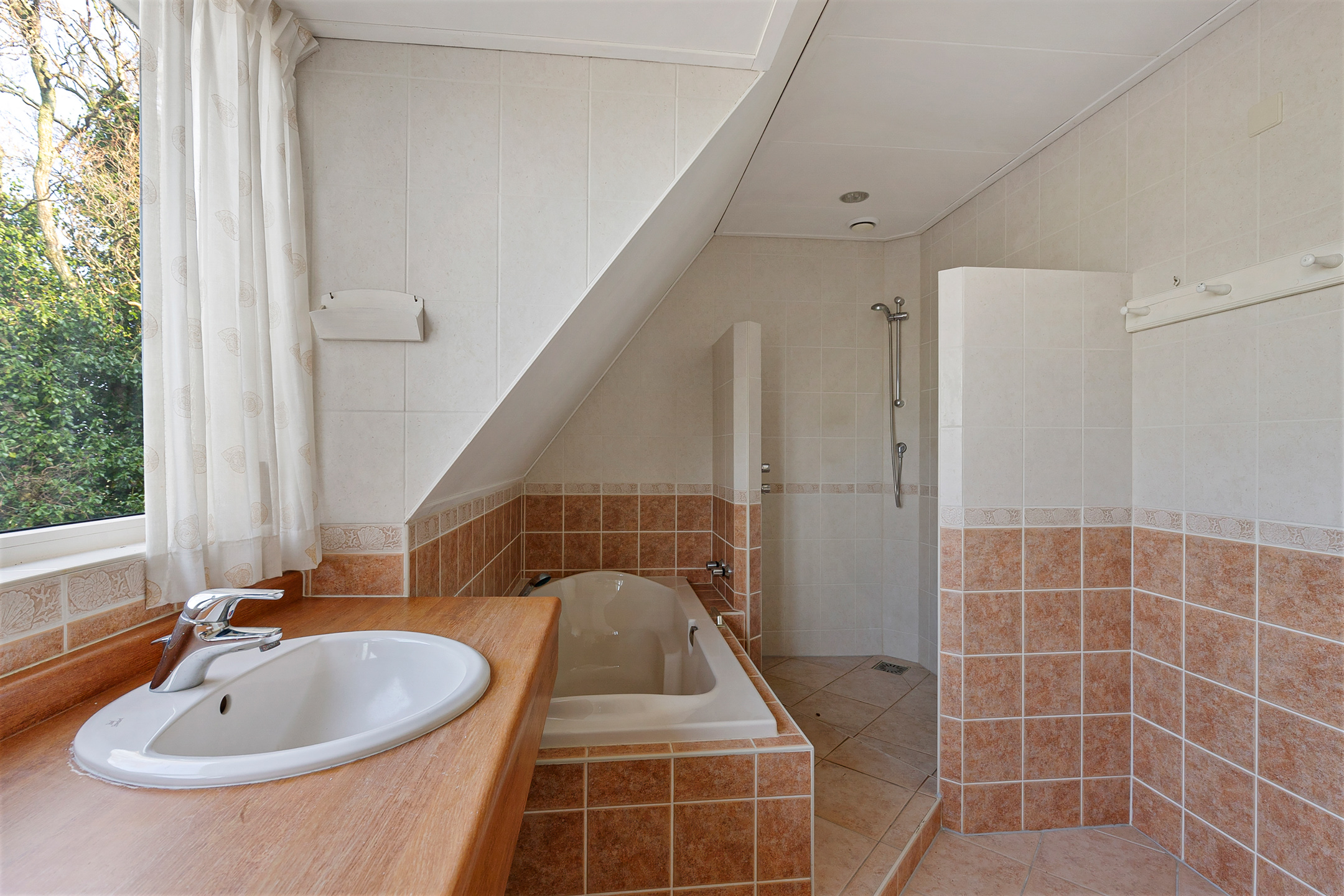De ruime woonkeuken is voorzien van inbouwapparatuur en een sfeervolle erker met uitzicht over de tuin en weilanden. Verder vindt u op de begane grond een bijkeuken, een royale slaapkamer met tuindeuren, een badkamer met toilet, wastafel en douche, alsmede toegang tot de inpandige garage.
