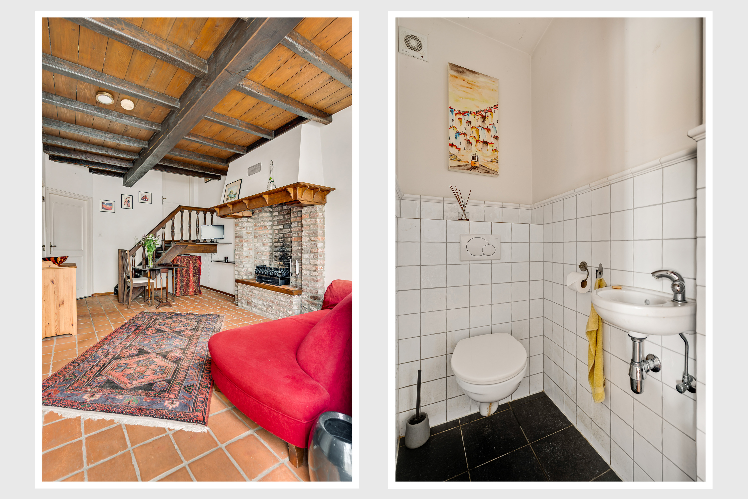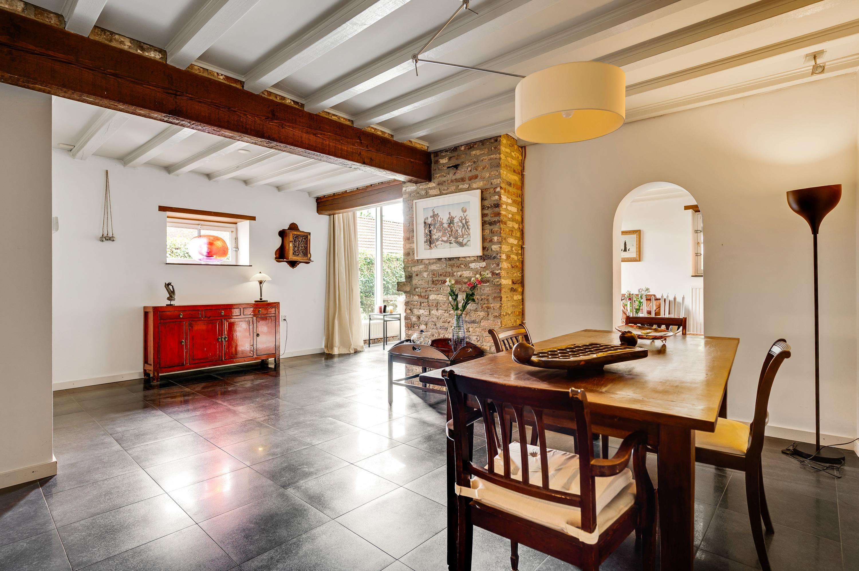 De ruime en lichte woonkamer (± 56 m²) biedt optimaal tuincontact dankzij de grote raampartijen aan de zijkant en dubbele openslaande deuren aan de achterzijde. De woonkamer is verdeeld in een gezellige zithoek met open haard en een apart eetgedeelte, ideaal voor diners met familie en vrienden. De moderne vloertegels en strakke stucwanden geven de ruimte een tijdloze uitstraling.