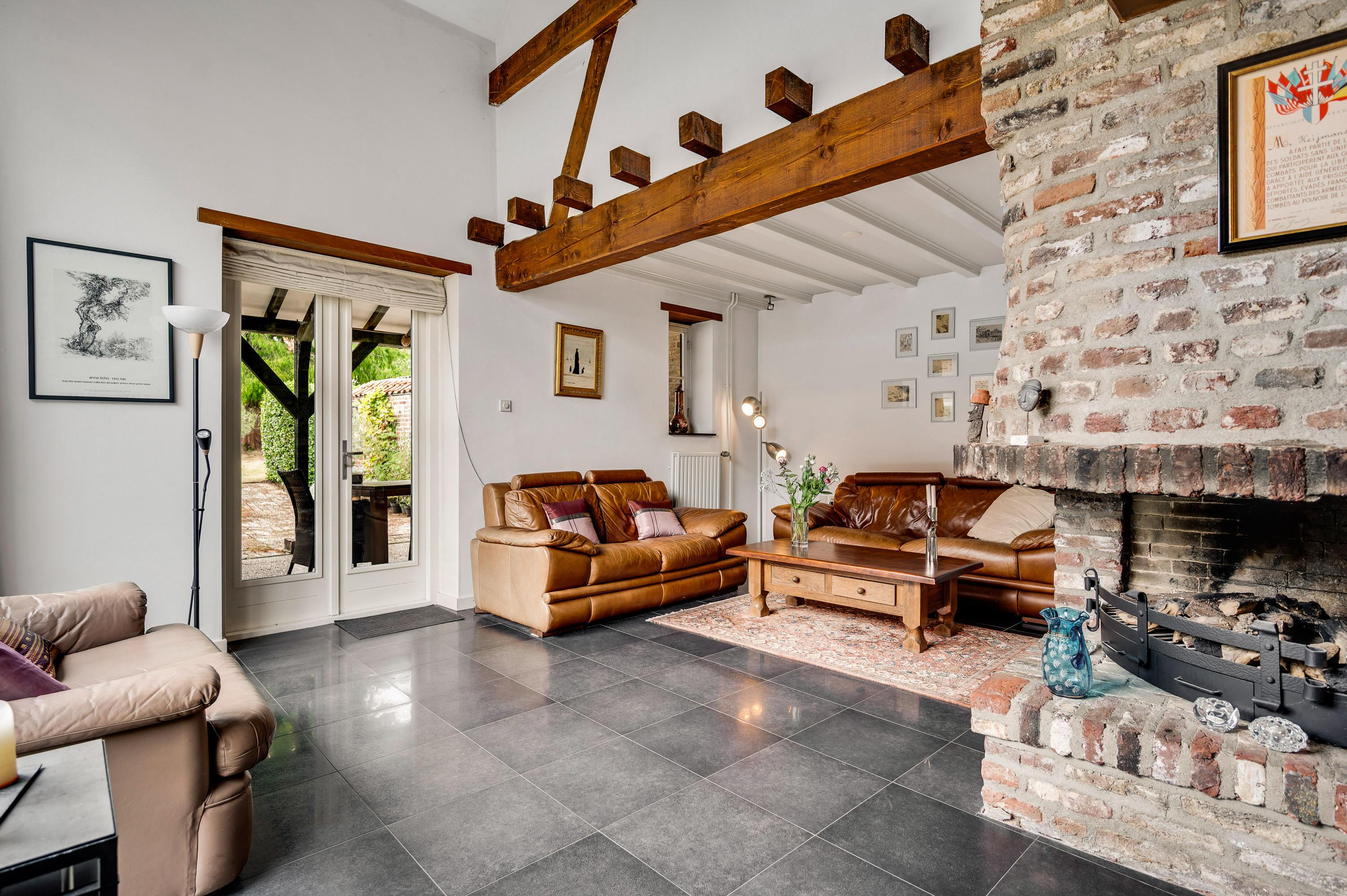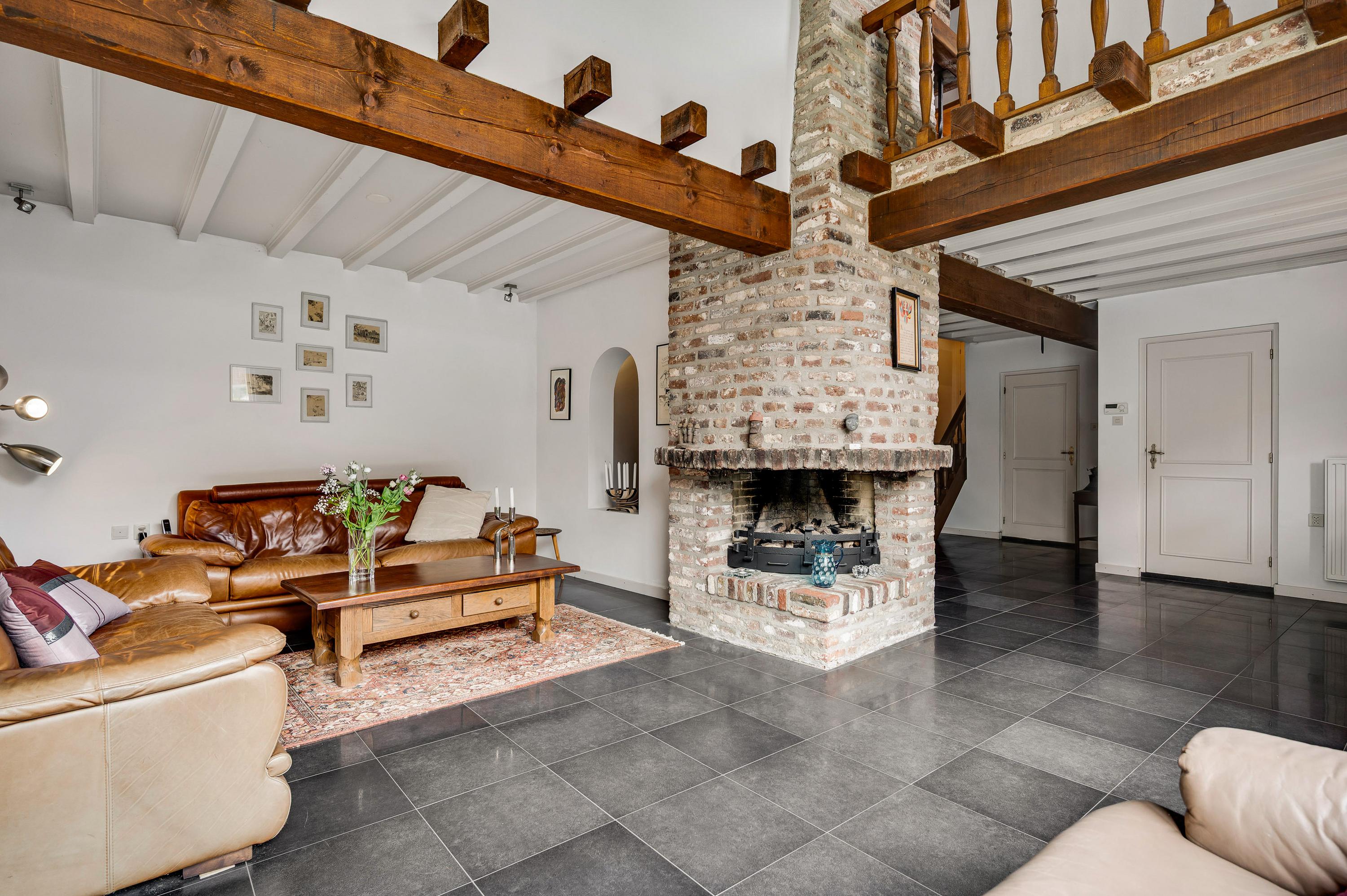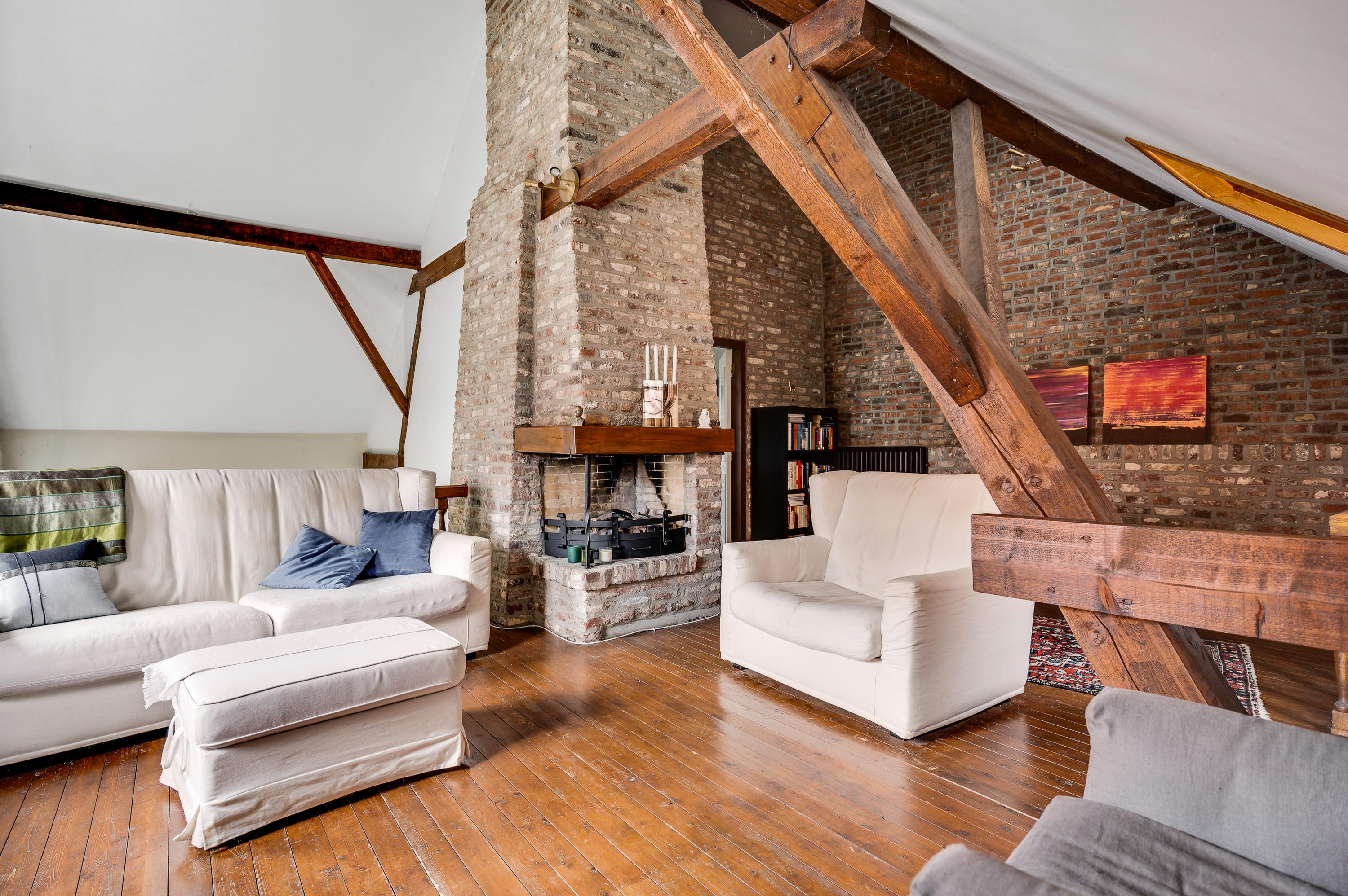 Gezellige zitkamer/verblijfsruimte (± 34 m²) met plankenvloer en open haard, een heerlijke plek om te ontspannen.