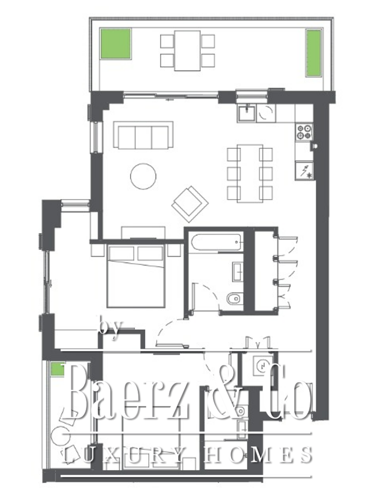 Het interieur is afgewerkt met een volledig uitgeruste keuken en badkamers, afgewerkte vloeren, betegeling en airconditioning. Het appartement wordt ongemeubileerd aangeboden en vormt daarmee een flexibel canvas voor persoonlijke invulling. Zowel lange als korte termijn verhuur wordt mogelijk gemaakt door de ligging en heldere architectuur.